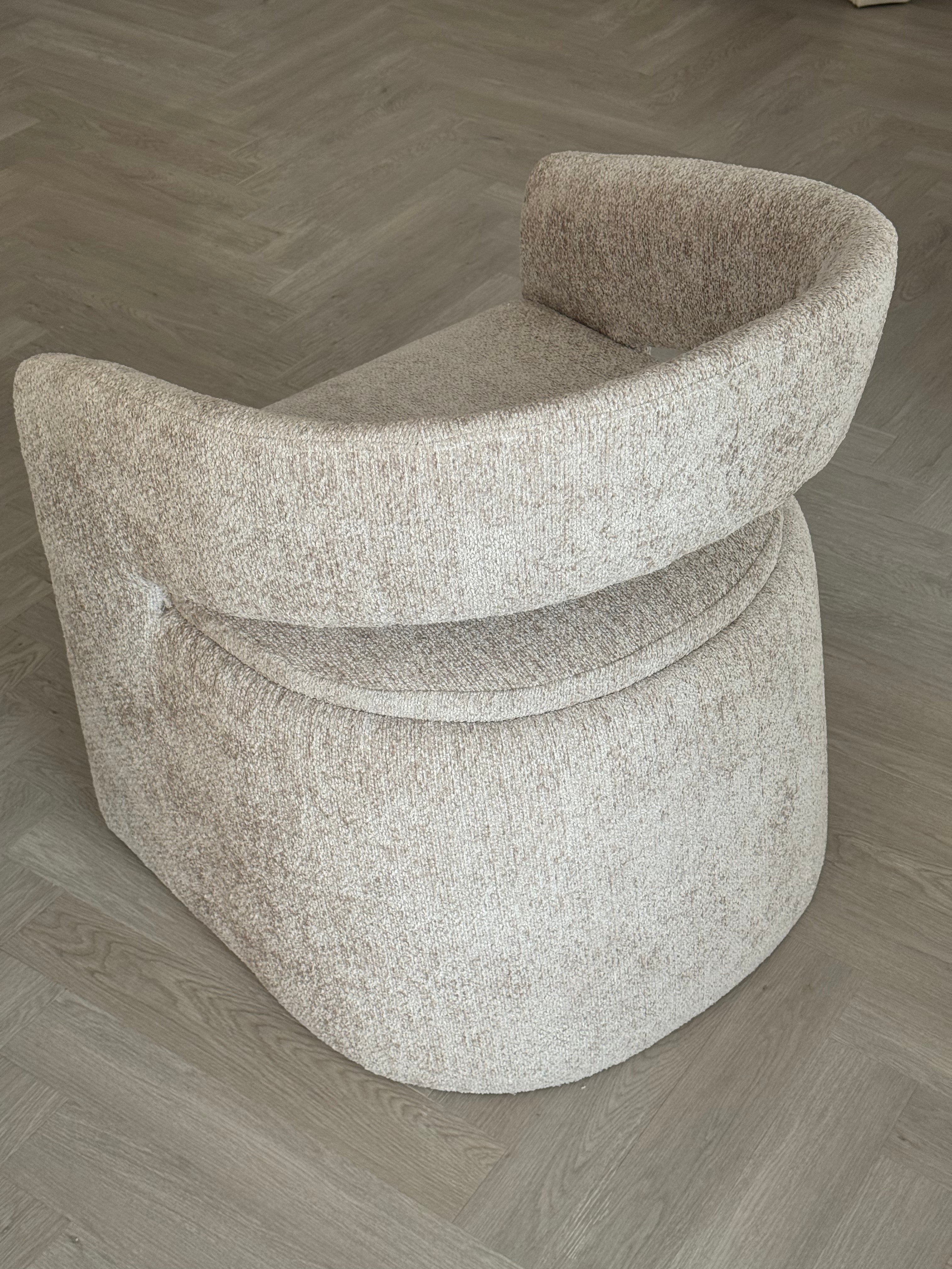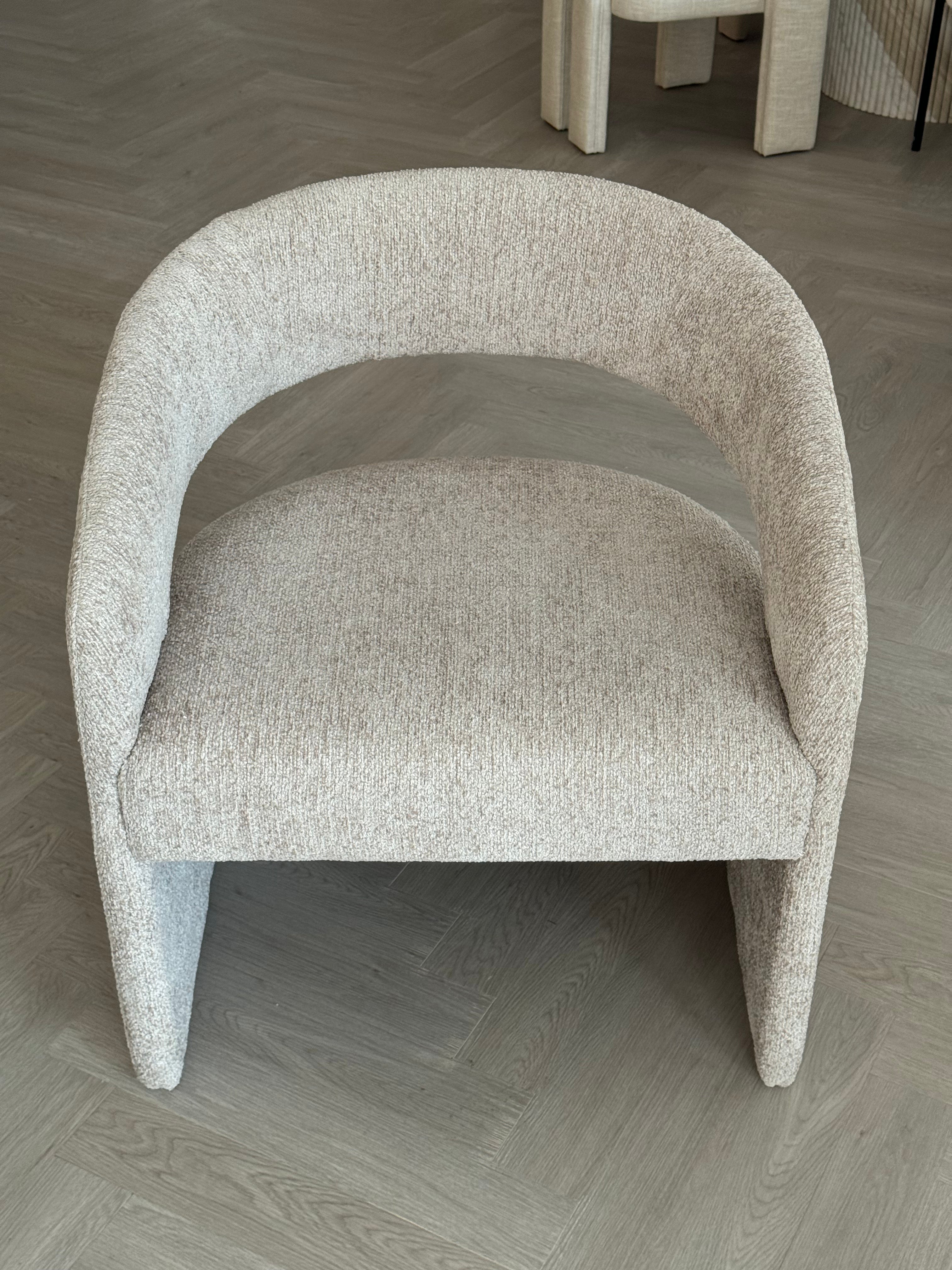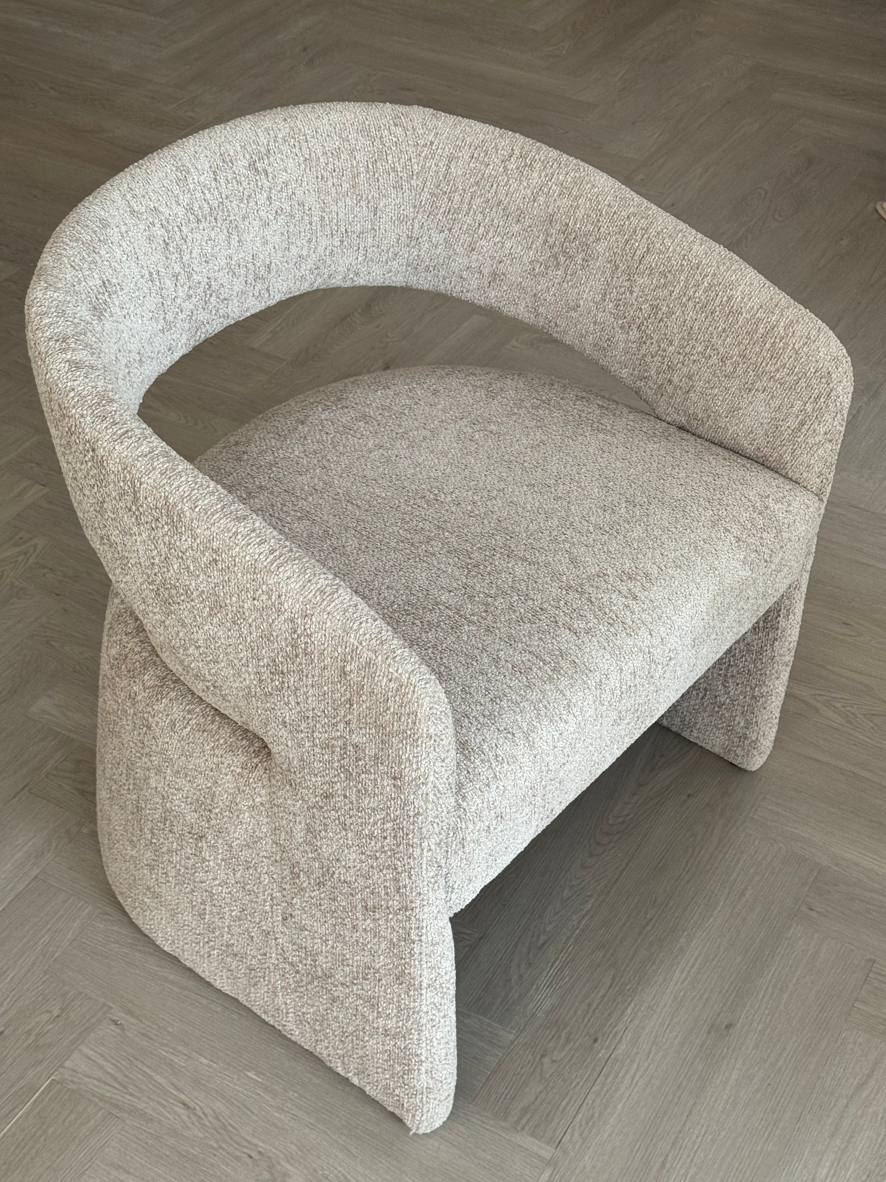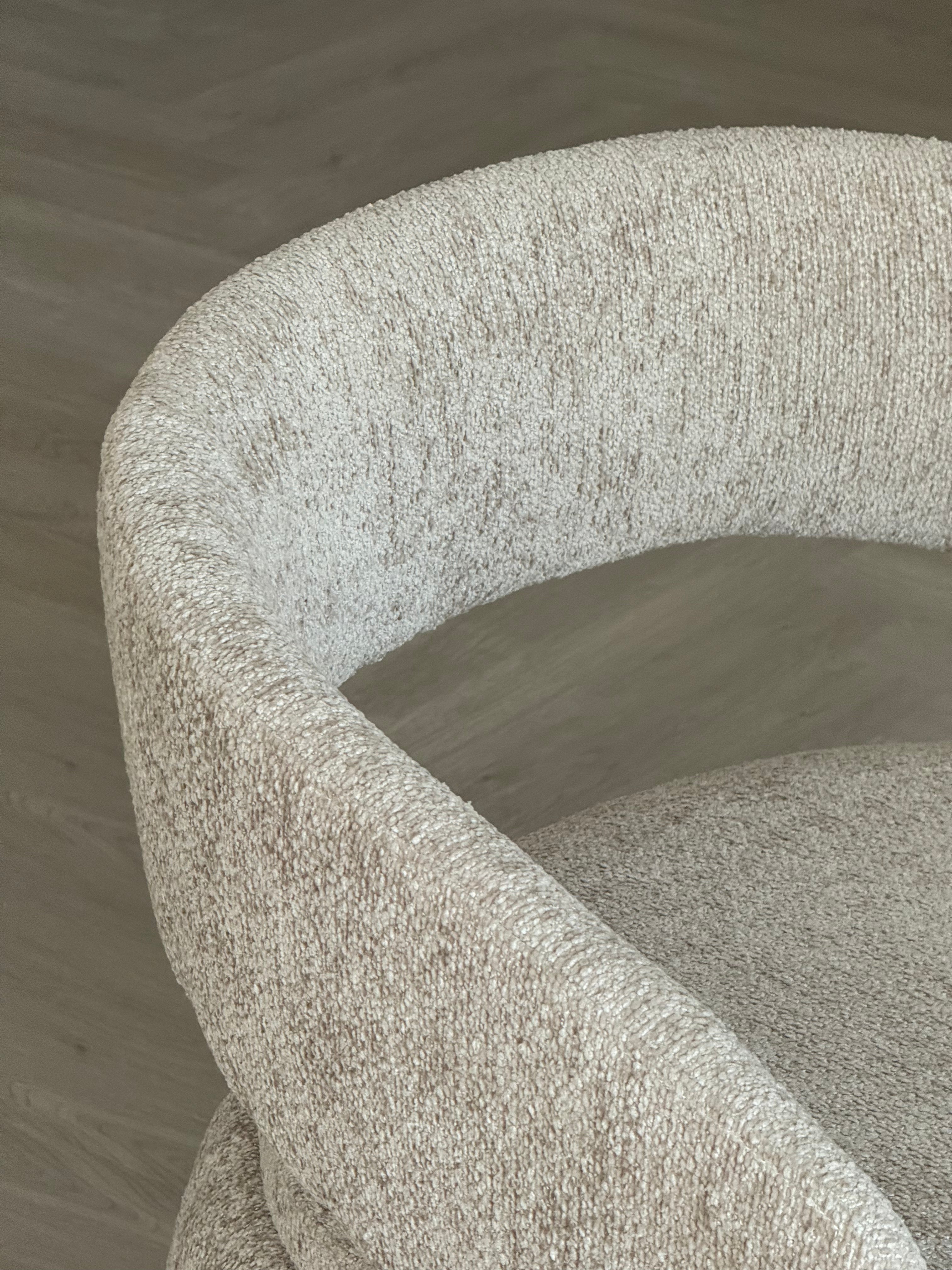 Upholstered in soft beige boucle fabric, the chair’s rich texture and neutral tone enhance its versatility, effortlessly complementing various interior styles. The rounded back adds an extra layer of comfort, making the Adam Chair a perfect blend of style and practicality.