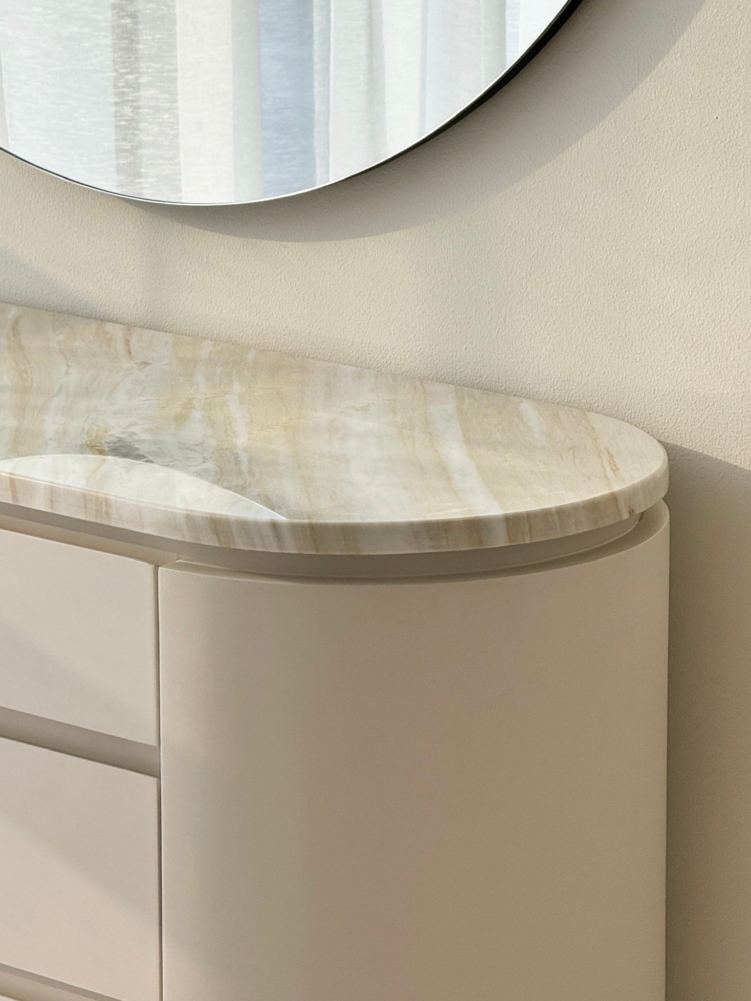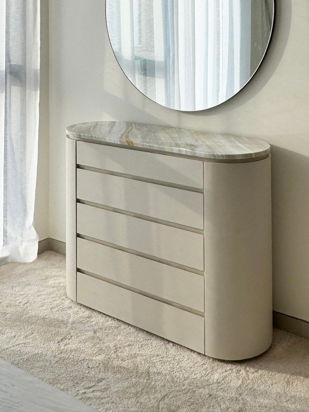 The Alena Ajax Gold Marble Chest of Drawers seamlessly blends elegance with contemporary design. Featuring rounded ends on either side, this piece boasts a semi-circular, crescent-like shape that softens its overall appearance. The luxurious Ajax Gold Marble top adds a touch of sophistication, making it a visually striking and refined addition to any space.