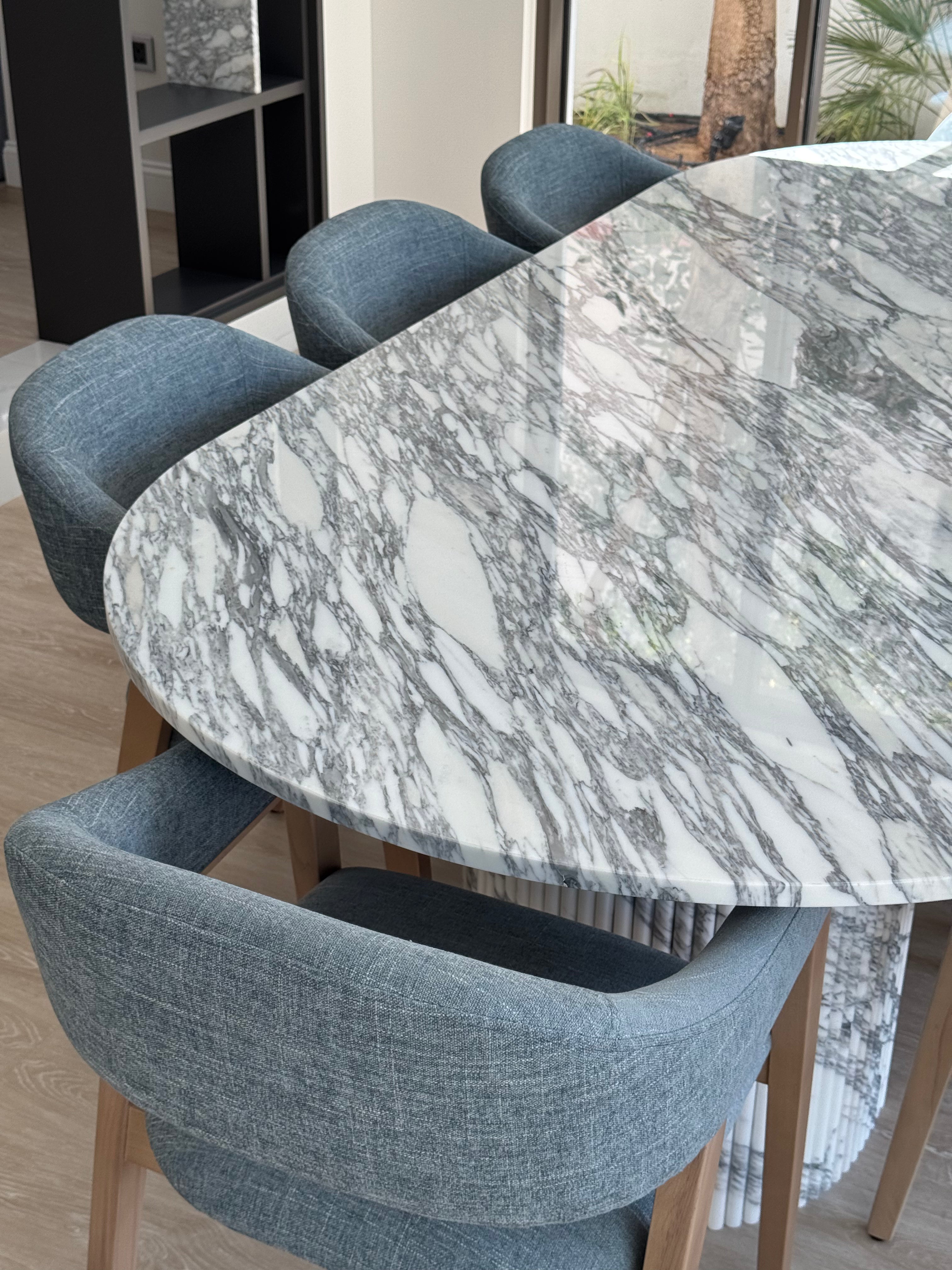 Designed to impress, Maysa Dining Arabesto Marble Table effortlessly blends luxury and functionality. Featuring a sleek, elongated silhouette with softly rounded edges, its polished marble surface showcases intricate natural veining, making each piece one-of-a-kind. The striking gray and white patterns add depth and movement, creating a sophisticated statement in any dining space.