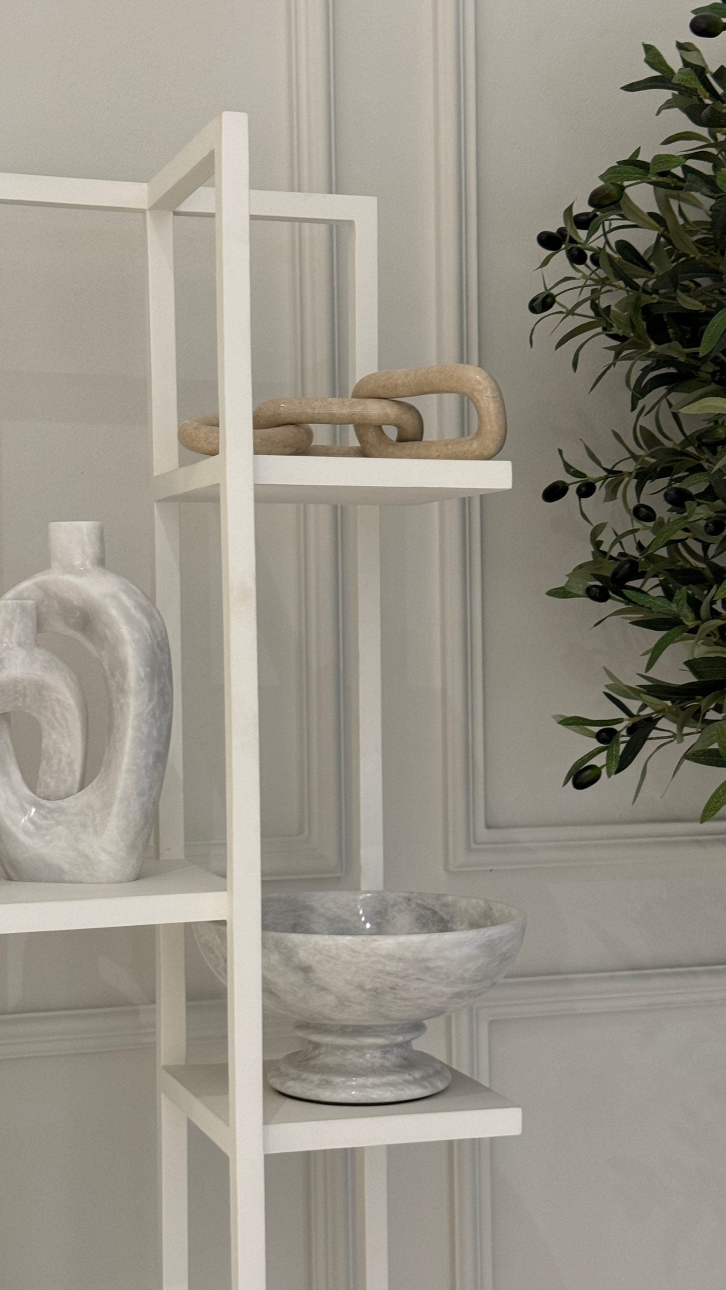 The sophisticated Angelica White Marble Interlocked Decor bring a touch of luxury and modern art to any space, showcasing the natural beauty of white marble in a unique interlocking design. Each piece is meticulously crafted from white marble, showcasing the intricate veining and natural variations that make each set unique. The two pieces fit together seamlessly, this distinctive design adds a dynamic and artistic touch to your space.
