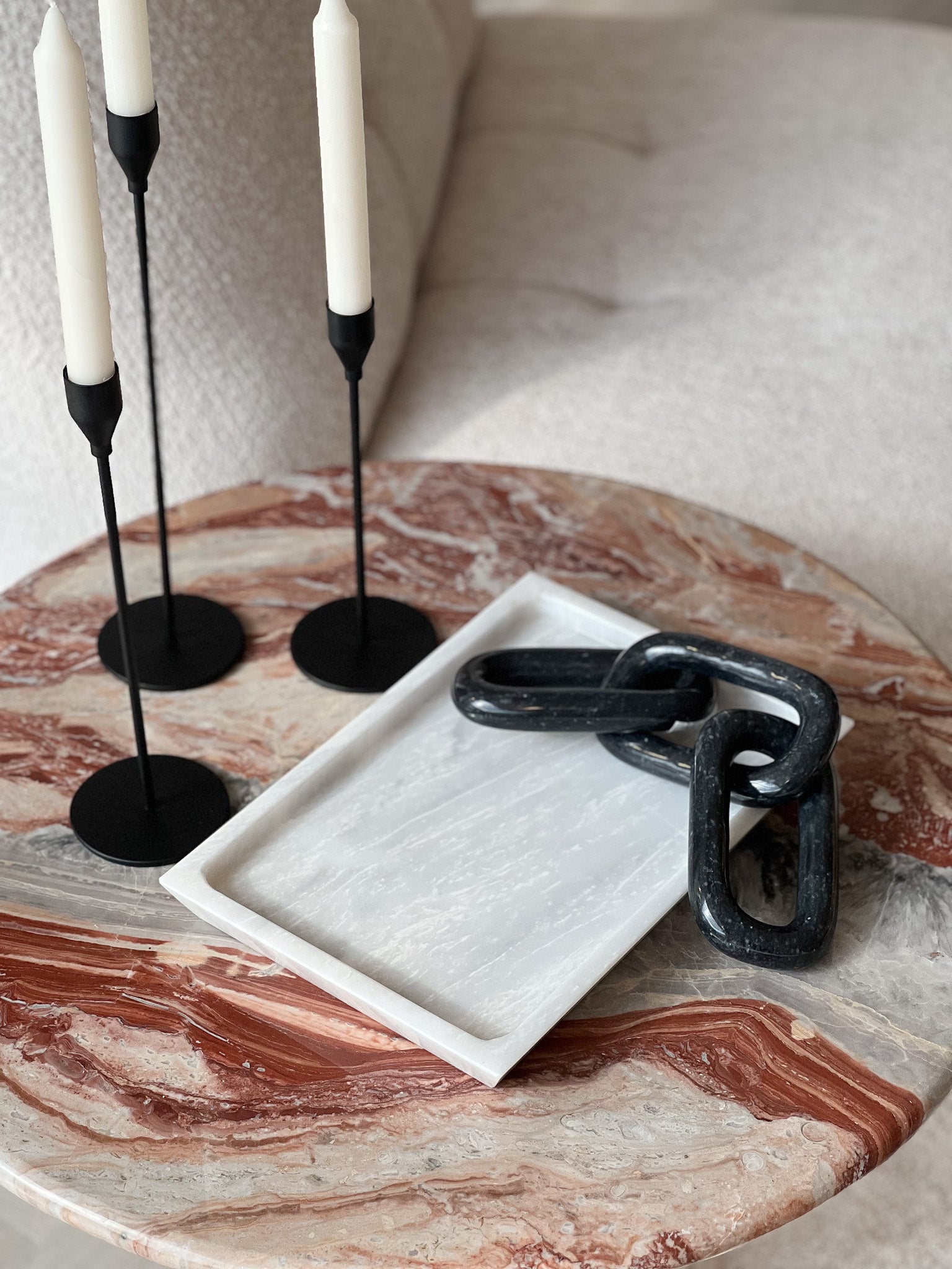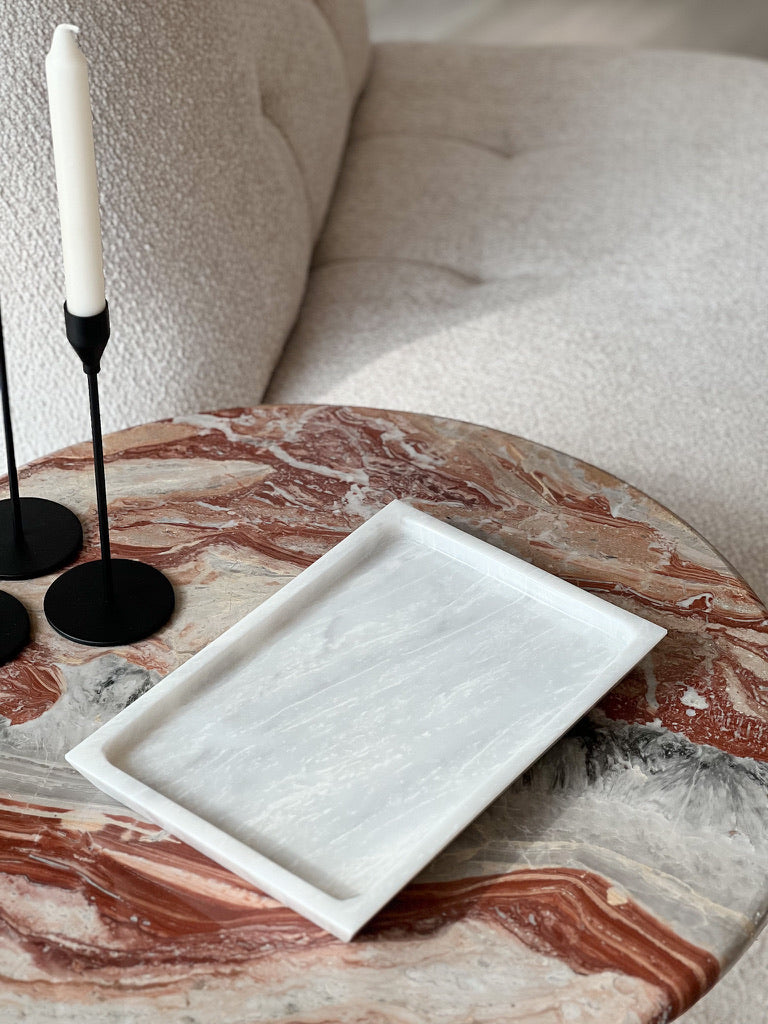 Elevate your everyday routine with our elegant Angelica Rectangle White Marble Tray, a perfect blend of luxury and functionality. This exquisite tray is designed to keep your cherished pieces organized while adding a touch of sophistication to your vanity or bedside table