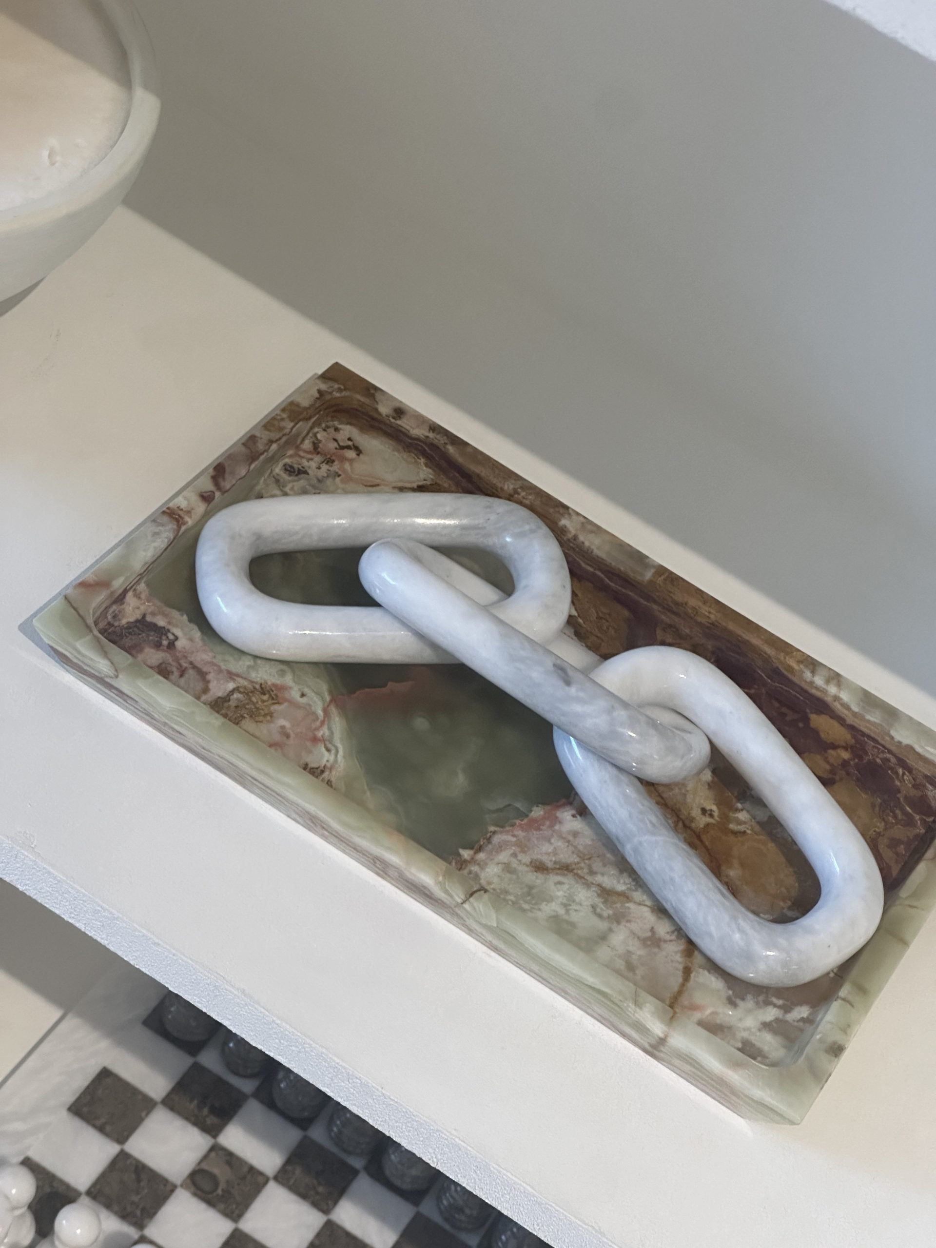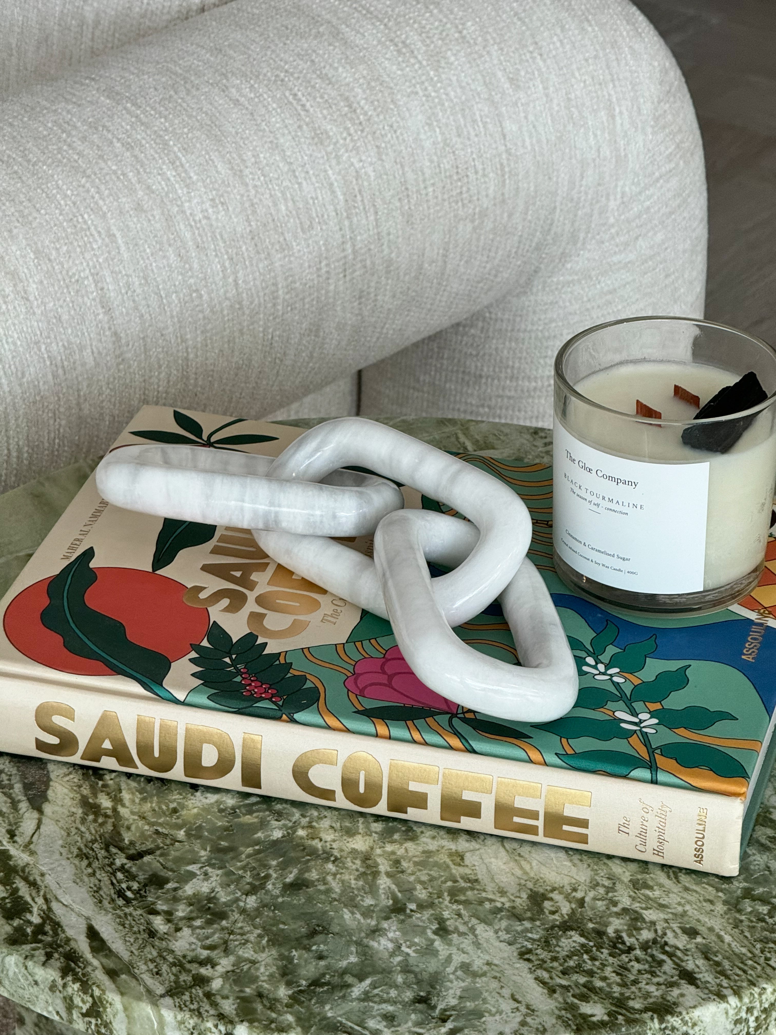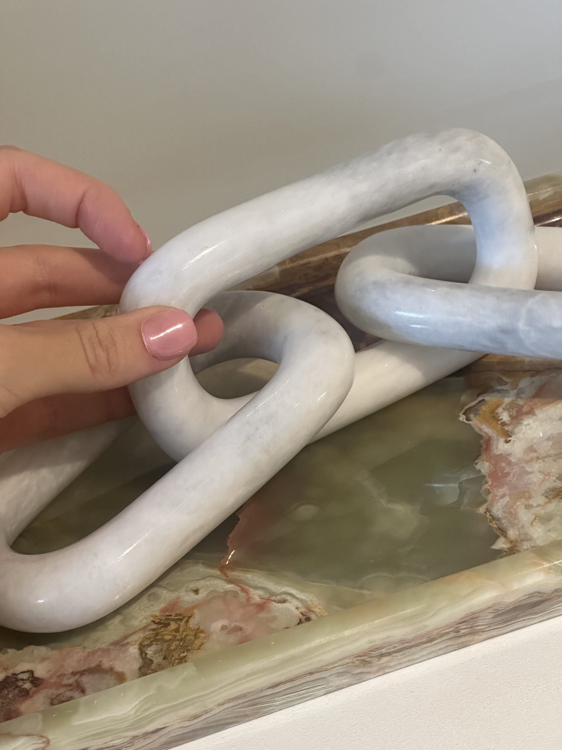 Elevate your home decor with the timeless elegance of our Angelica White Marble Chain. This stunning piece, meticulously handcrafted from marble, combines elegance and modern design, making it a perfect addition to any room. Each link in the chain is polished to perfection, highlighting the natural veining and unique patterns of the marble, ensuring that no two pieces are exactly alike.