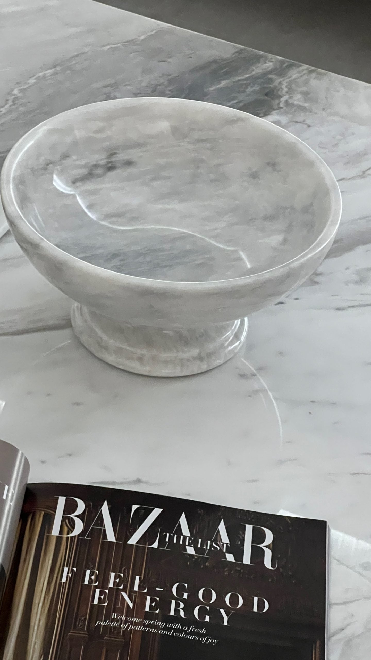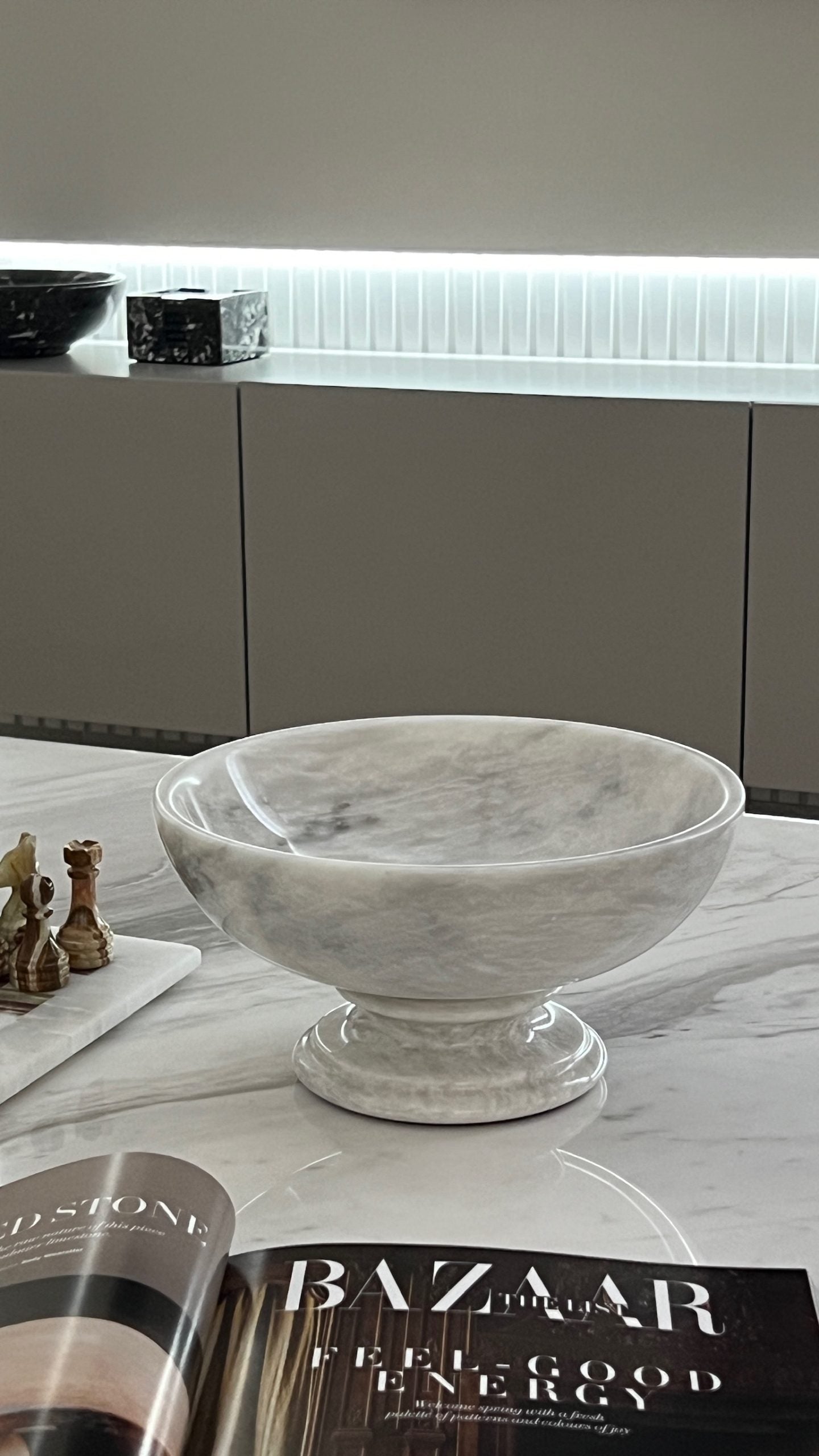 Introducing the classic Angelica White Marble Fruit Bowl with stand, an exquisite blend of natural beauty and functional elegance. This luxurious fruit bowl is designed to be a stunning centerpiece in any kitchen or dining area, enhancing your home with its sophisticated charm. Serving not just fruits but also timeless beauty as it embody luxury and style that is to be cherished for generations.