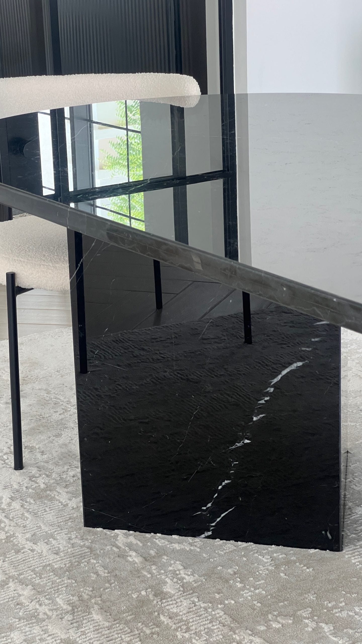 The Audrey Black Marquina Marble Dining Table crafted from luxurious Black Marquina marble. This stunning piece seamlessly combines elegance and modernity, making it the perfect centerpiece for any sophisticated dining space. The marble's dramatic veining and deep black color create a bold statement piece, complementing a variety of interior styles, from contemporary to classic.
