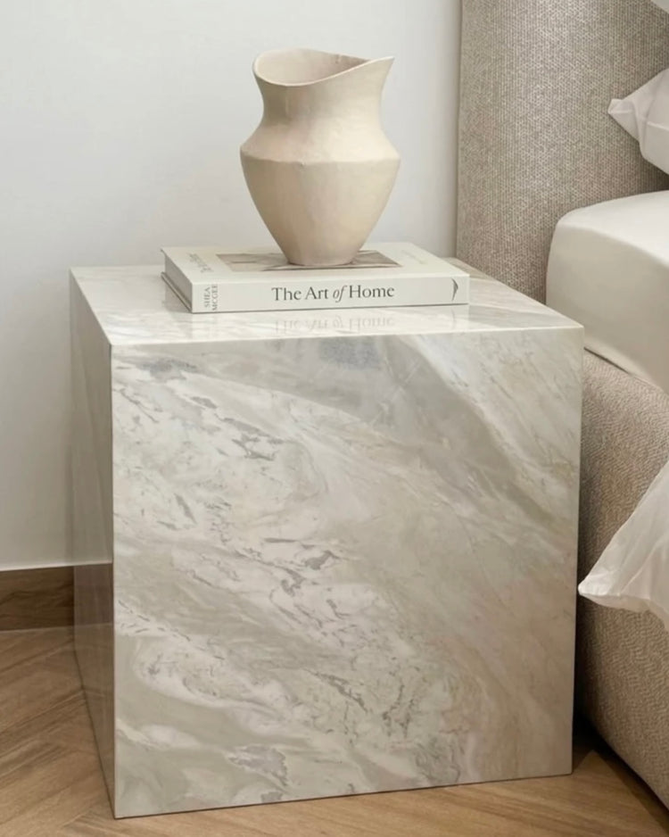 The Rea Side Table accented by rich golden tones and intricate veining variety of marble selection. Each marble block is unique, ensuring that each of your side table is a one-of-a-kind masterpiece. It features a simple yet striking block design with clean lines and a solid form that creates a bold statement, making it a versatile piece that complements both contemporary and traditional interiors.