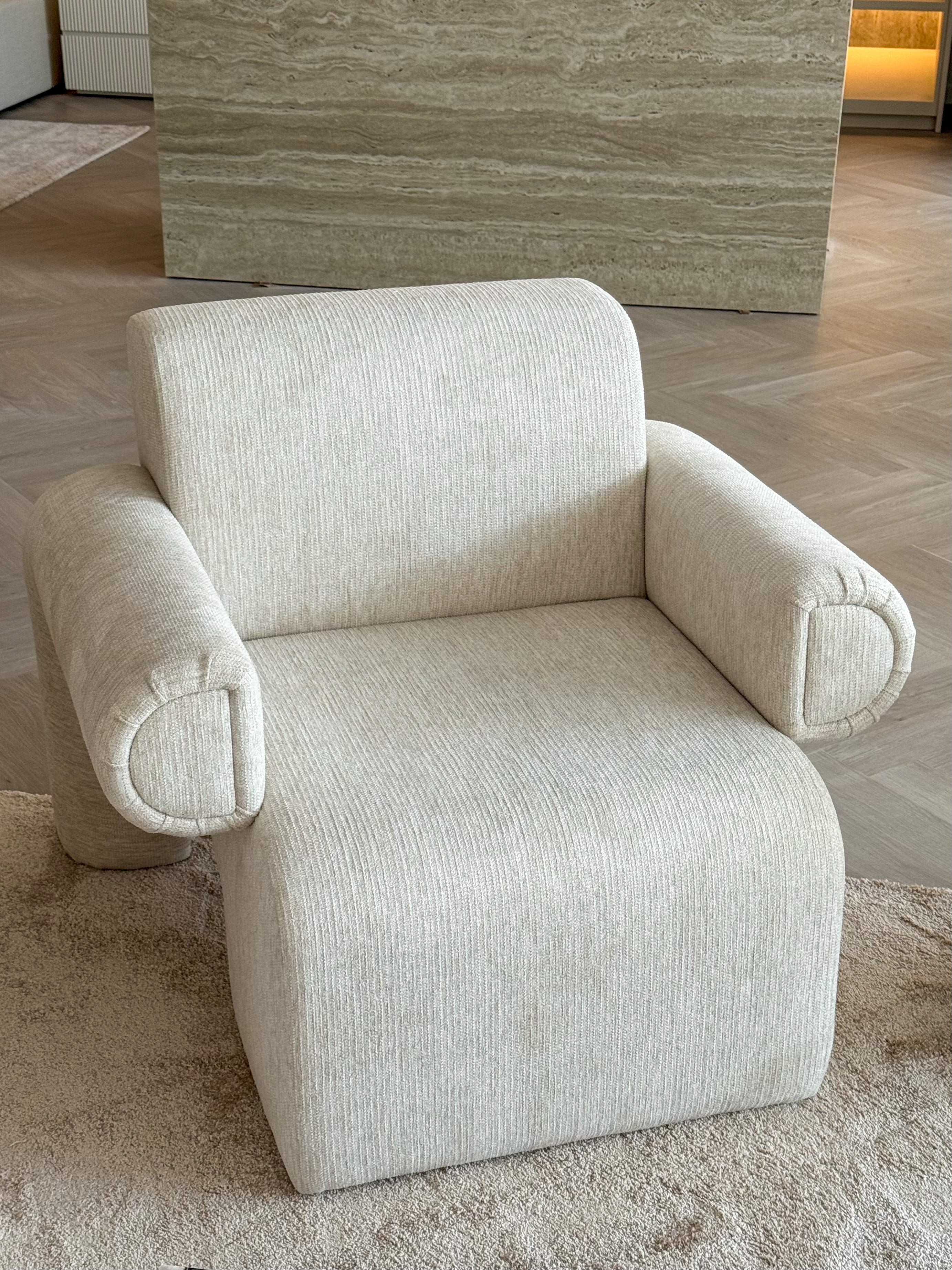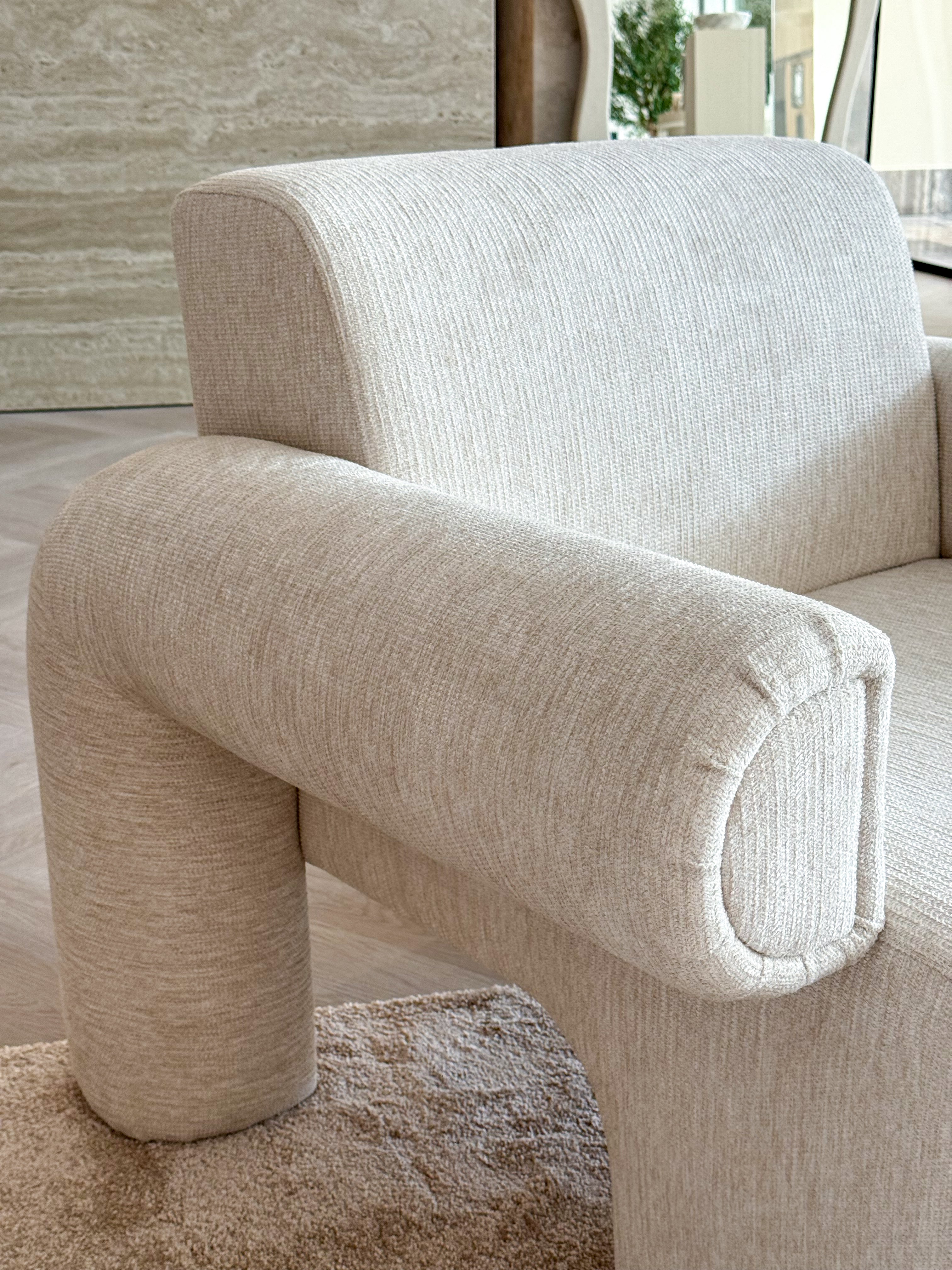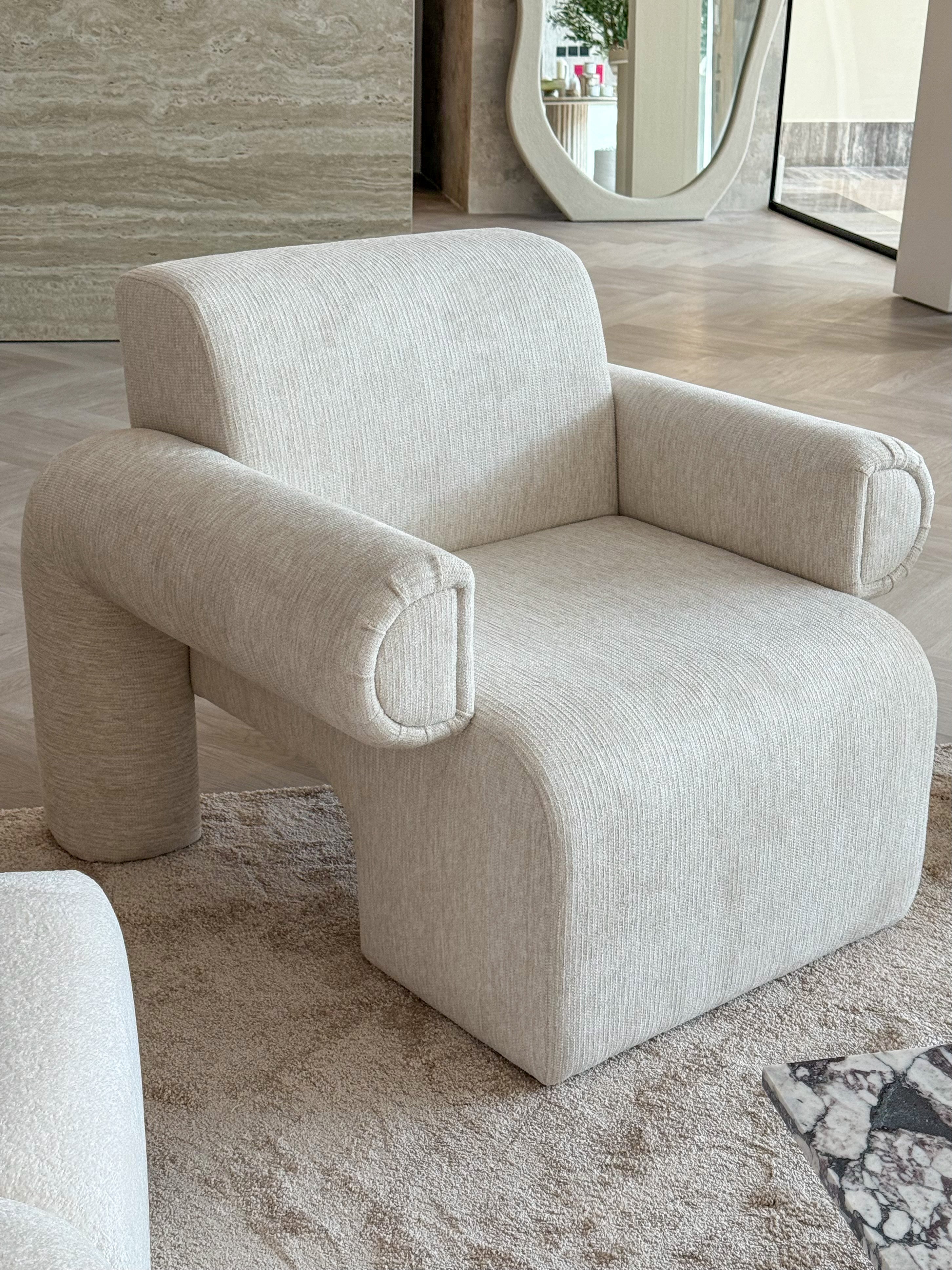 Made from a gorgeous beige, soft touch material with a unique curved design, our Axel Armchair is the perfect statement piece.