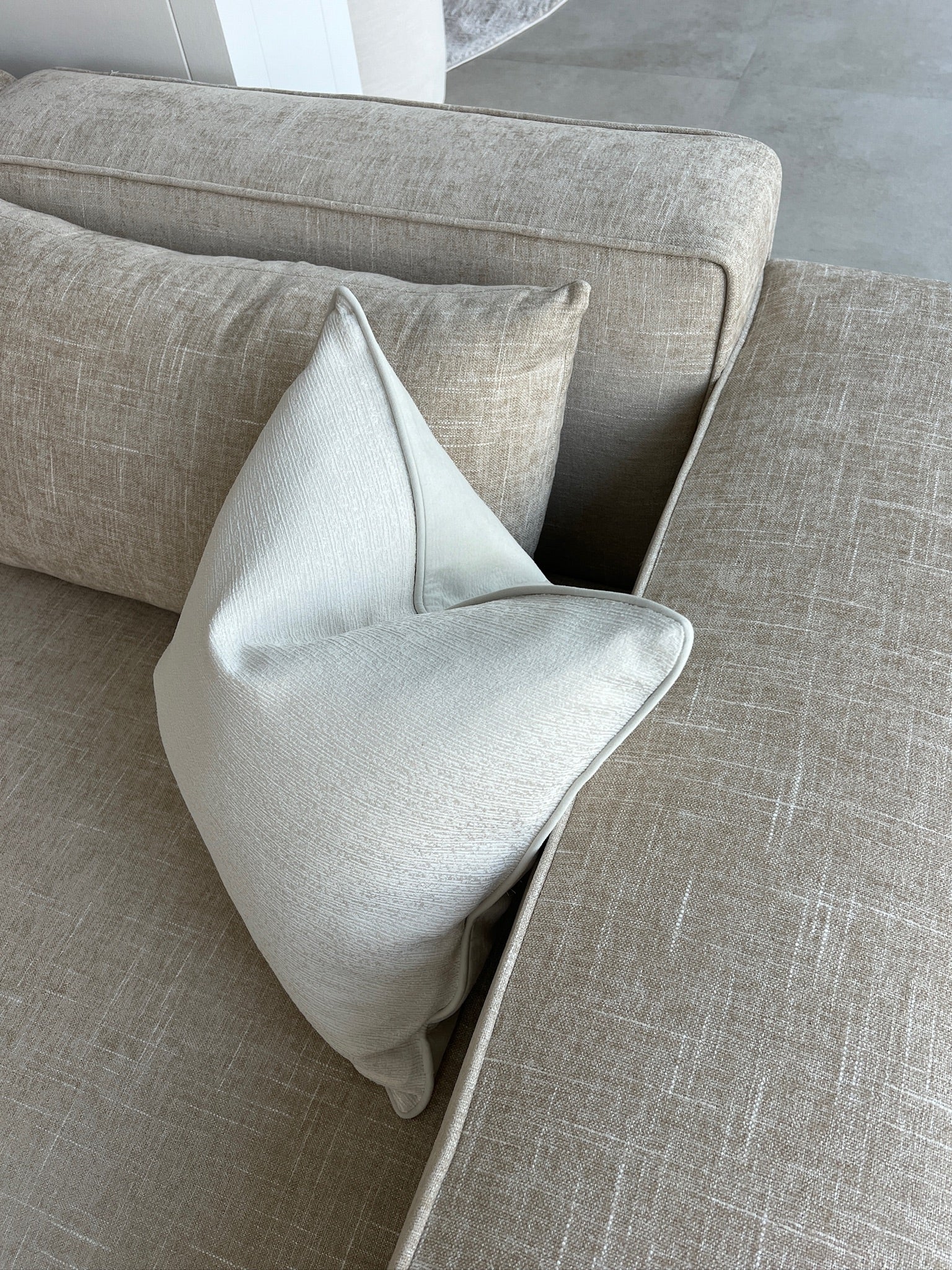 Introducing our Luxury Bailey Corner Sofa, upholstered in a premium cream/beige fabric that exudes effortless elegance. With its simple yet timeless design, this sofa brings a sophisticated touch to any space, blending seamlessly with both modern and classic interiors. The sofa’s supportive frame ensures lasting durability, while the plush cushioning offers comfort for relaxation. It also comes with matching cushions for added style and coziness. Perfectly crafted for those who appreciate both luxury and functionality, this corner sofa is the ideal centerpiece for a refined and inviting living area.
