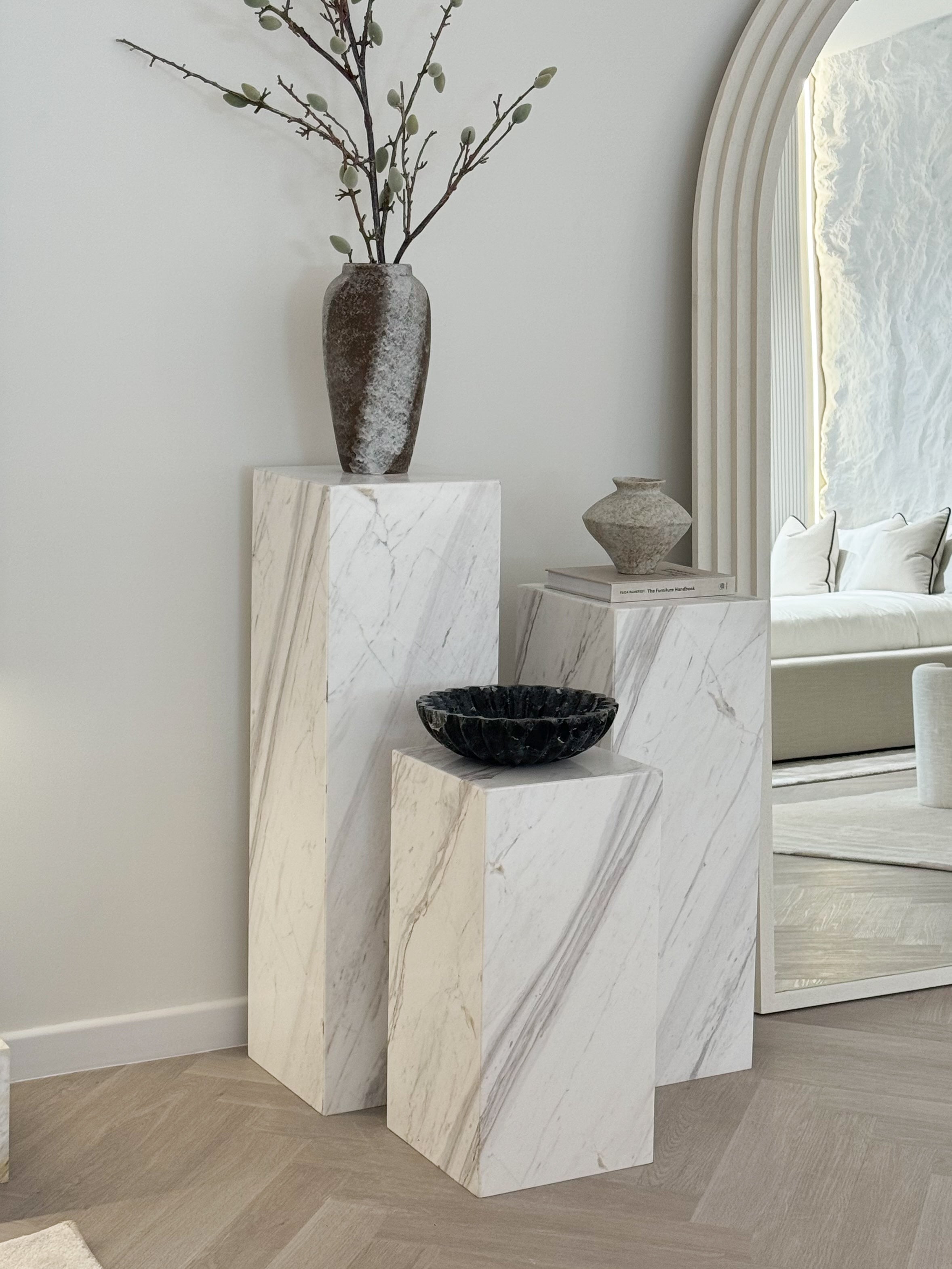 Elevate your space with our Bronte marble plinths, perfect for showcasing your favourite decor pieces. Crafted from Calacatta Greek Grey Marble, this stunning set of three will add a touch of luxury to your space.