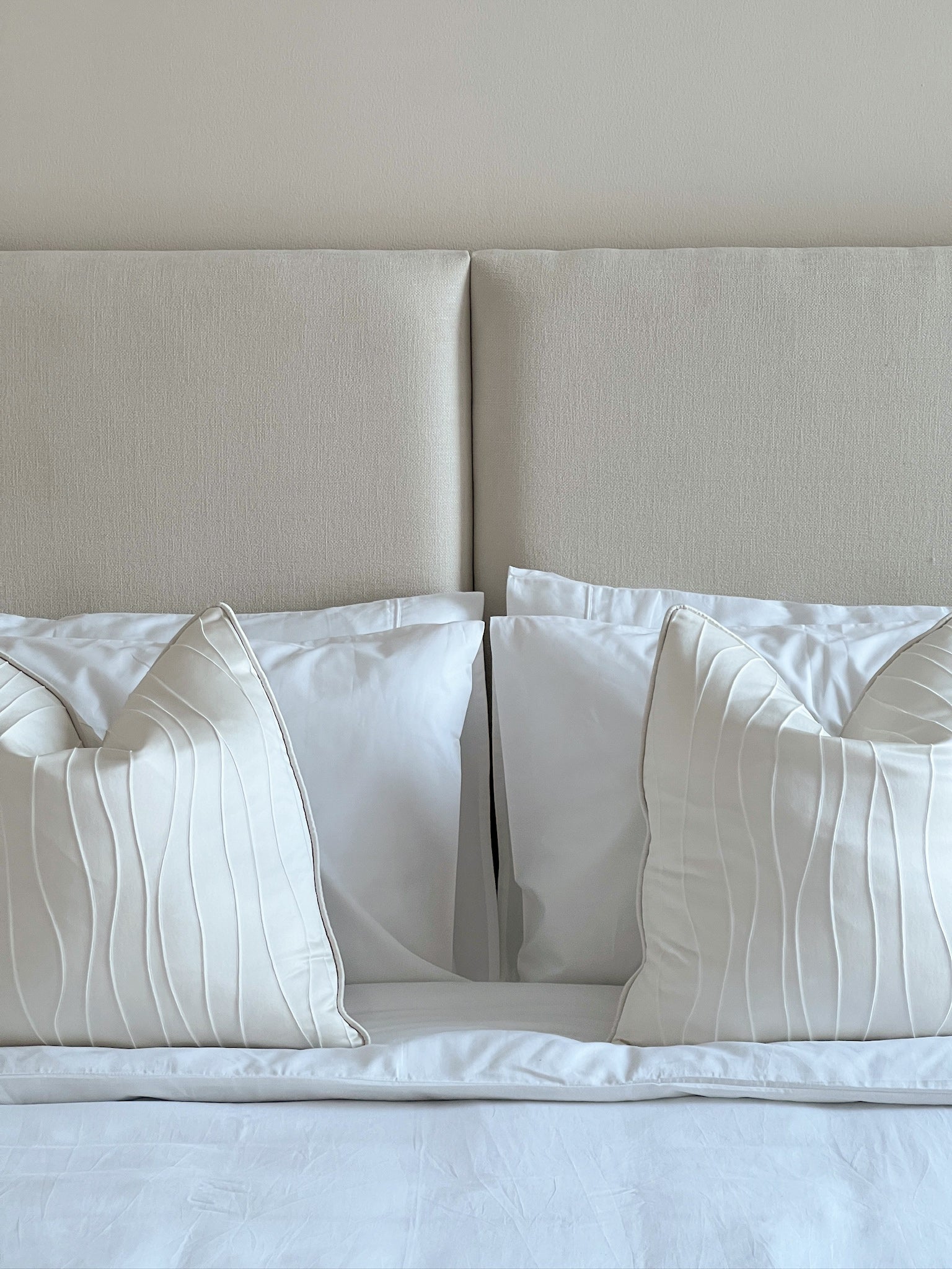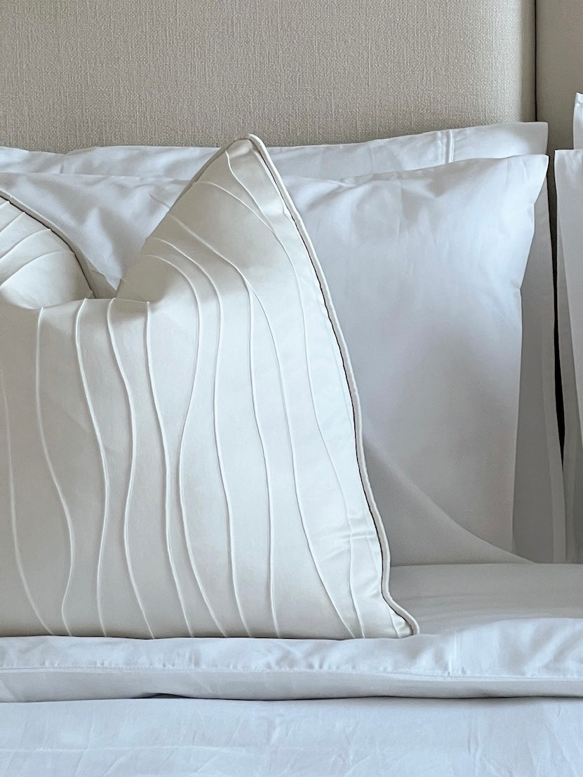 The Camilla Cushion is a sophisticated addition to any space, crafted from light white satin with a matching white trim. Its plush duck feather filling provides both comfort and support, while the wave-like texture detail adds a touch of refined elegance. The soft sheen of the satin fabric catches the light, creating a luxurious focal point in your living room, bedroom, or reading nook.