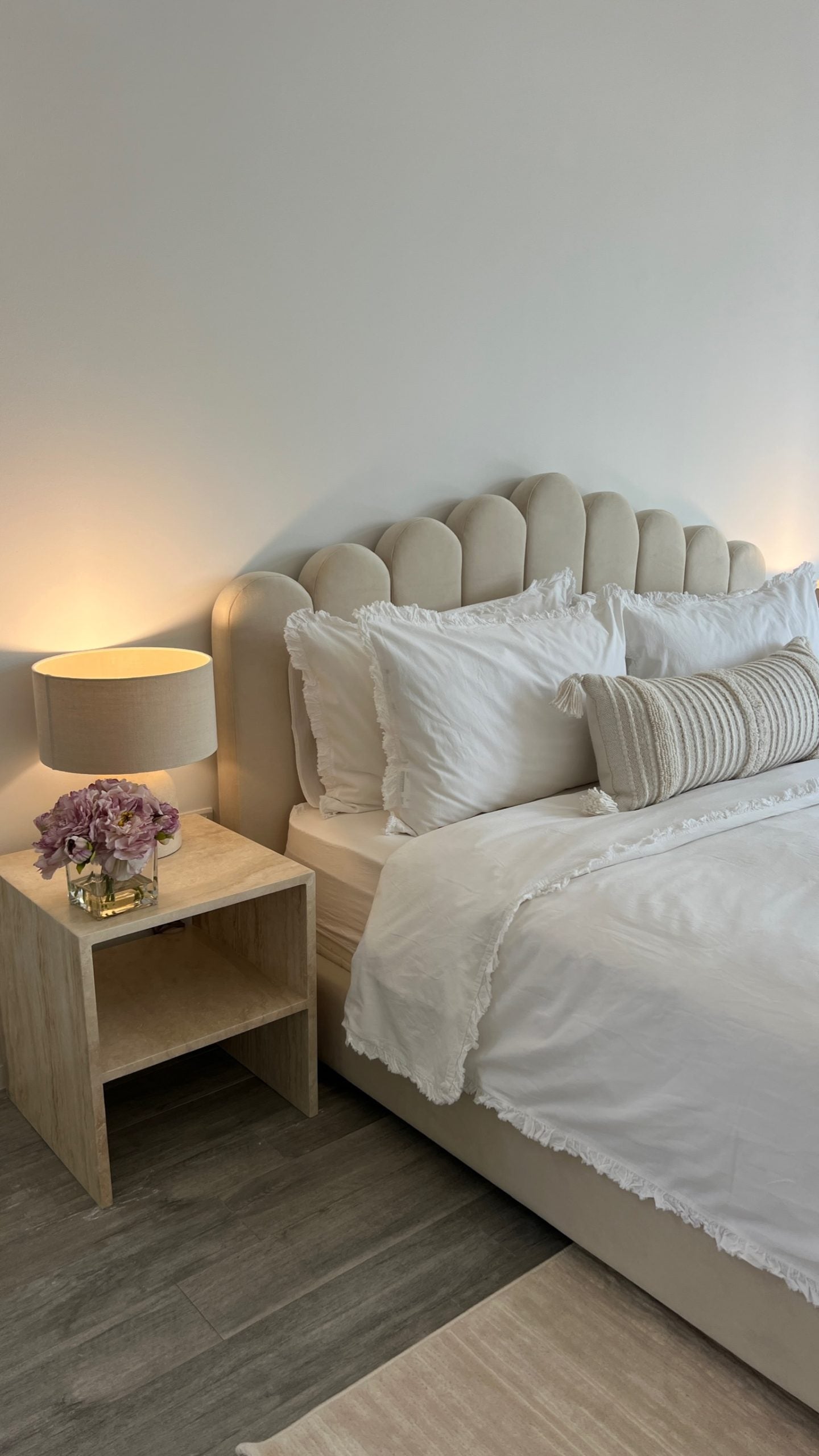The Carmen Curve Panel Bed showcases a luxurious soft beige suede frame with a gracefully curved headboard, offering a sophisticated touch to any bedroom. The bed’s standout feature is its vertical rounded panel detail, which adds texture and visual interest, creating a refined yet modern look.