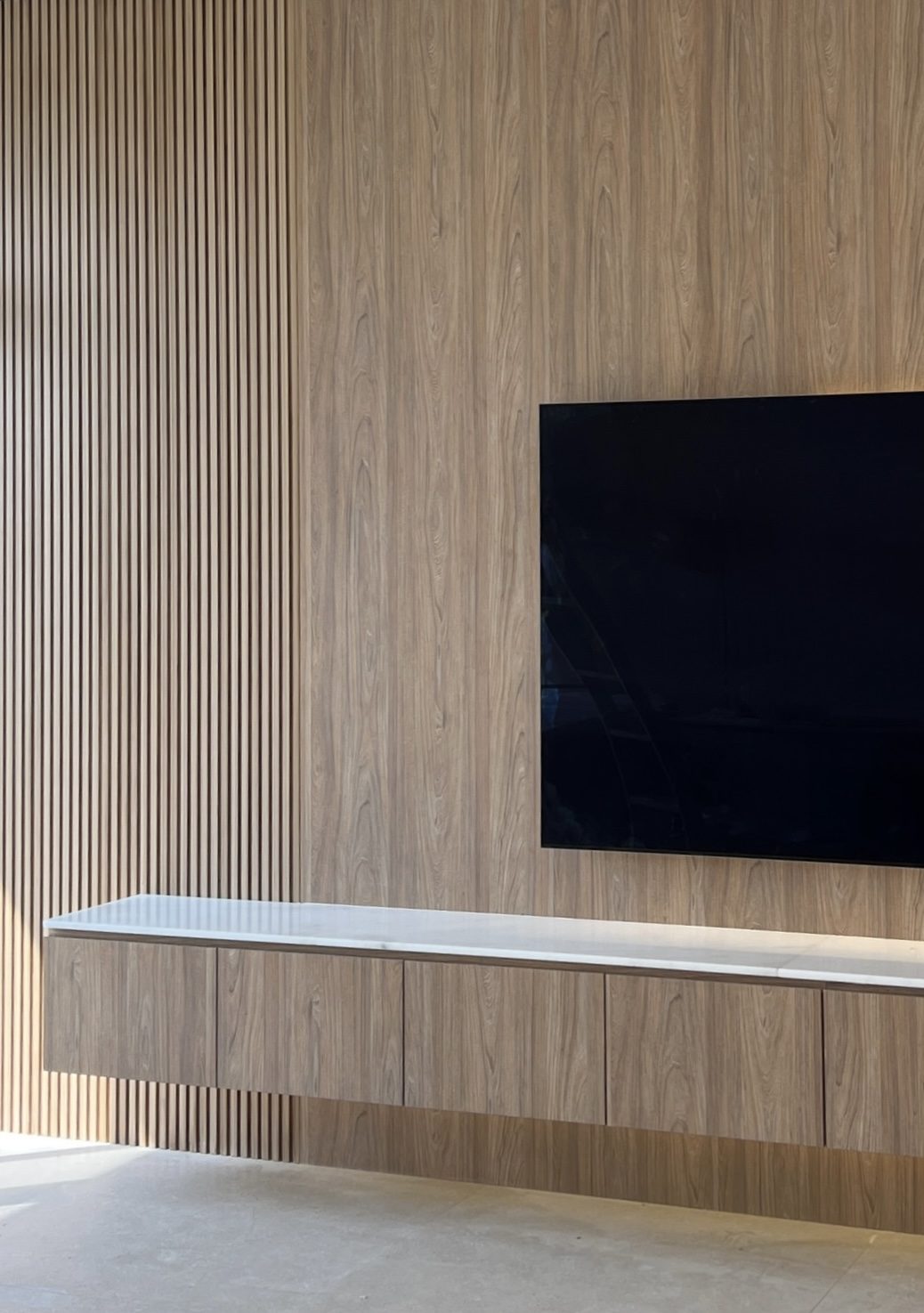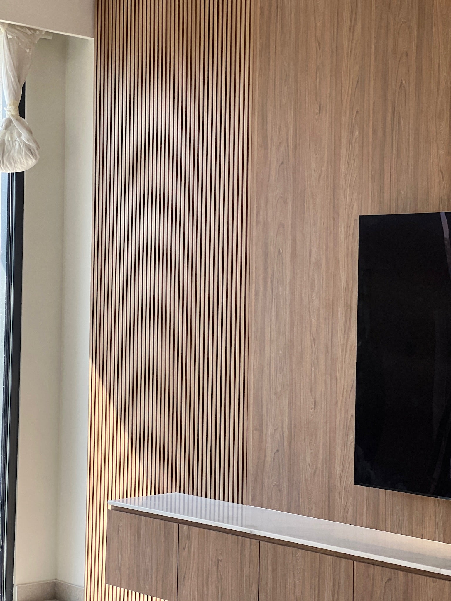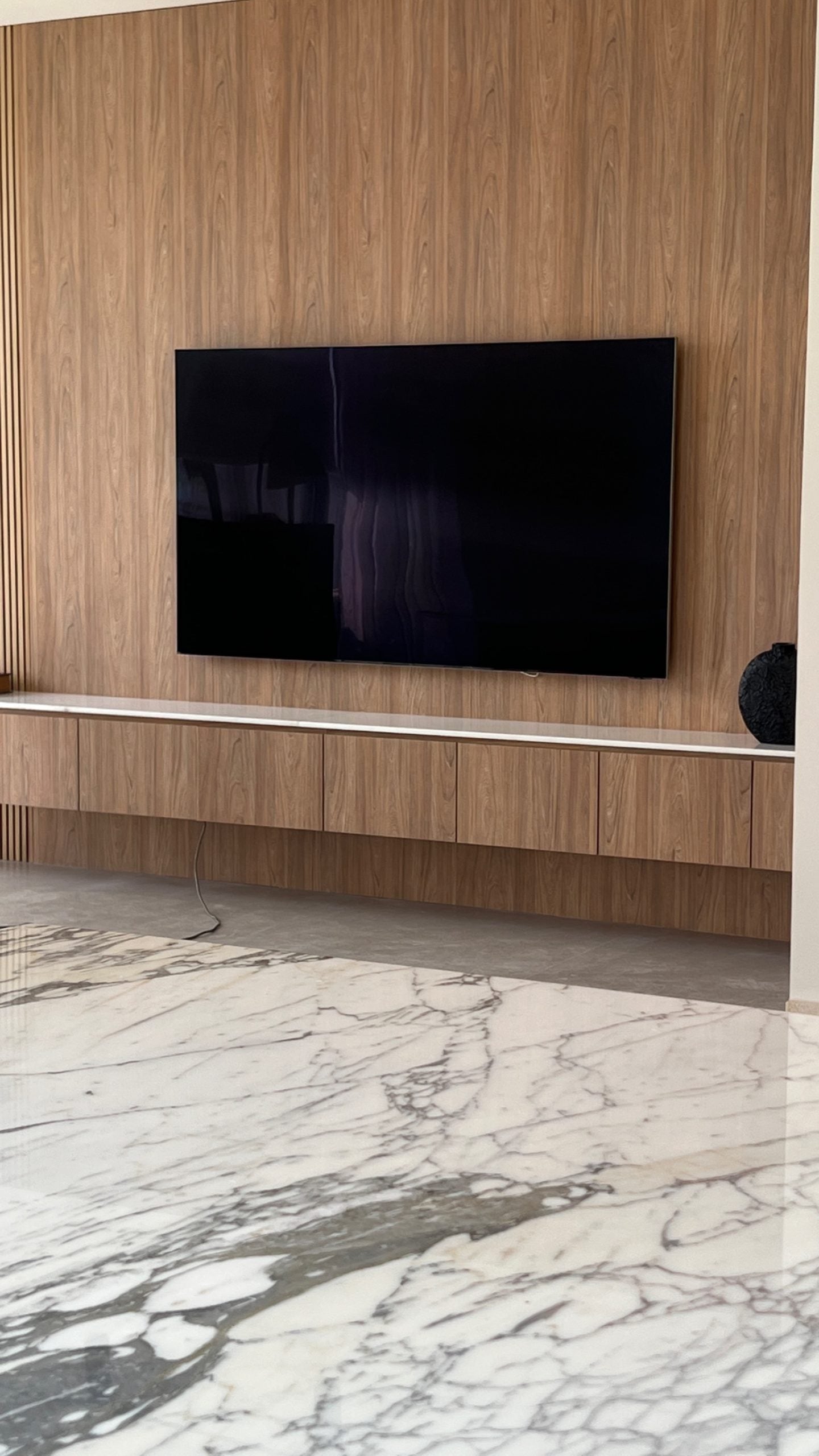 The Celine Media Wall, a wood paneled wall that is minimal in terms of material choice and stylish with it's contrasting flat and fluted panel serving as a backdrop for the TV, adding warmth and texture to the space. It is built with a floating cabinet with Nano White Marble on top and shelving on the side. The combination of wood and marble adds a luxurious and contemporary touch. The nano white marble top adds a touch of elegance and sophistication to the cabinet, creating a stunning contrast with the wood paneling.