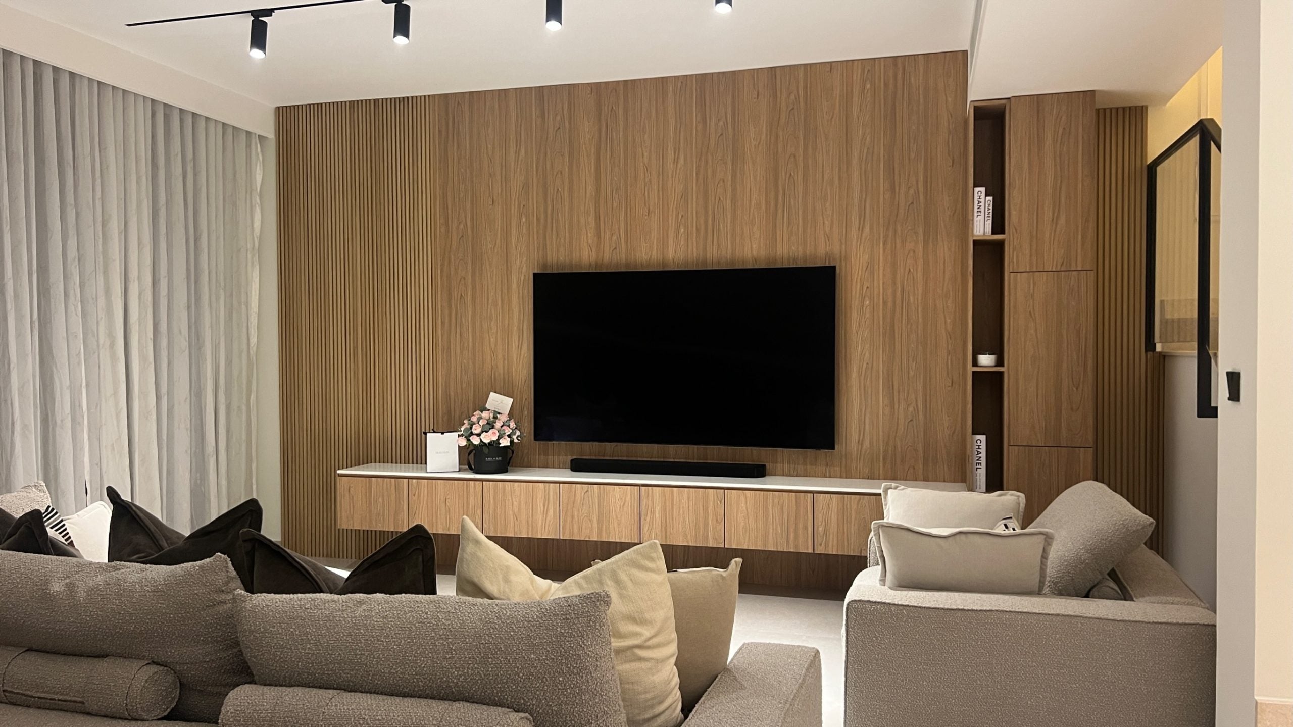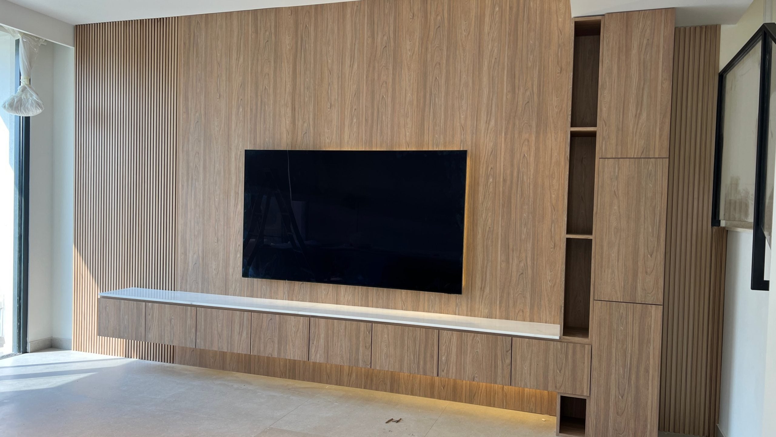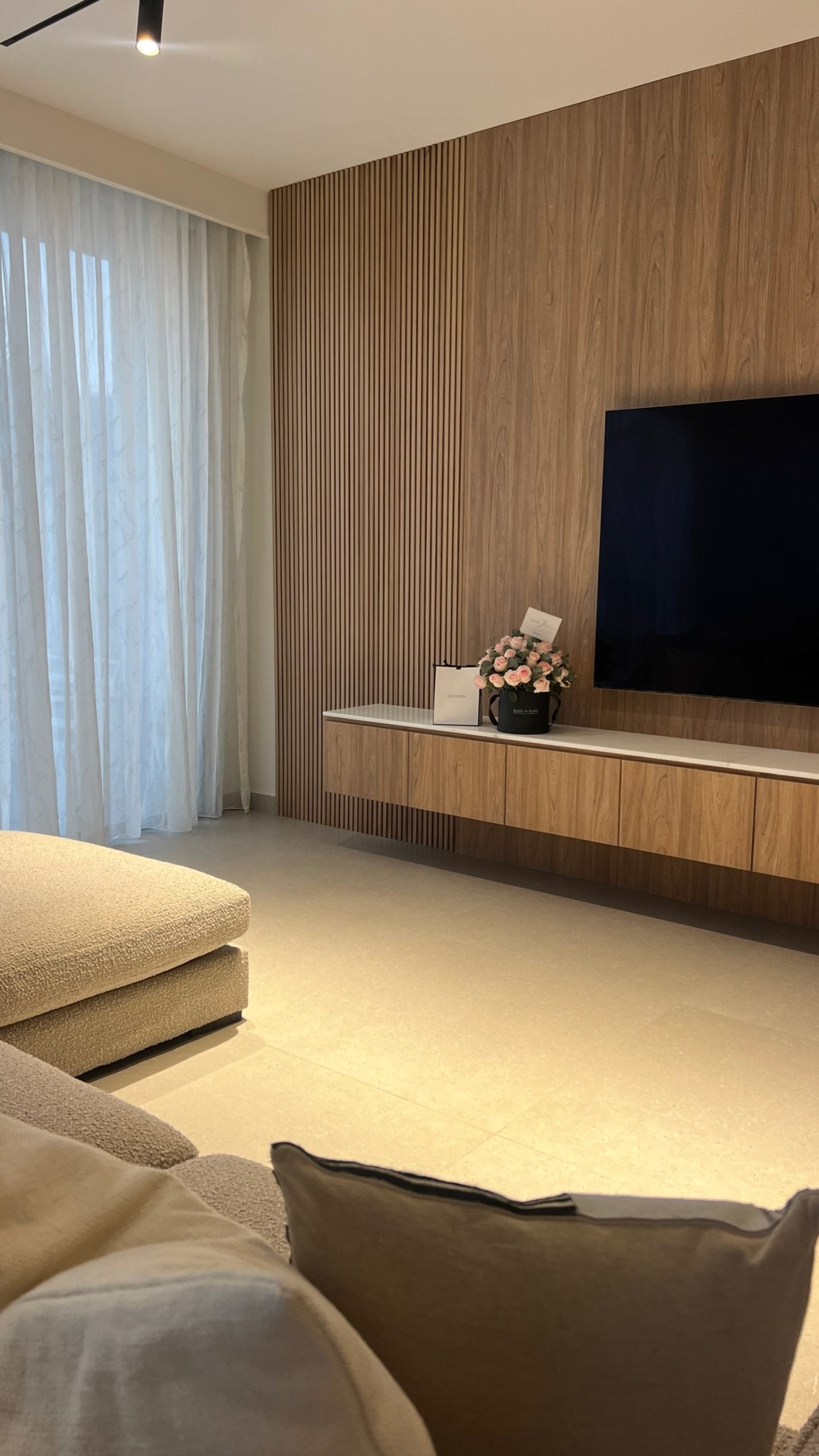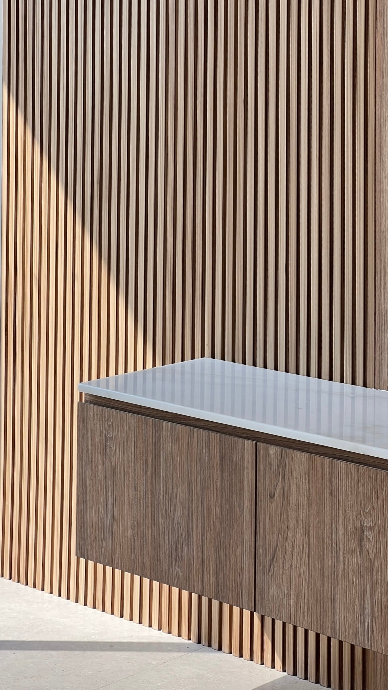 The Celine Media Wall, a wood paneled wall that is minimal in terms of material choice and stylish with it's contrasting flat and fluted panel serving as a backdrop for the TV, adding warmth and texture to the space. It is built with a floating cabinet with Nano White Marble on top and shelving on the side. The combination of wood and marble adds a luxurious and contemporary touch. The nano white marble top adds a touch of elegance and sophistication to the cabinet, creating a stunning contrast with the wood paneling.