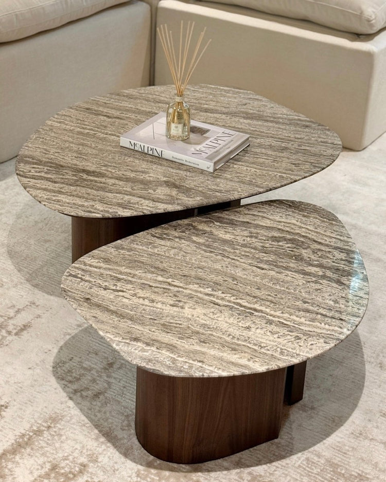 Meet the coffee table that redefines natural elegance our sculptural stone-top statement piece. Featuring an organic silhouette with dual-tiered levels, it brings movement and harmony to your space, while the richly veined stone surface adds timeless sophistication. Supported by smooth walnut-finished bases, this design marries nature’s raw beauty with modern minimalism.