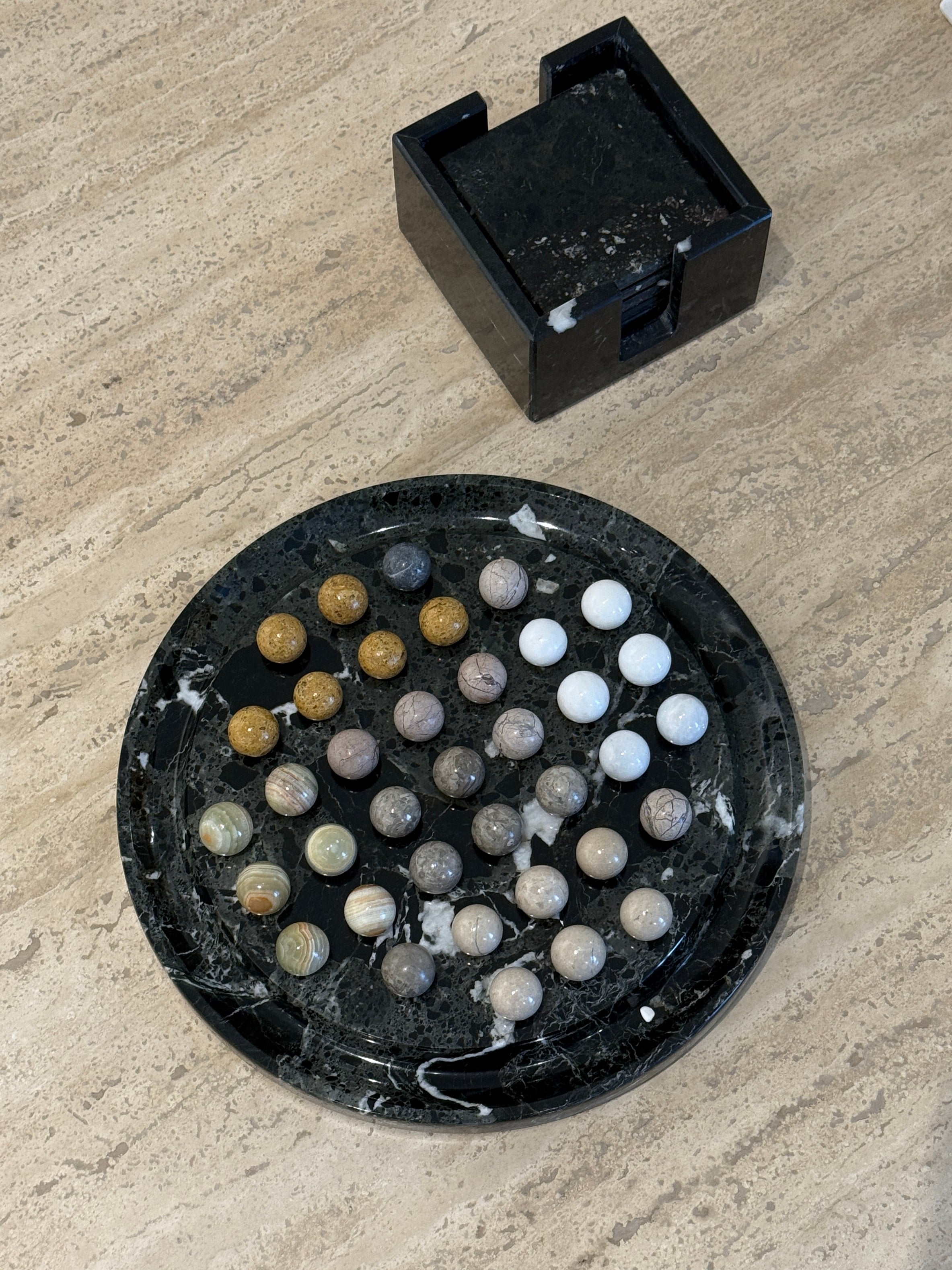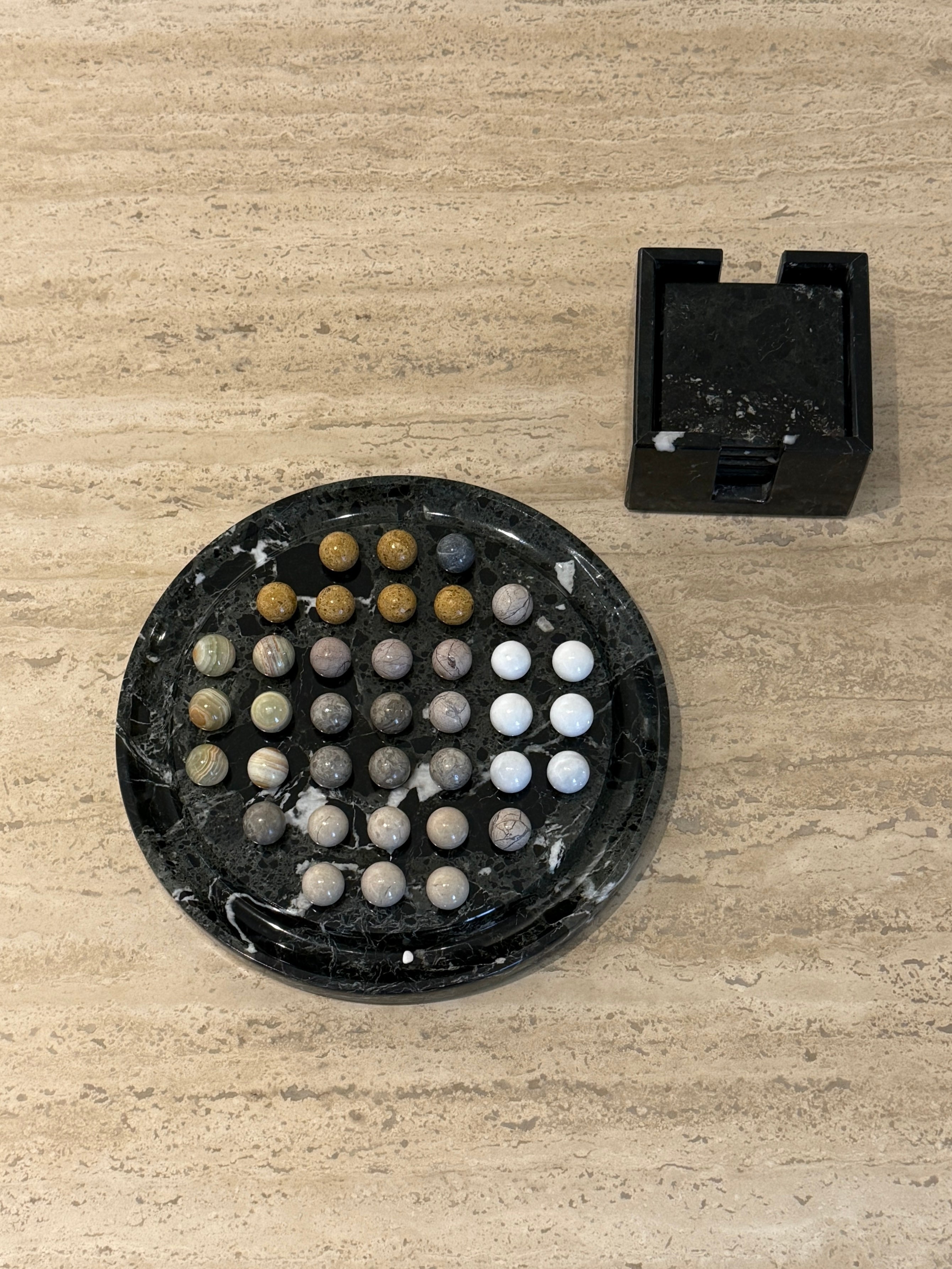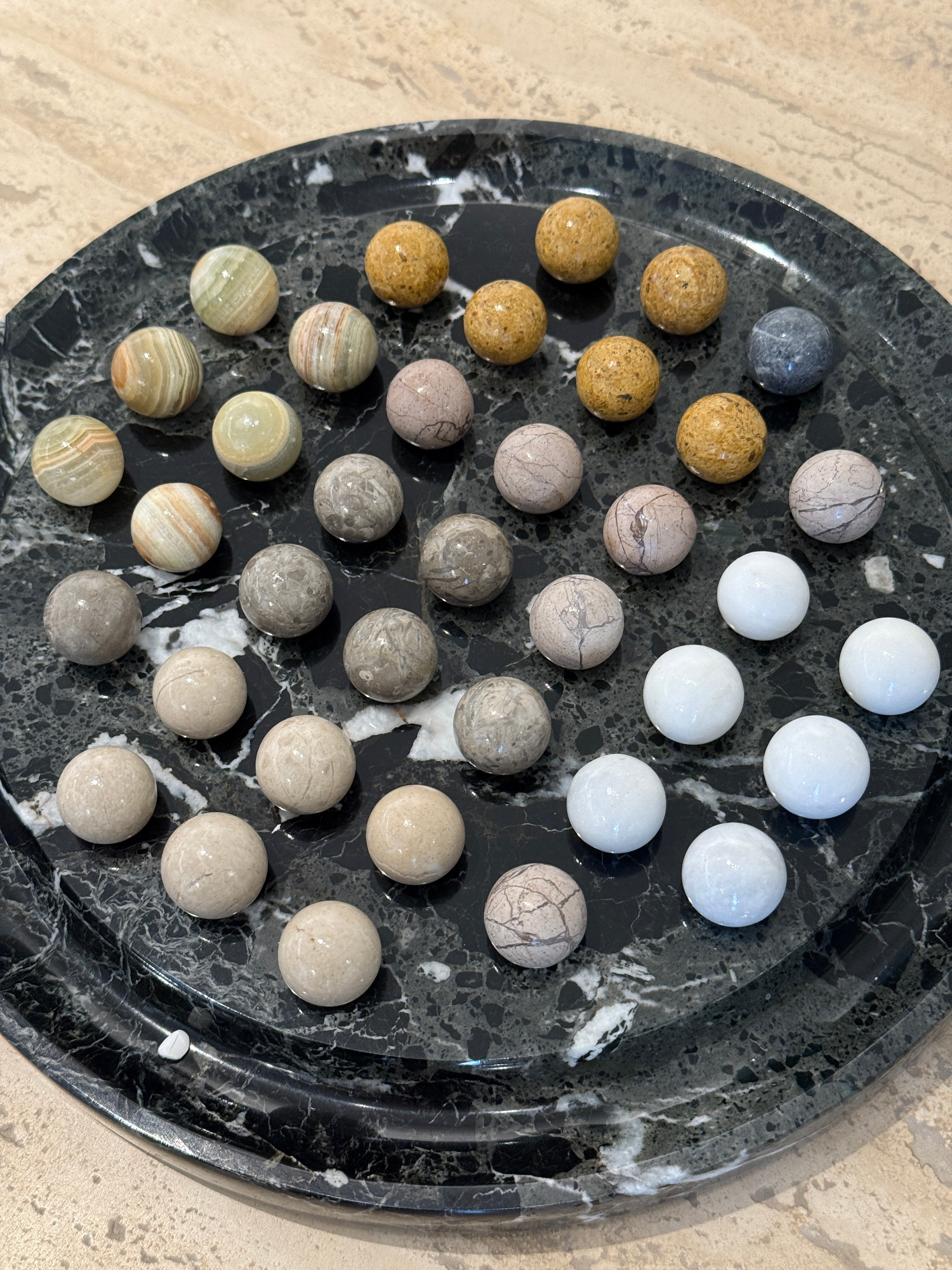 A timeless statement of elegance and intellect. The Cody Victor Peg Solitaire is meticulously handcrafted from natural marble, featuring multi-toned marble spheres that transform a classic game into an artful display. Each piece highlights the beauty of organic stone, its unique patterns, veins, and hues making every set truly one of a kind.