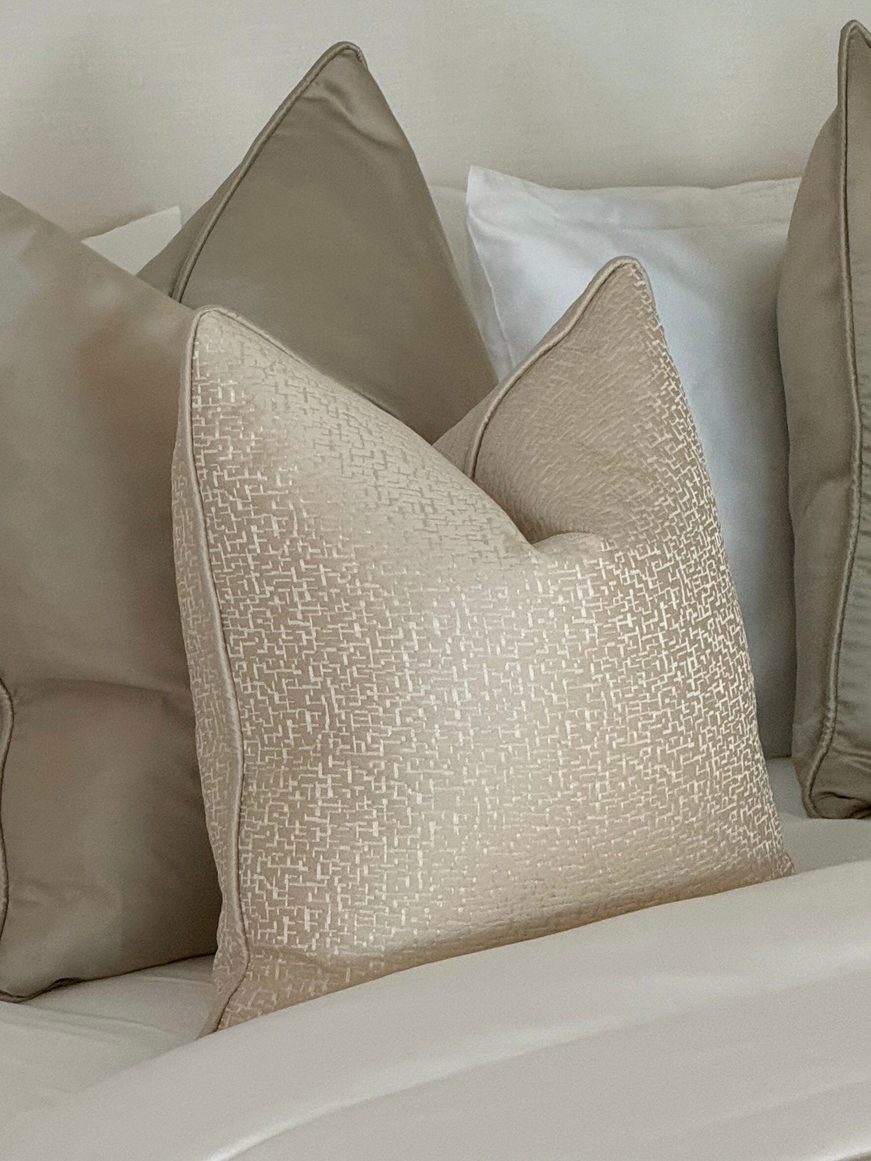 The Cora Cushion brings a perfect blend of elegance and comfort to your home. Made from cream-textured satin, its subtle sheen and intricate design add depth and sophistication to any room. Filled with soft, supportive duck feathers, the cushion offers a plush feel, making it both a luxurious accent and a practical addition to your living space.