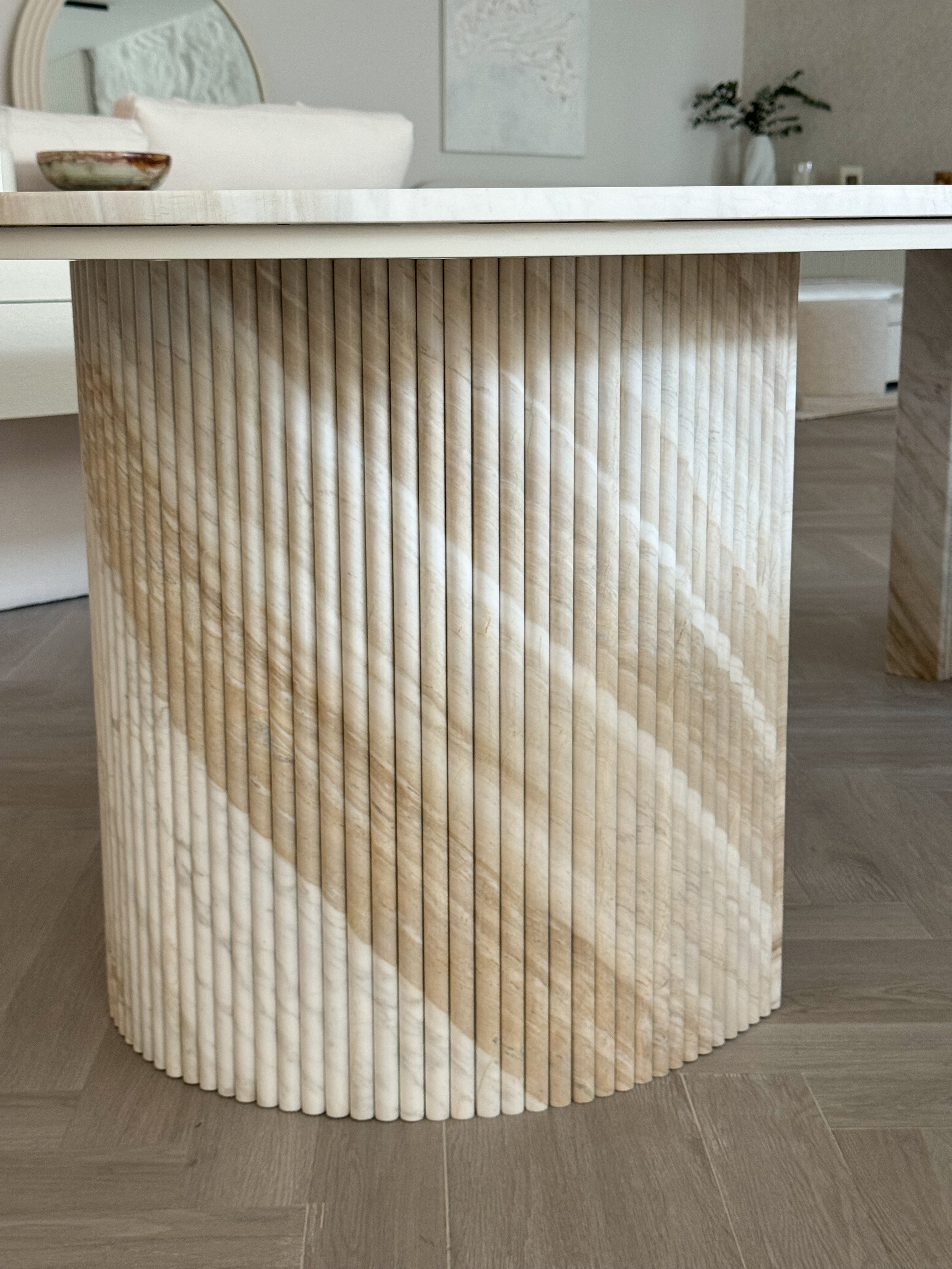 The Cynthia Dining Table is a statement piece crafted from luxurious Calacatta Greek marble, featuring a sleek, polished surface with distinctive veining. Its two solid marble fluted legs add a touch of architectural elegance, offering both stability and a striking design element.