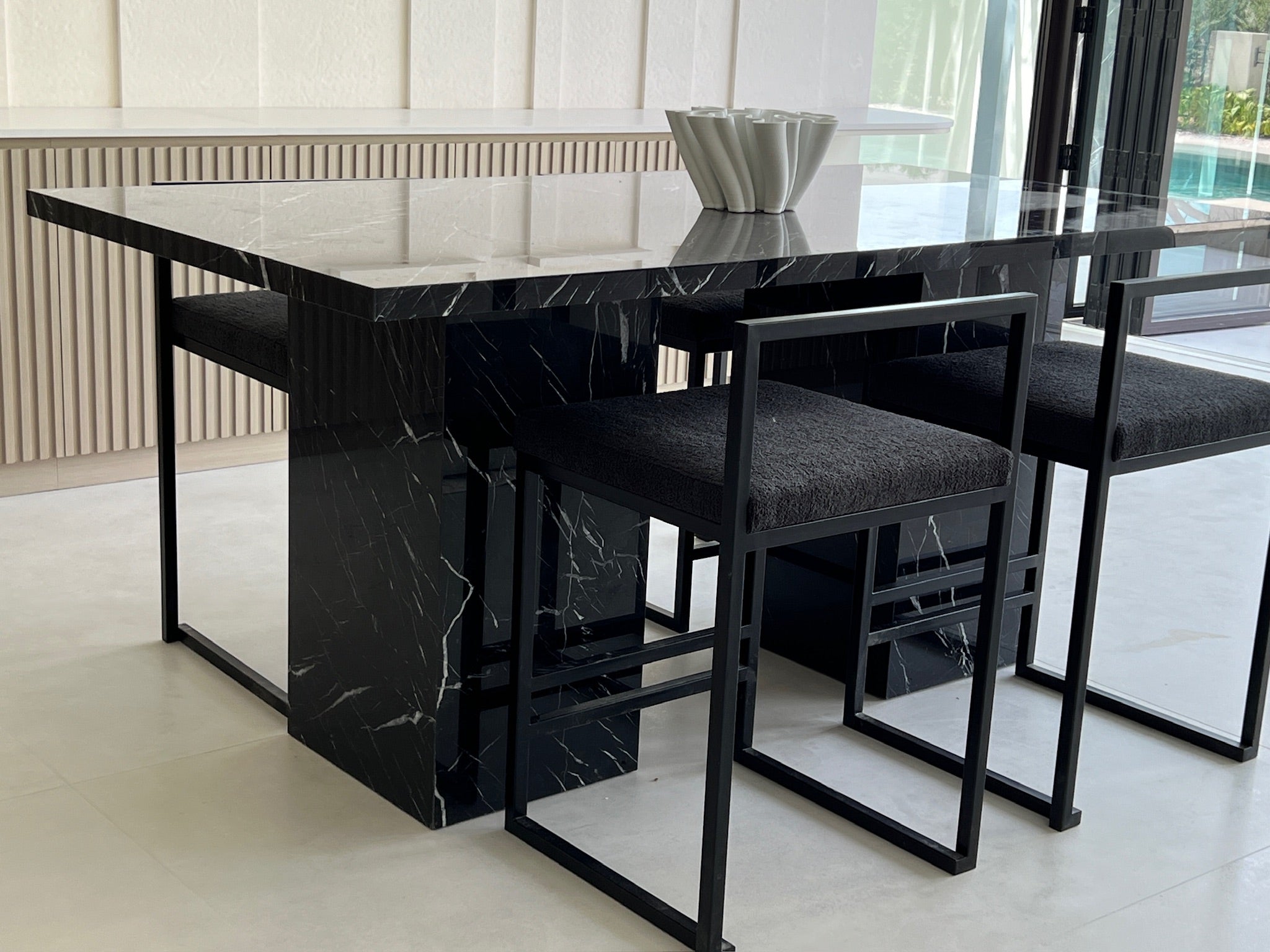 The Dakota Black Marquina Dining Table known for its deep black color with striking white veining exudes elegance and sophistication. Its rich, polished surface adds a touch of timeless beauty to any space. A rectangle shape offers a classic and spacious design. This type of dining table can serve as a centerpiece in a dining room, exhibiting sophistication and timeless beauty.