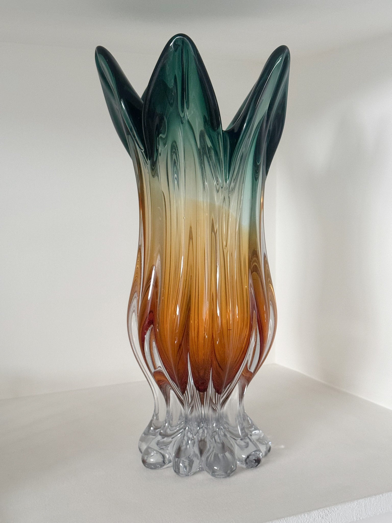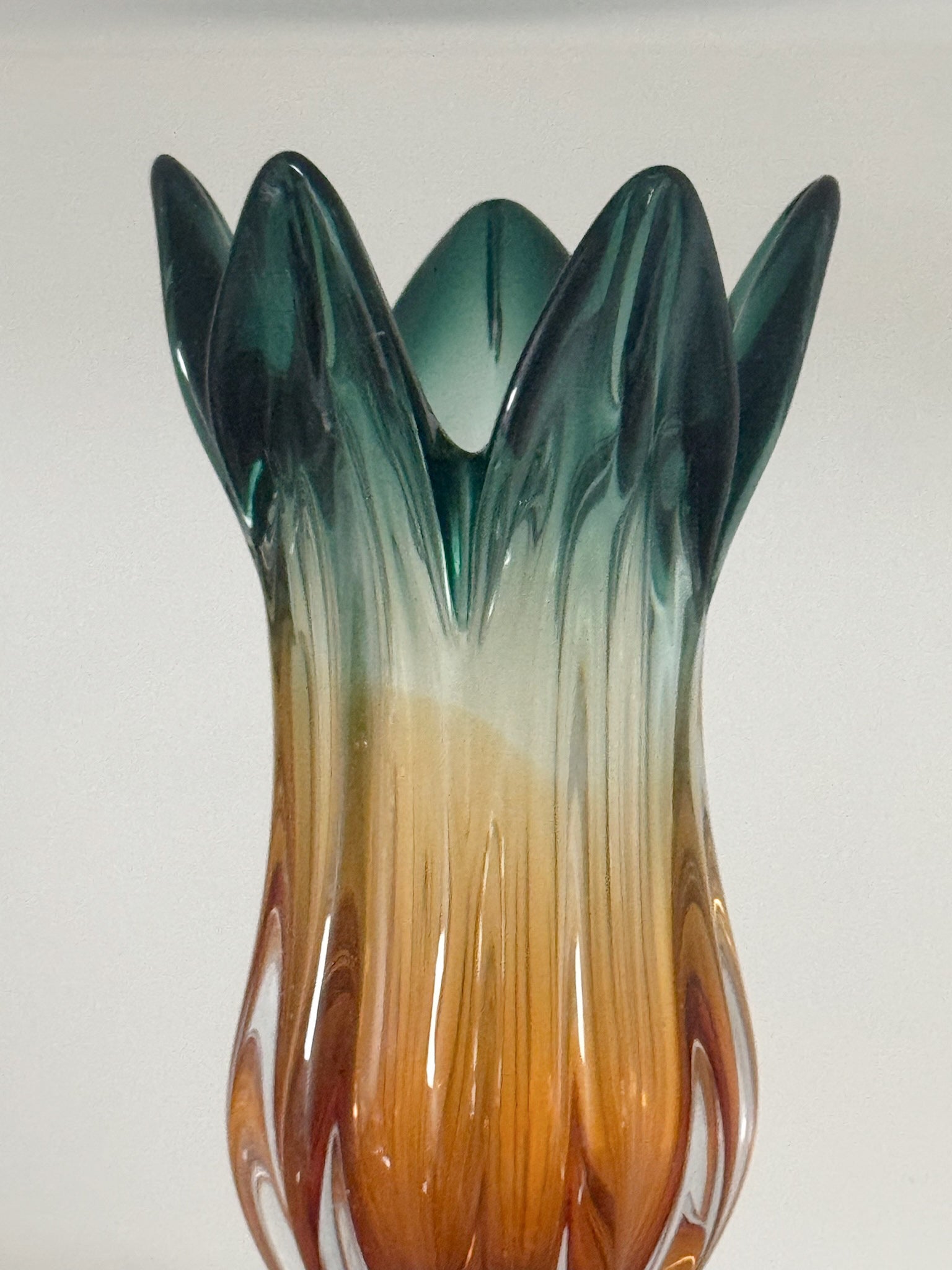 Add a touch of sophistication to your space with Elora Vase, featuring a mesmerizing gradient of deep green, warm amber, and clear glass. It's unique shape, inspired by nature,flowing silhouette mimics the graceful unfurling of petals, evoking both strength and delicacy.