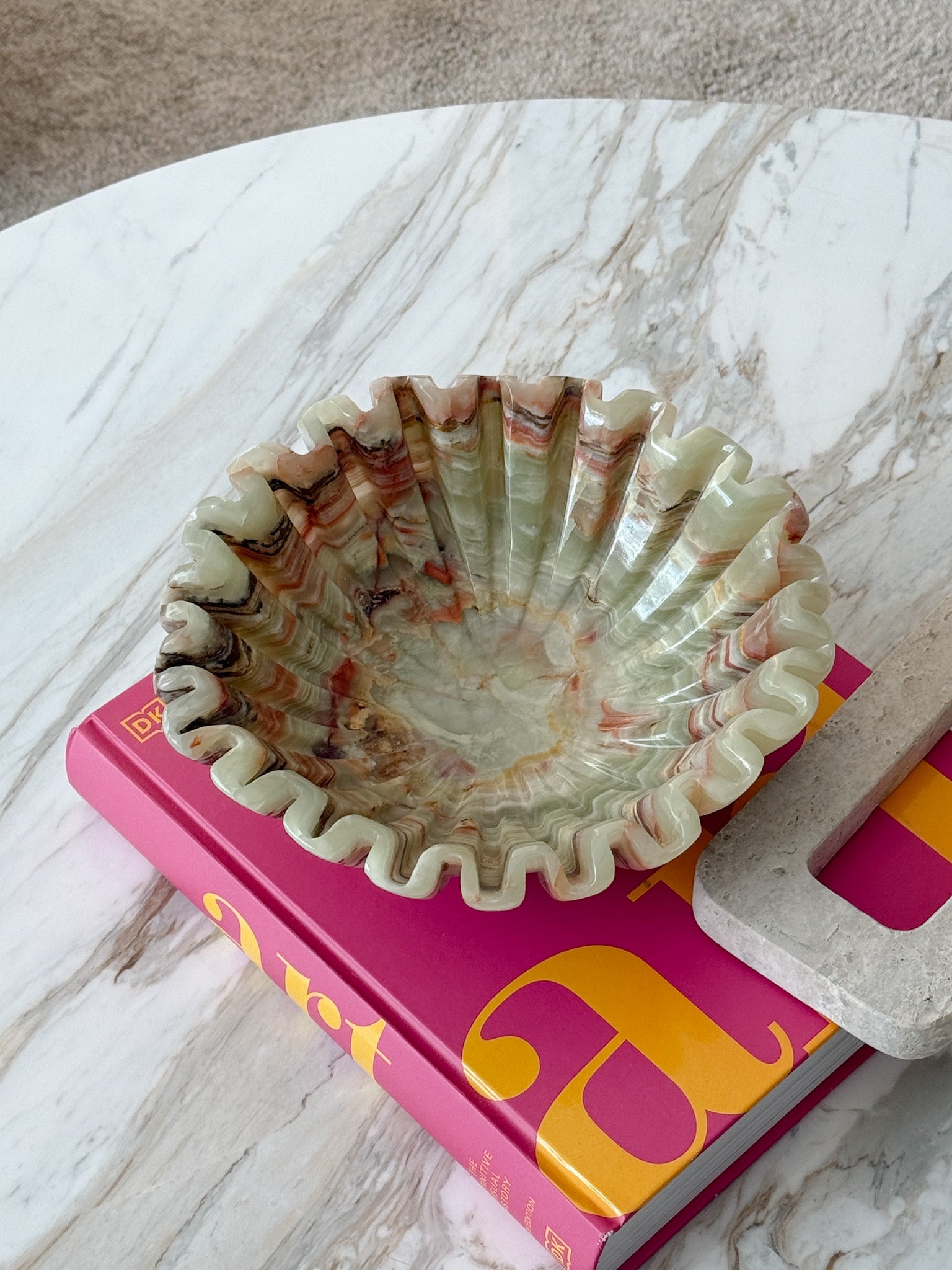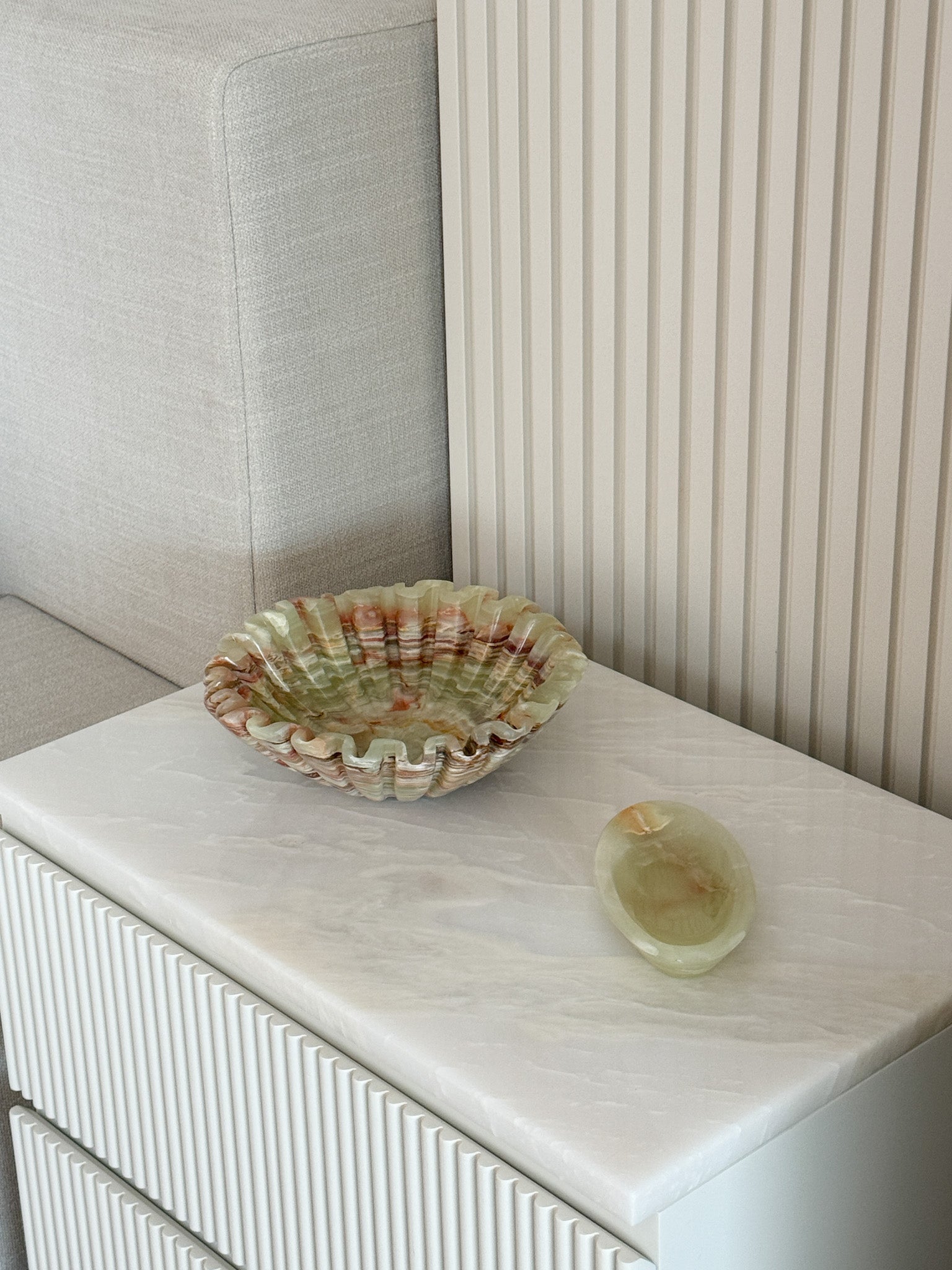 The Gracie Green Onyx fruit bowl features a gorgeous scalloped design, blending minimalist elegance with organic form. The polished surface and natural stone texture create a refined, earthy aesthetic, while the scalloped edges add a unique, sculptural touch. Its soft curves and understated design give it both visual interest and timeless appeal.