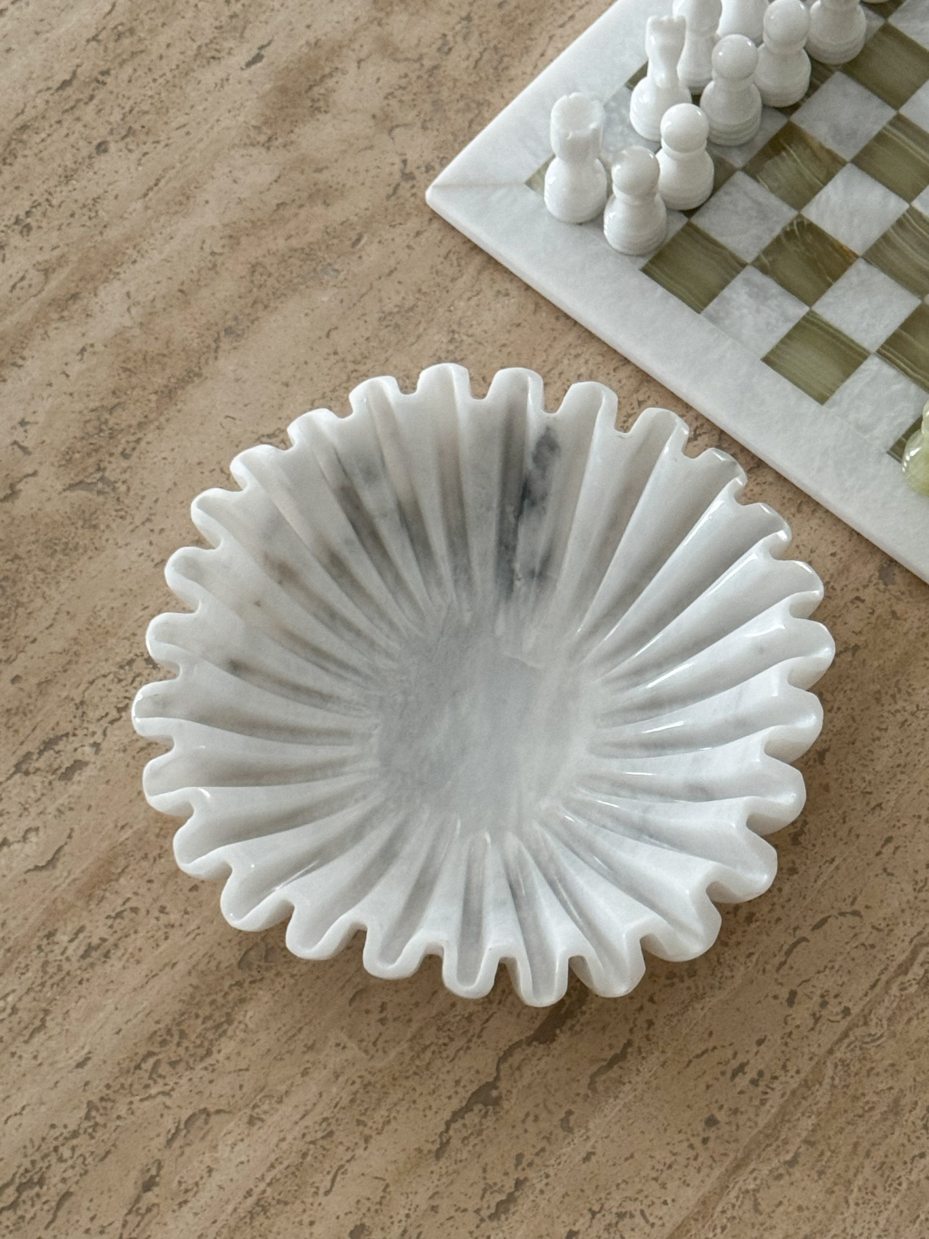 Introducing the Gracie Medium Angelica Fruit Bowl, a masterpiece of craftsmanship that seamlessly blends functionality with timeless elegance. Meticulously sculpted from premium white marble, this bowl features a distinctive waffle-patterned top, adding a touch of texture and sophistication to its sleek design.