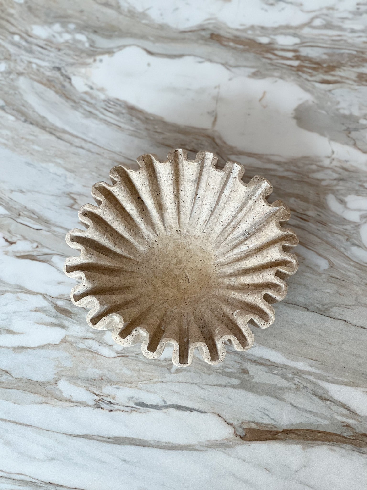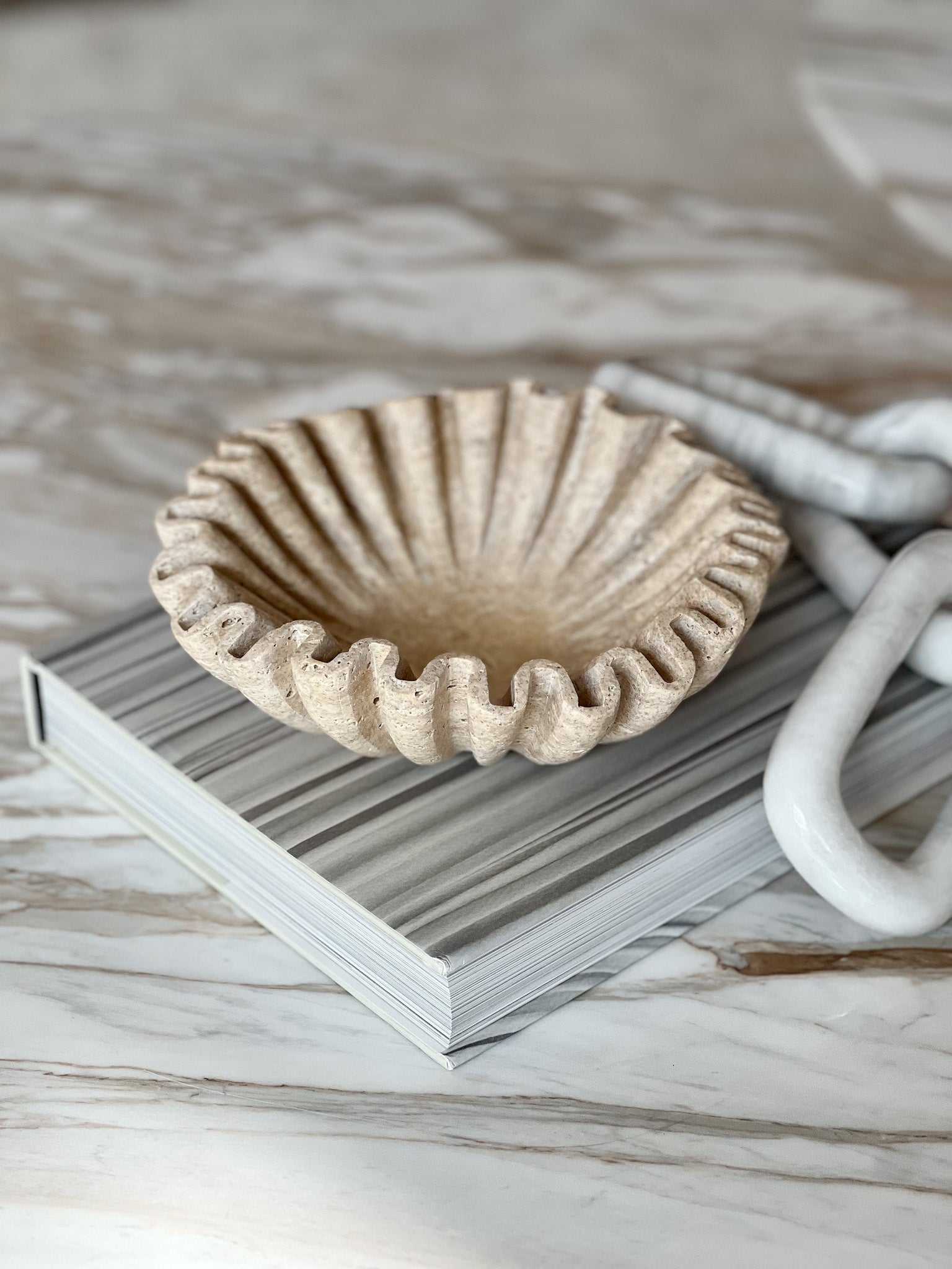 The Gracie Small travertine fruit bowl features a gorgeous scalloped design, blending minimalist elegance with organic form. The natural stone texture create a refined, earthy aesthetic, while the scalloped edges add a unique, sculptural touch. It's soft curves and understated design give it both visual interest and timeless appeal.