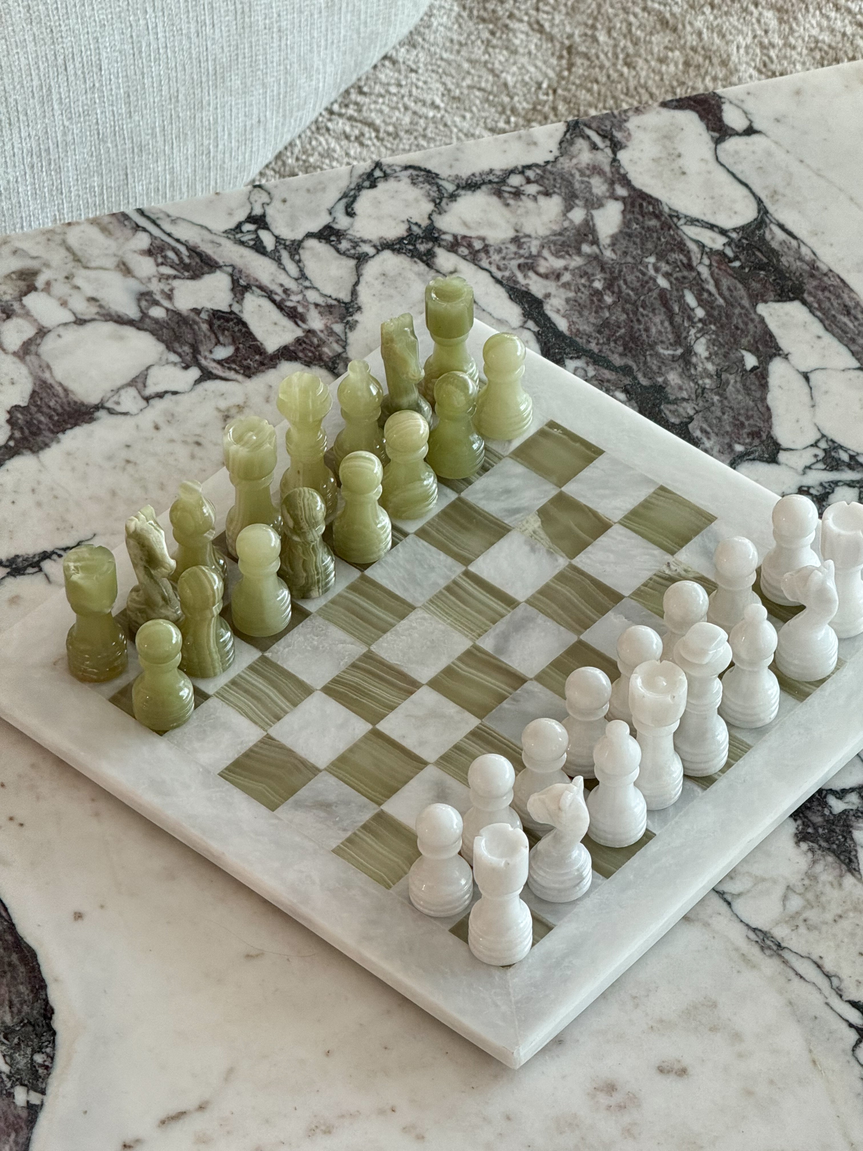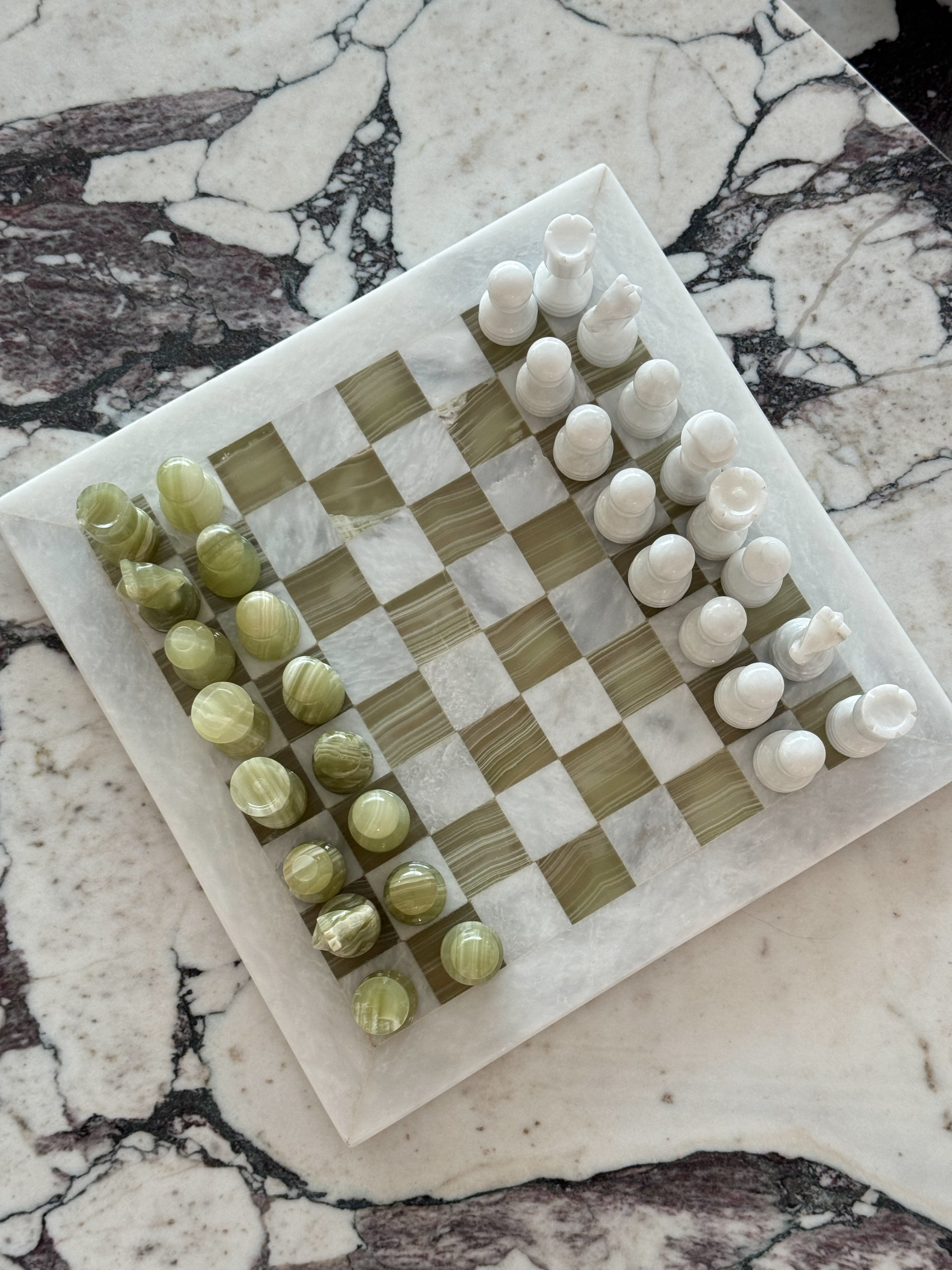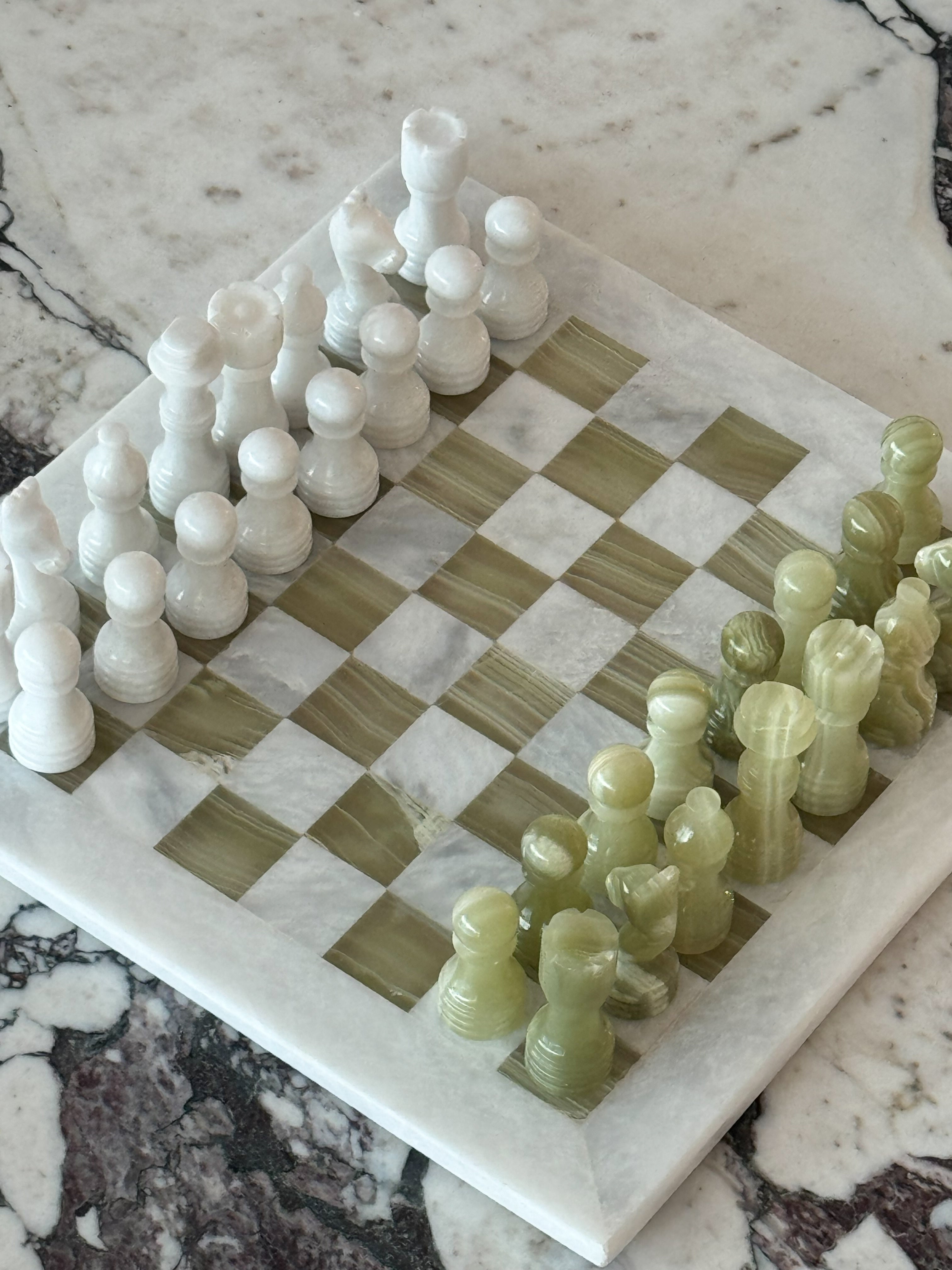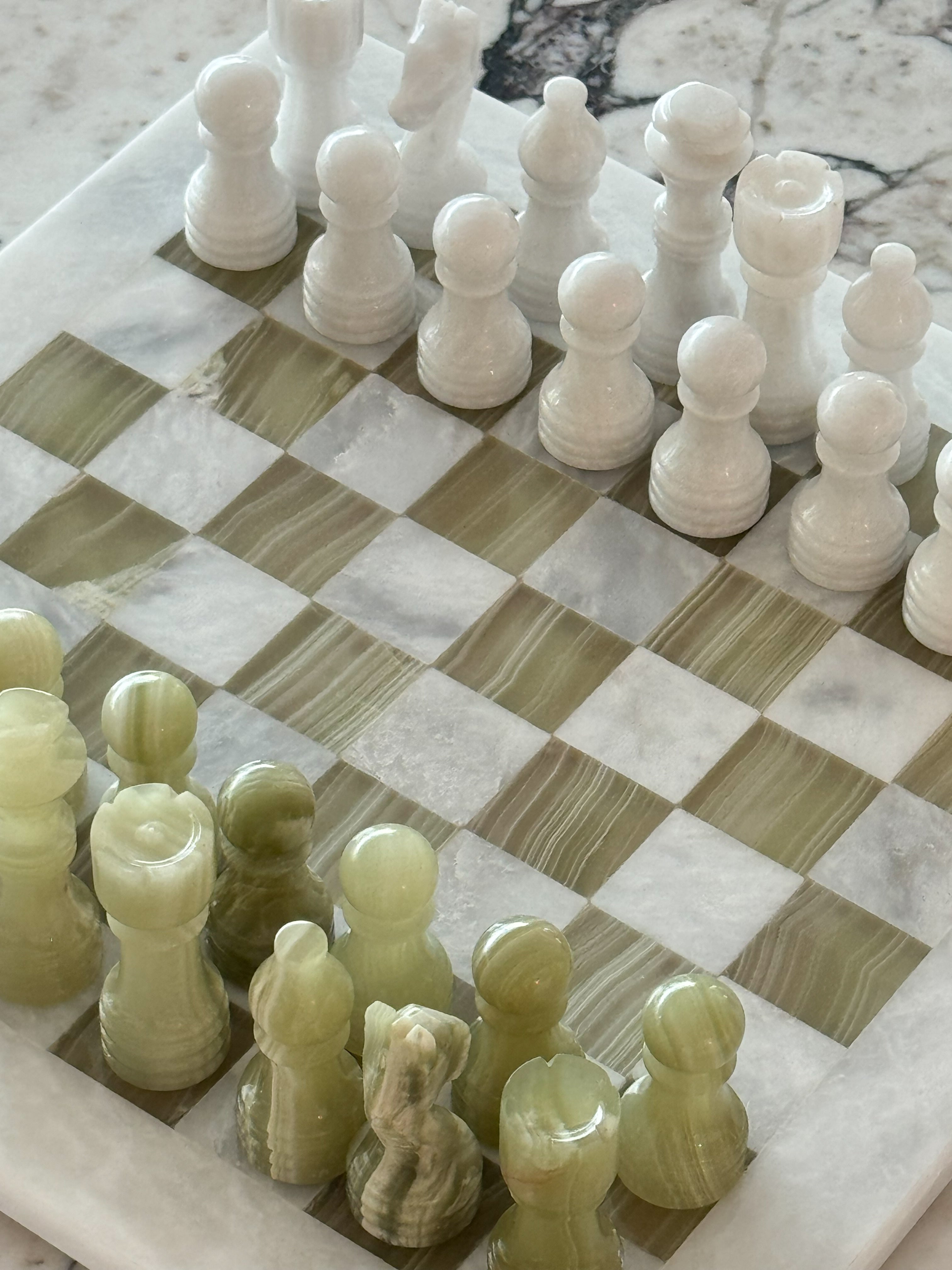 Indulge in the timeless allure of our White & Green Onyx Marble Chess Board meticulously crafted to infuse luxury and sophistication into your gaming sessions. Expertly made from Onyx and marble, this exquisite board not only offers a distinguished platform for chess enthusiasts but also serves as an opulent decor piece in any setting.