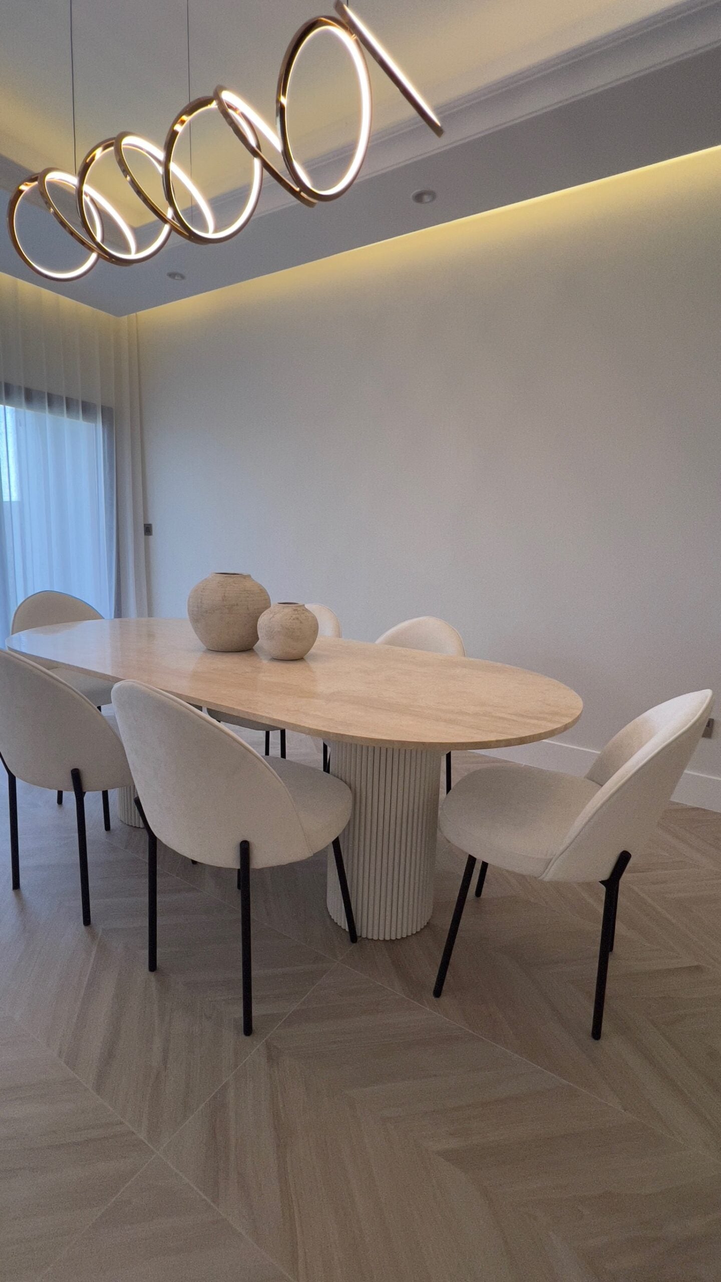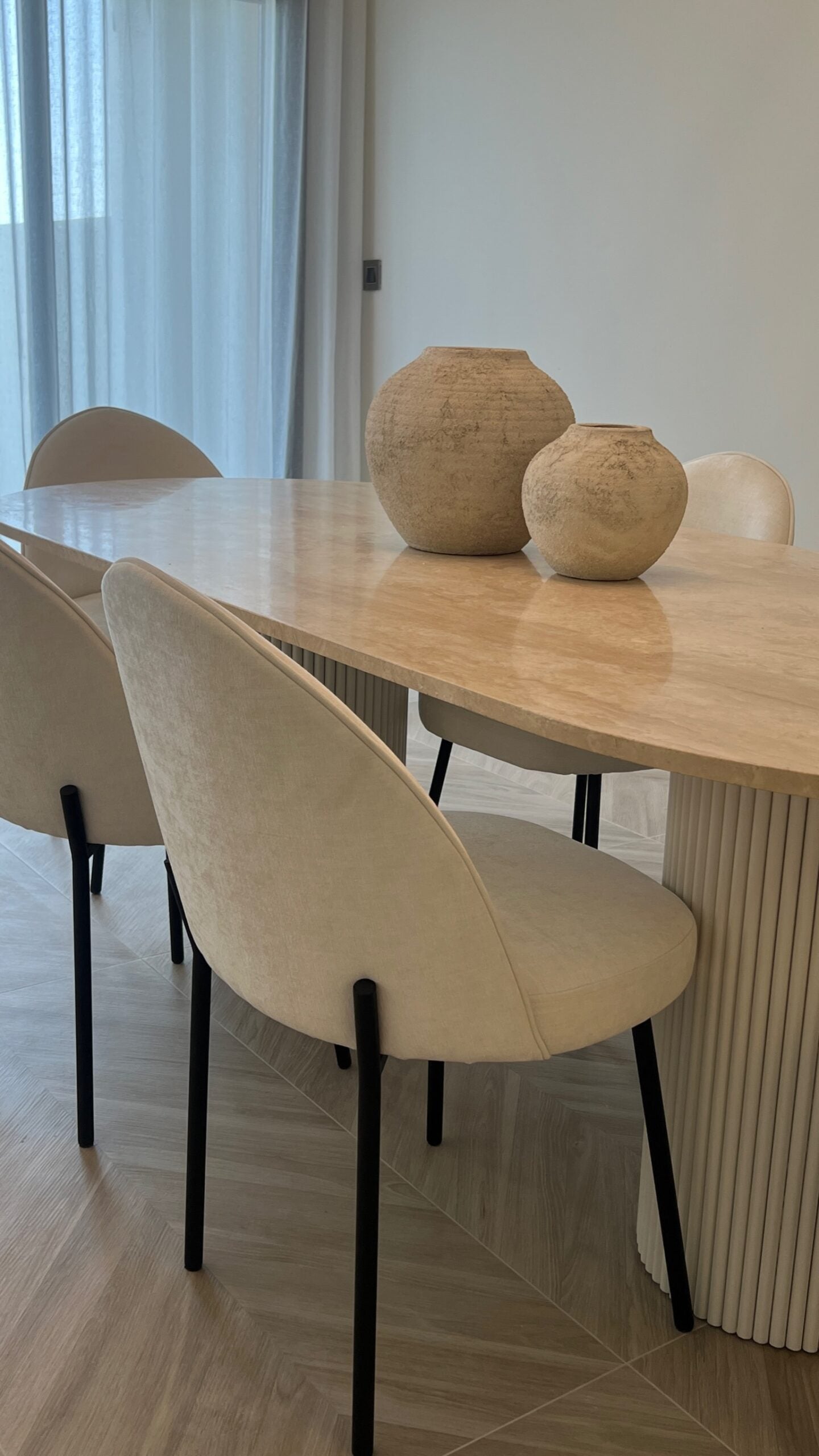 Our Beautiful Harper Dining Chair in velvet look cream fabric with black steel legs. This chair combines stylish with comfort, making it perfect for any contemporary home.