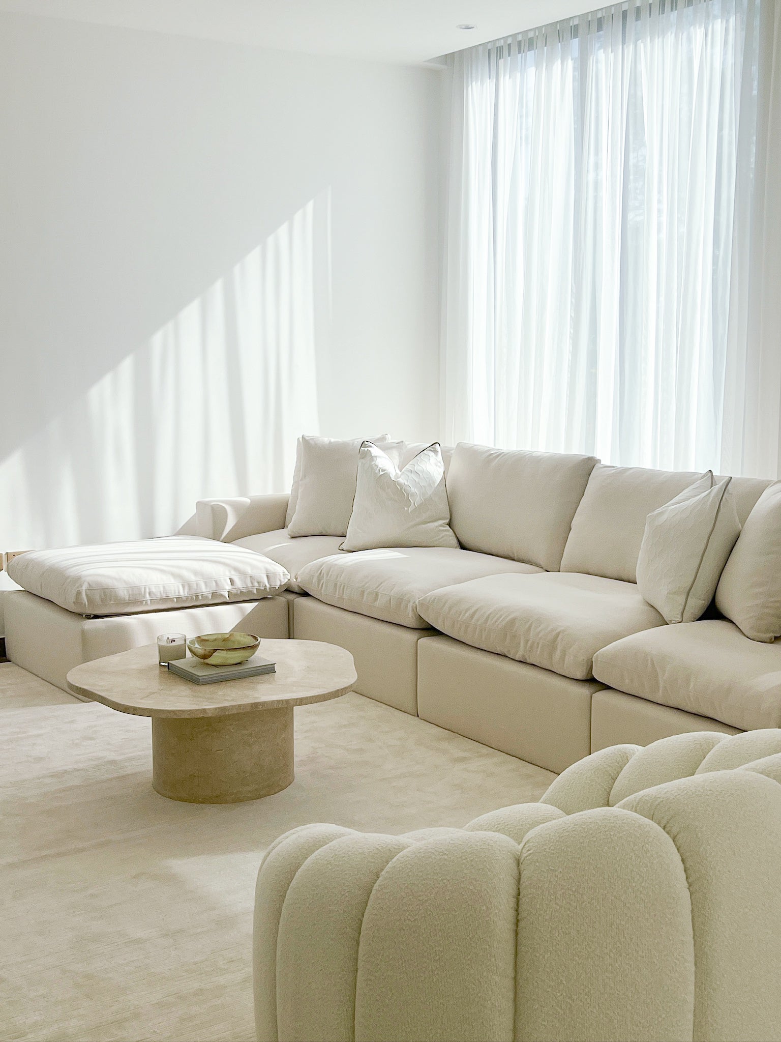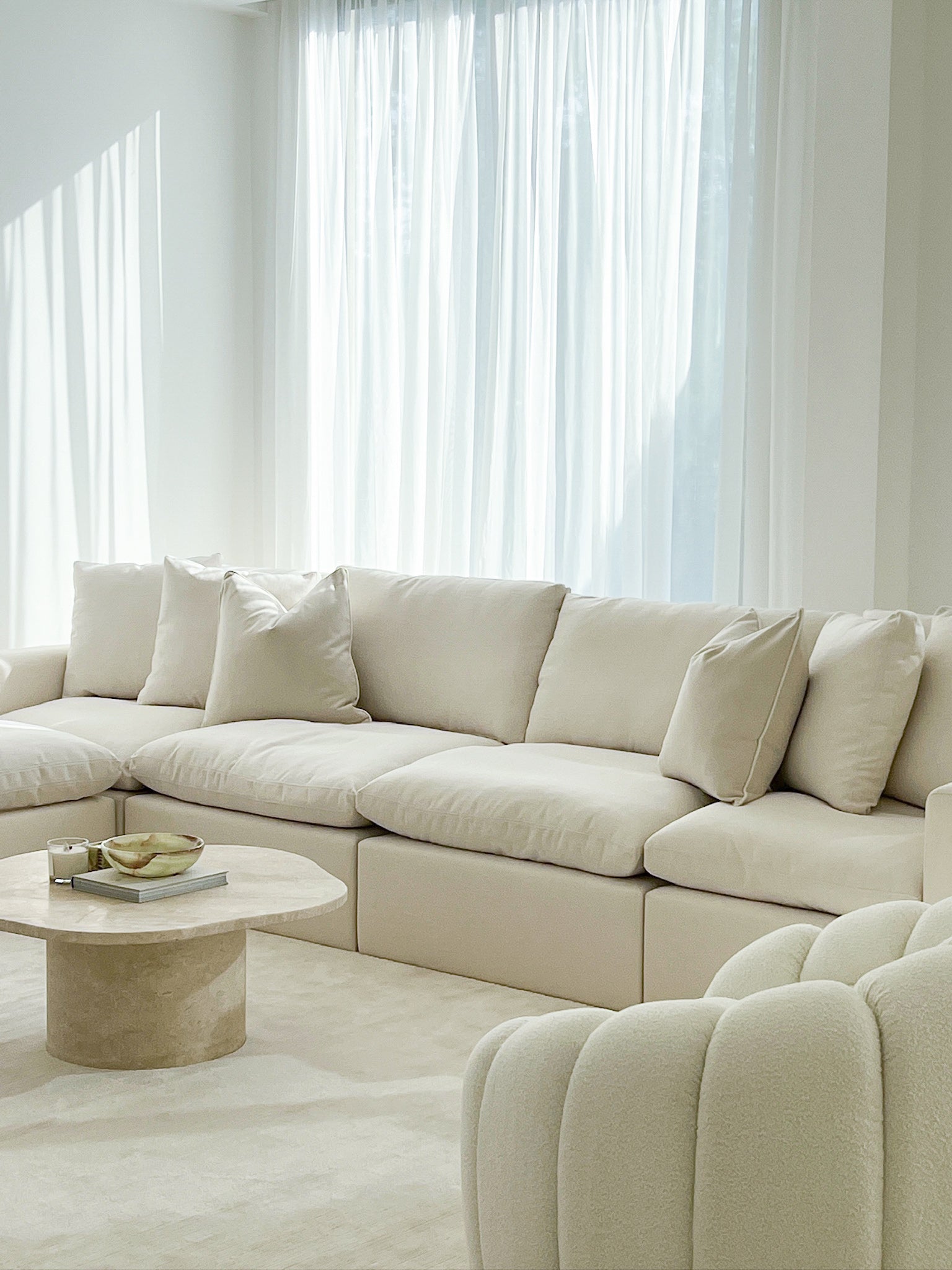 Our stunning cotton blend cloud sofa. The best comfort and style factor for modern day living. We designed our Harriet cloud sofa to be extremely chic and comfortable with different variety of fabric selection that will suit your home mood. We use Dacron filled to create the ultimate cloud like with longer lasting soft and bounce back seating experience. In this comfy sofa, you can opt for the classic linen look or the stylish boucle fabric where you can nestle and lounge with your friends and family in a get-together or just the lovely cozy stay at home days.