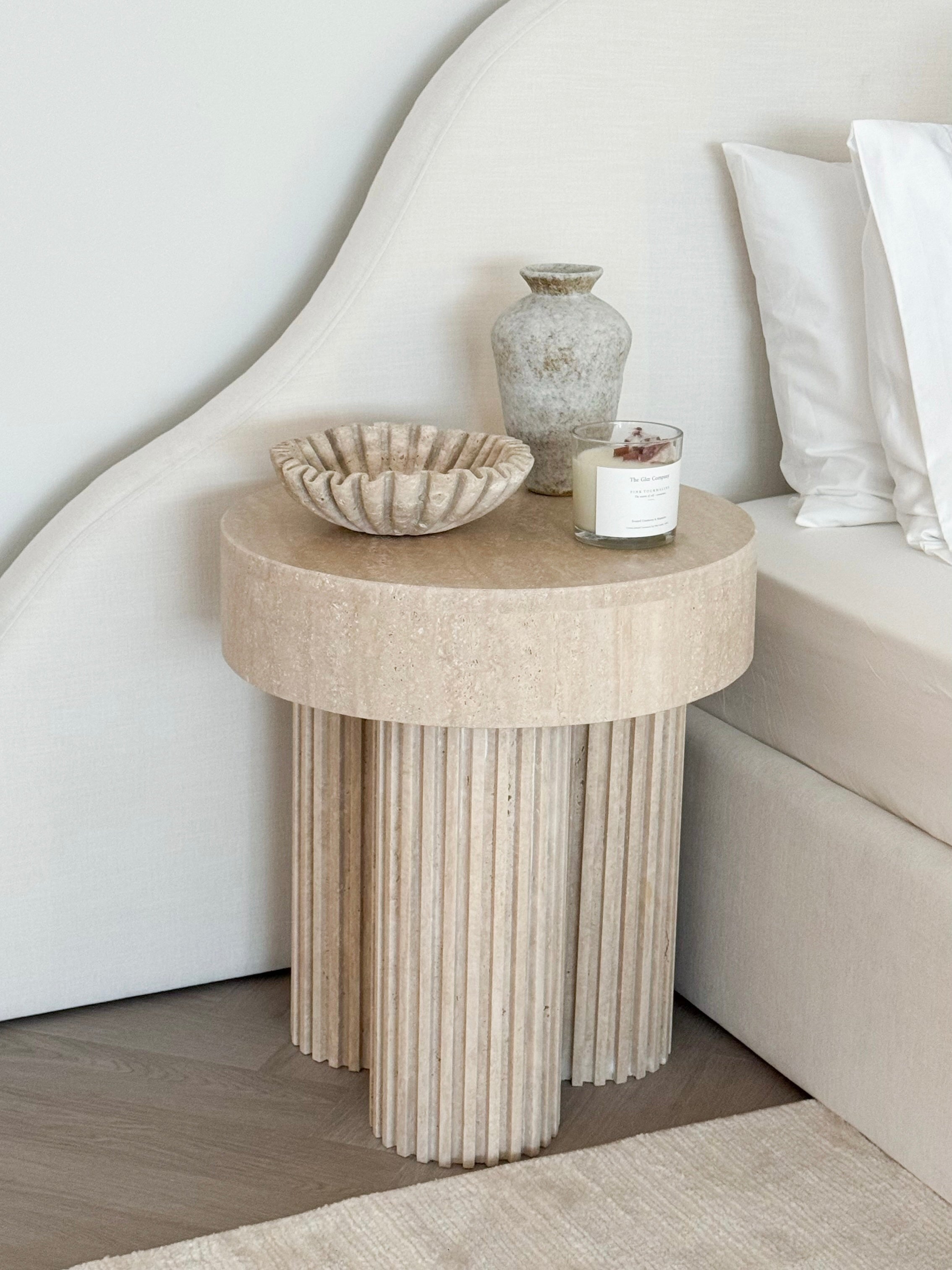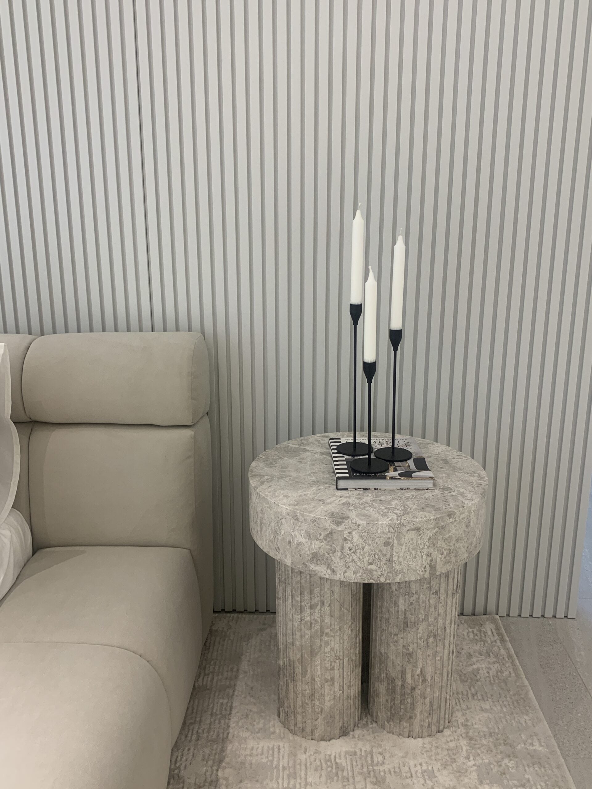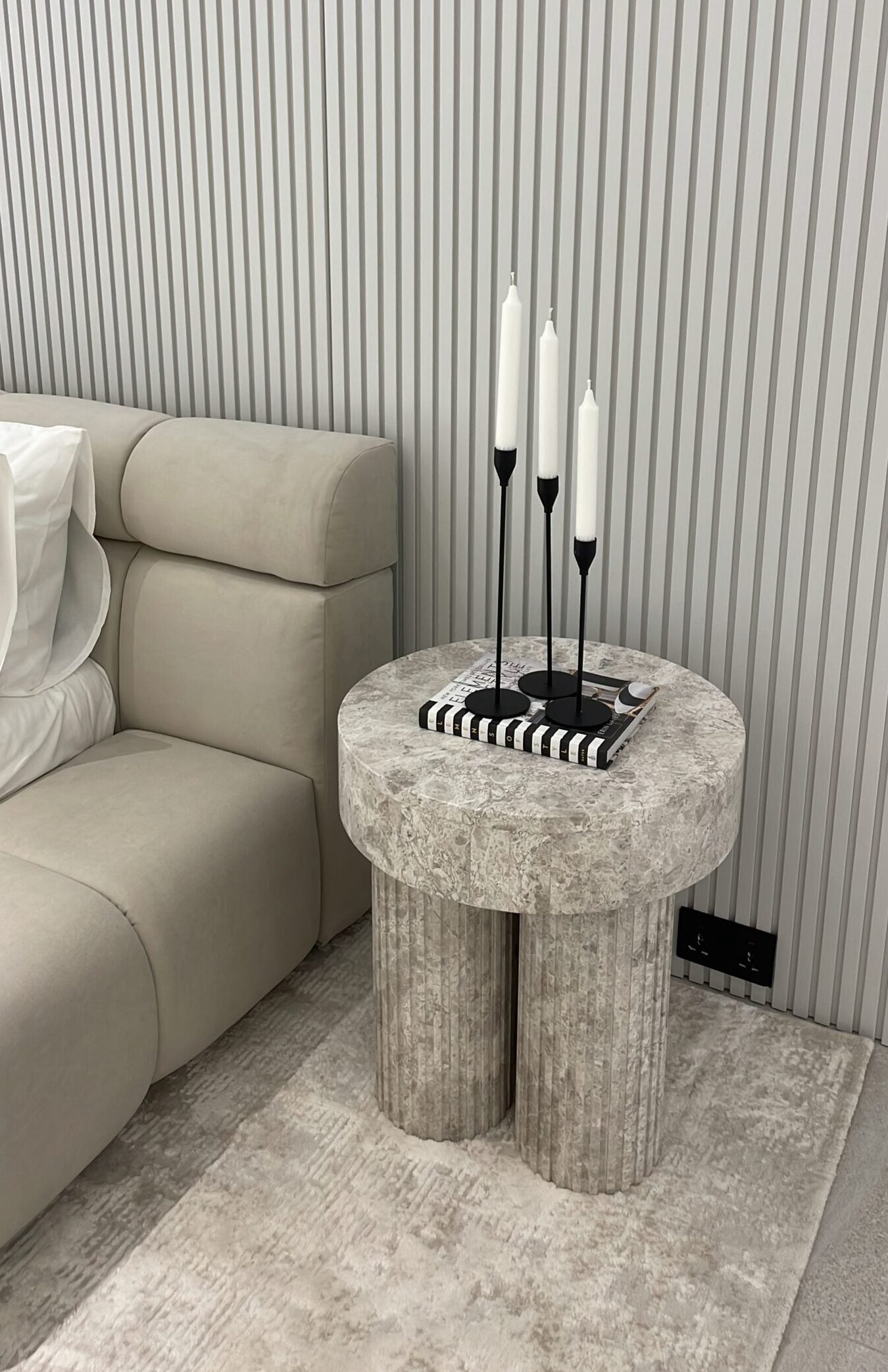 Our Isabella Round Side Table flaunts the marble's sleek and sophisticated appearance. Its range of marble variety with subtle variations and veining patterns delicately combine depth and visual interest to the stone's surface. The fluted design of the three-pillar legs adds architectural detail. It blends aesthetic beauty, functional design, and versatility, making it a stylish and practical addition to any living or bedroom space.