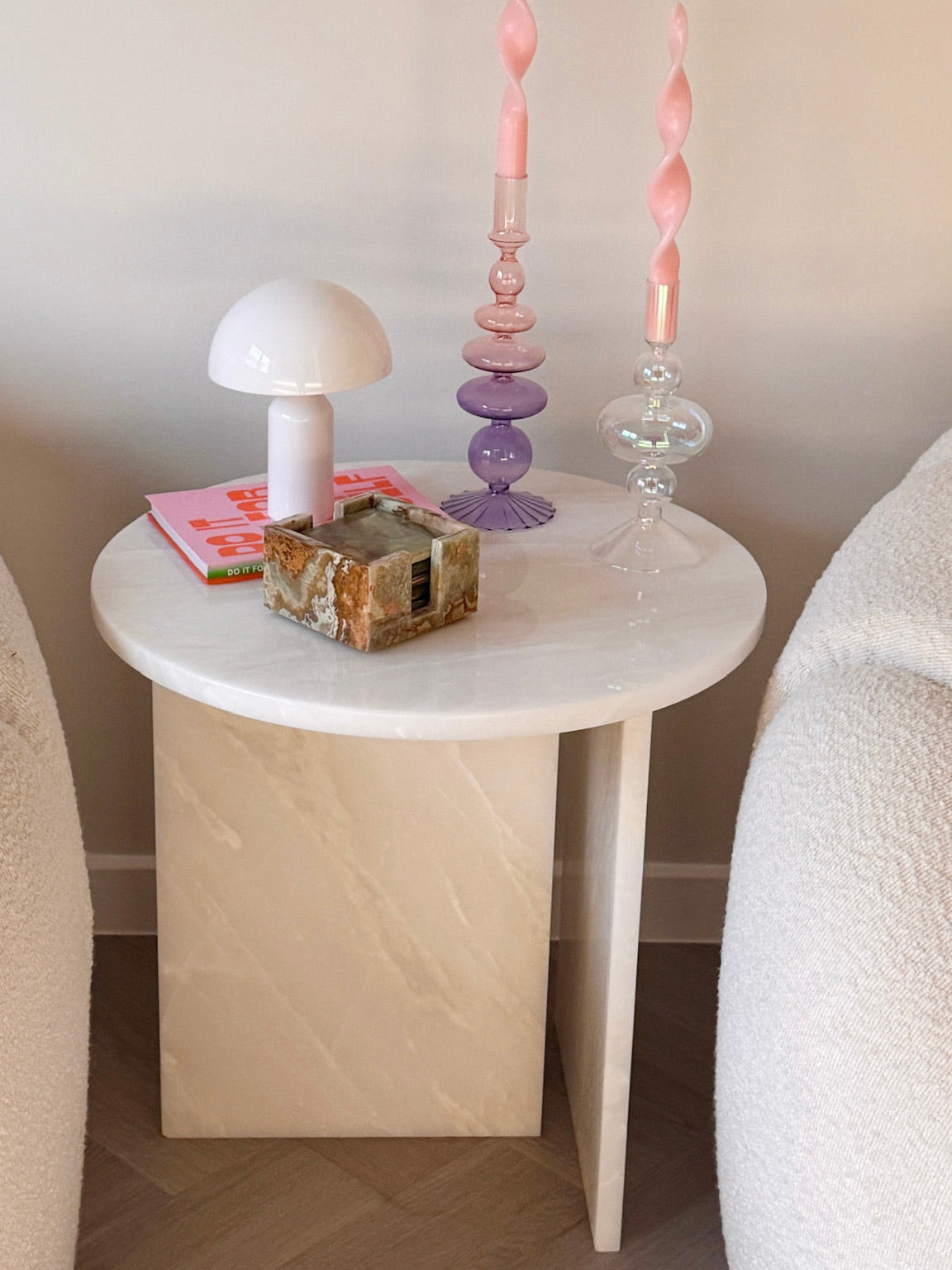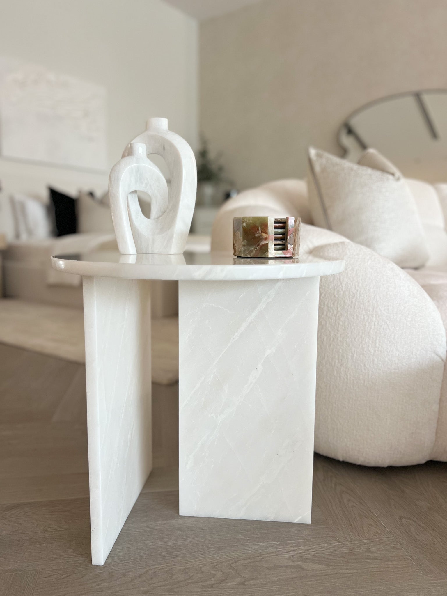 Elevate your living space with the timeless elegance of our Royal Jade Marble Coffee Table. Expertly crafted from exquisite natural stone, this table showcases a harmonious blend of creamy beige hues and delicate veining, creating a striking yet sophisticated statement piece. Its sculptural silhouette features a gracefully rounded tabletop supported by two solid marble slabs, embodying both modern minimalism and enduring luxury.