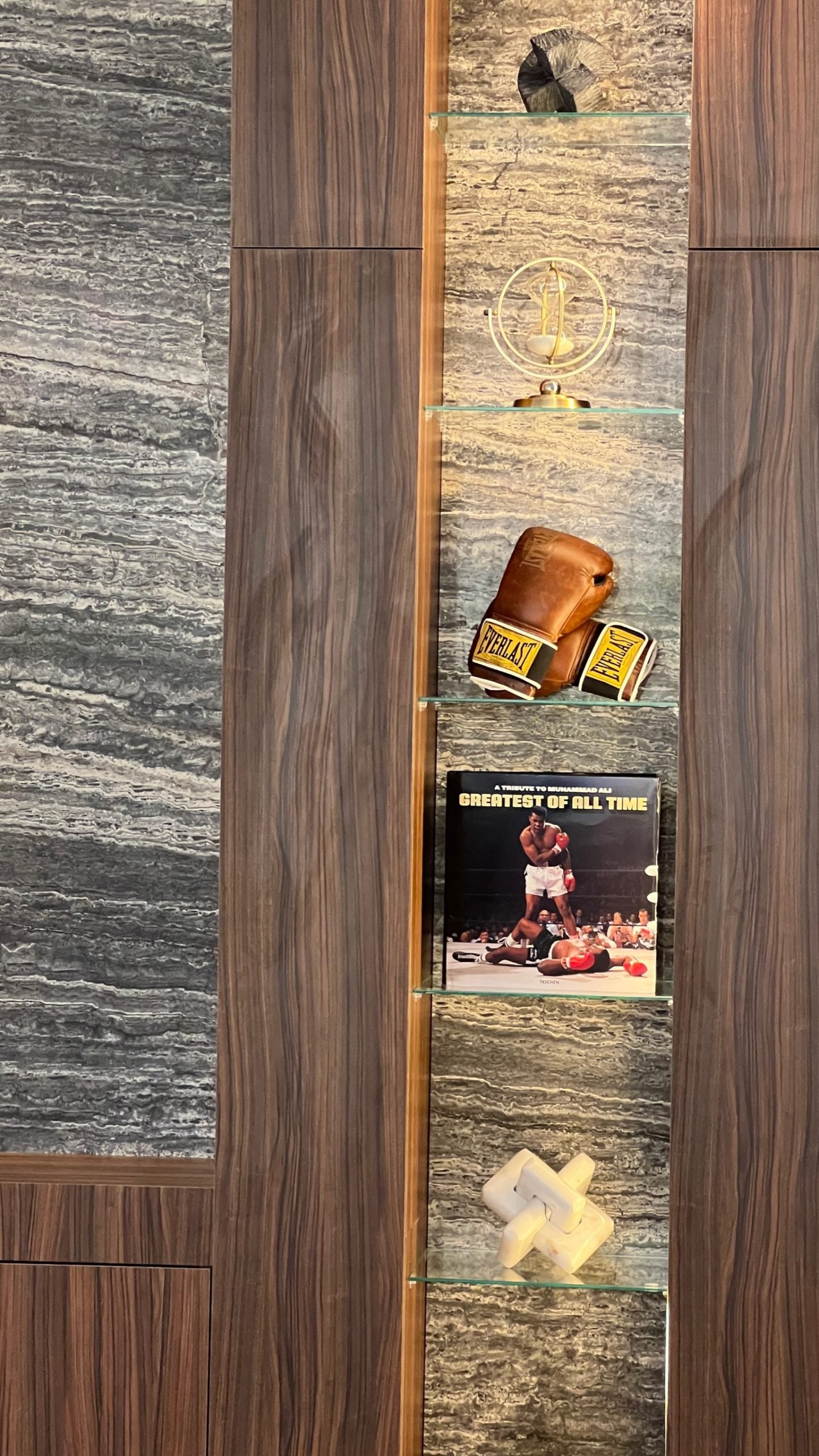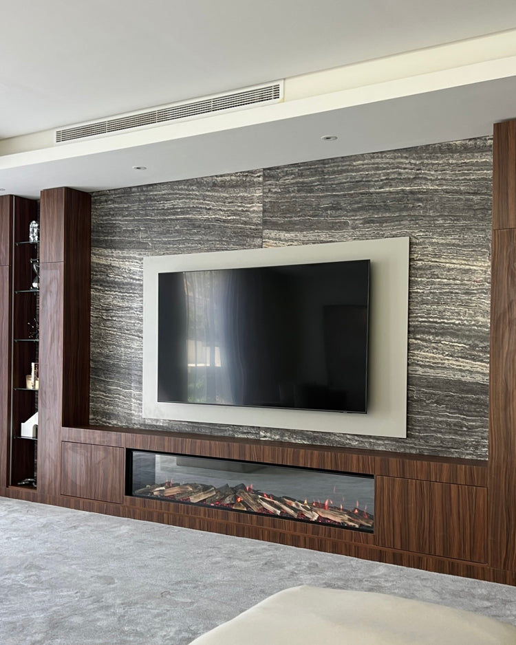 The Jacob Media Wall features the refined elegance of wood and earthy authenticity of travertine. This combination creates a striking contrast of textures elevating the aesthetic of any space. Glass shelves provide unobstructed appreciation of the travertine's elegance. LED lighting also play a crucial role in highlighting the textures and features of our Jacob Wall, enhancing the overall ambiance of the space.