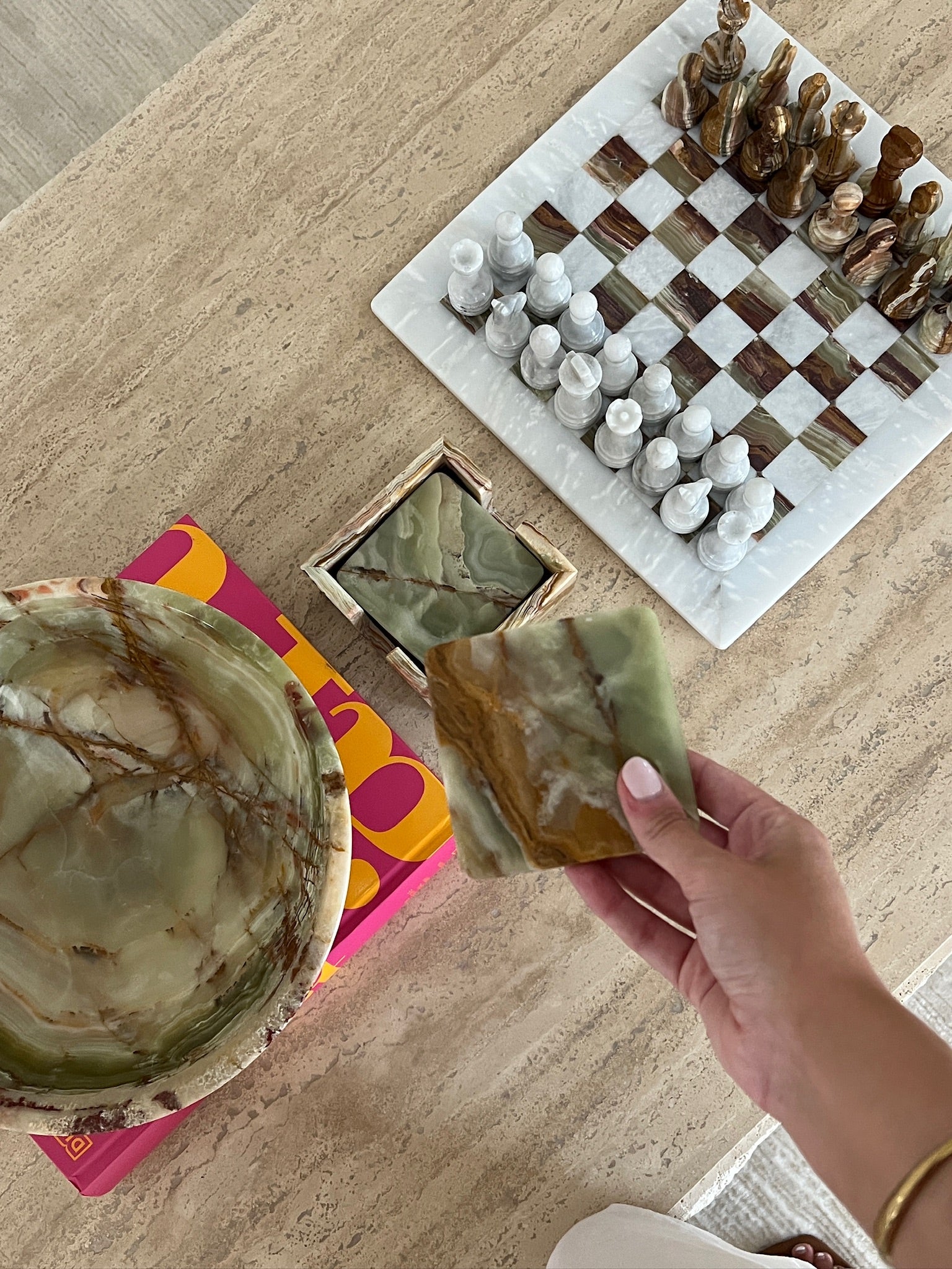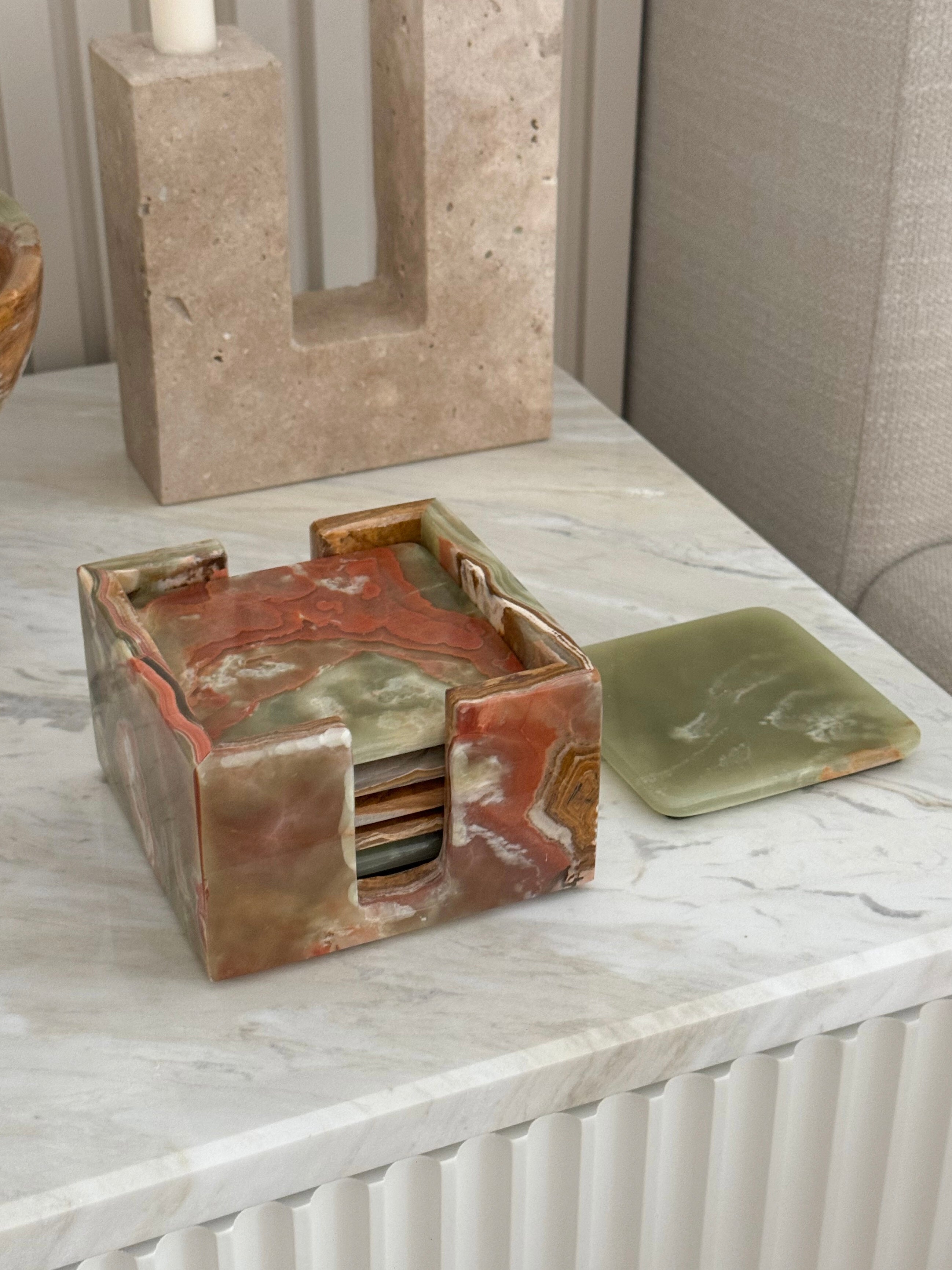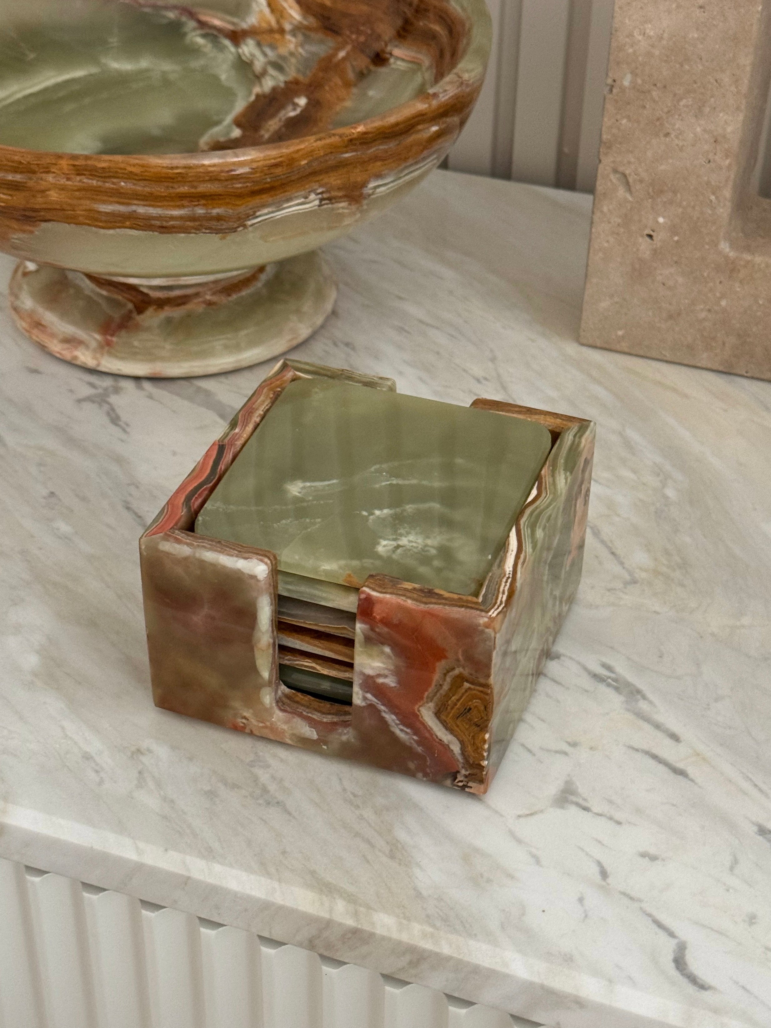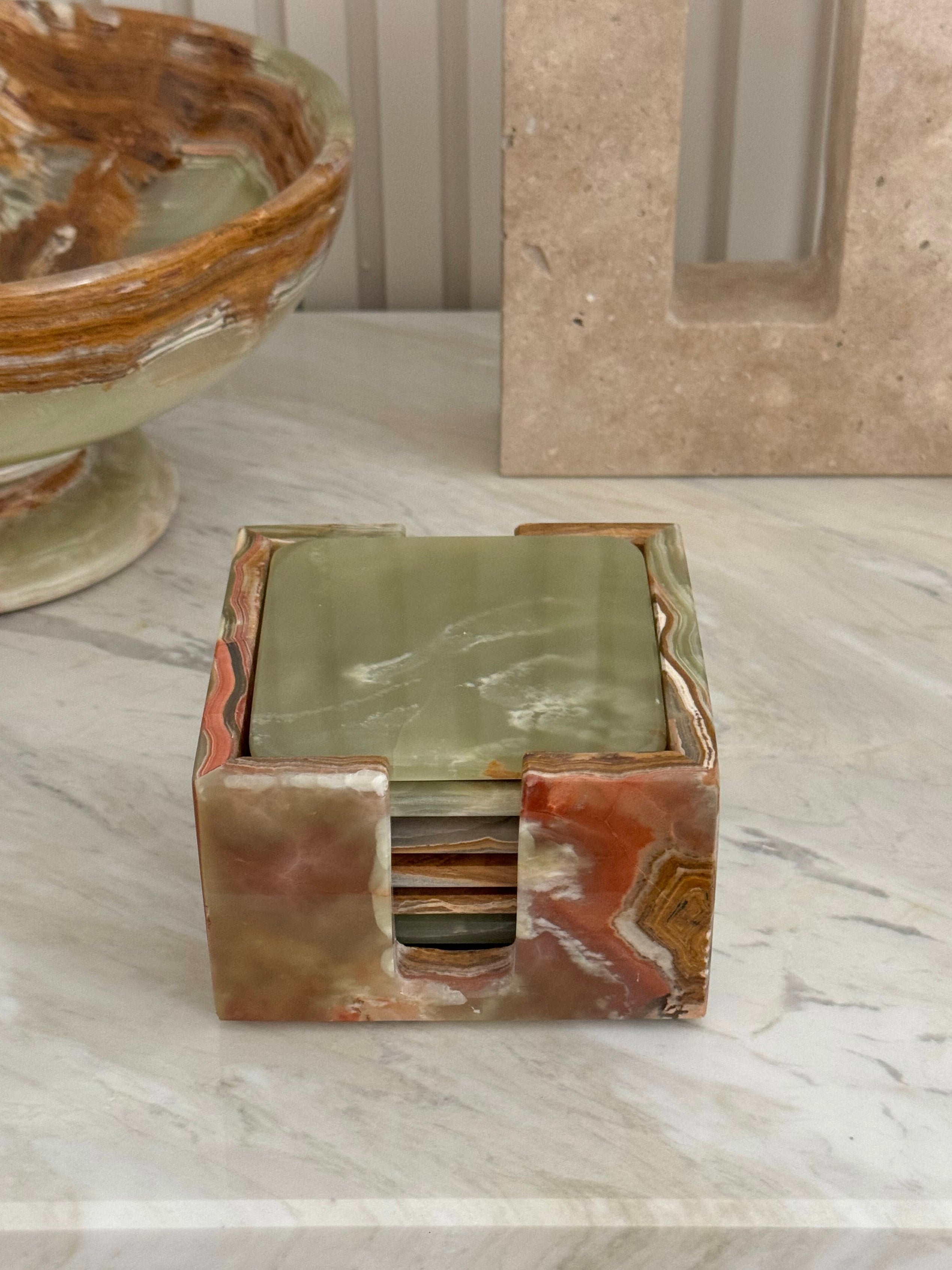Add a luxurious touch of nature to your home with our Jade Square Green Onyx Coasters. Each coaster is meticulously crafted from green onyx, showcasing unique white and brown veining patterns that highlight the natural beauty of the stone. These coasters are designed to be both practical and stylish, providing a sophisticated accent to any table setting.