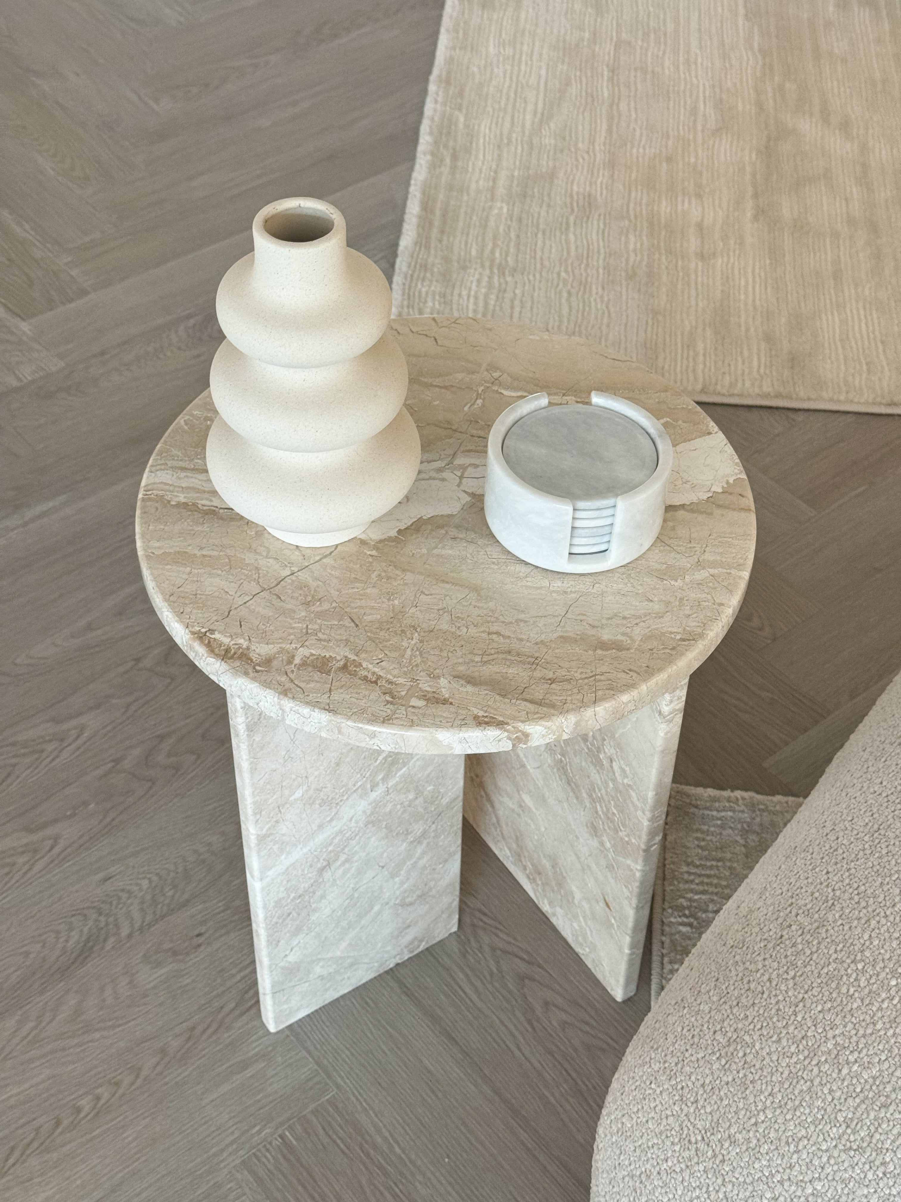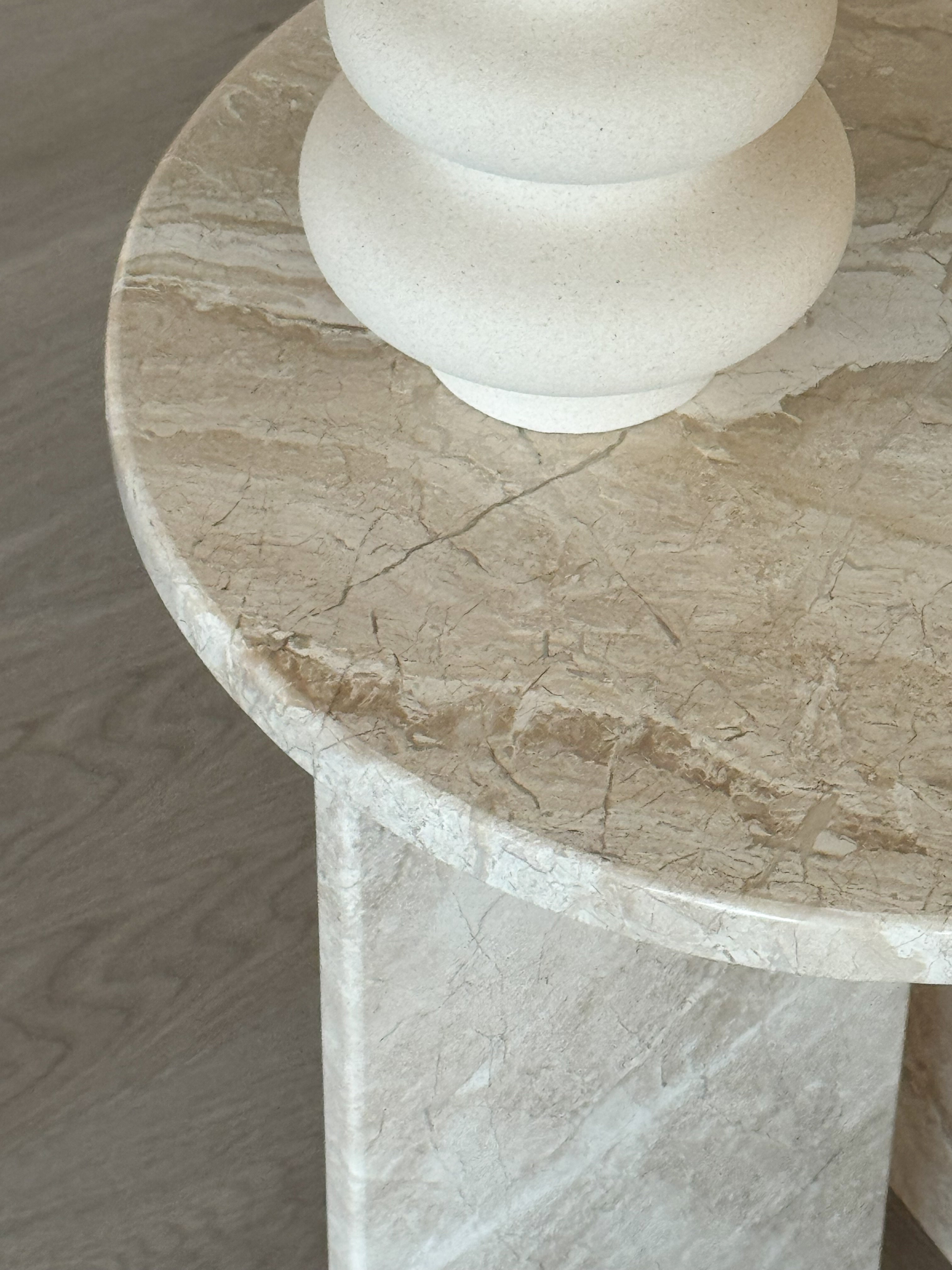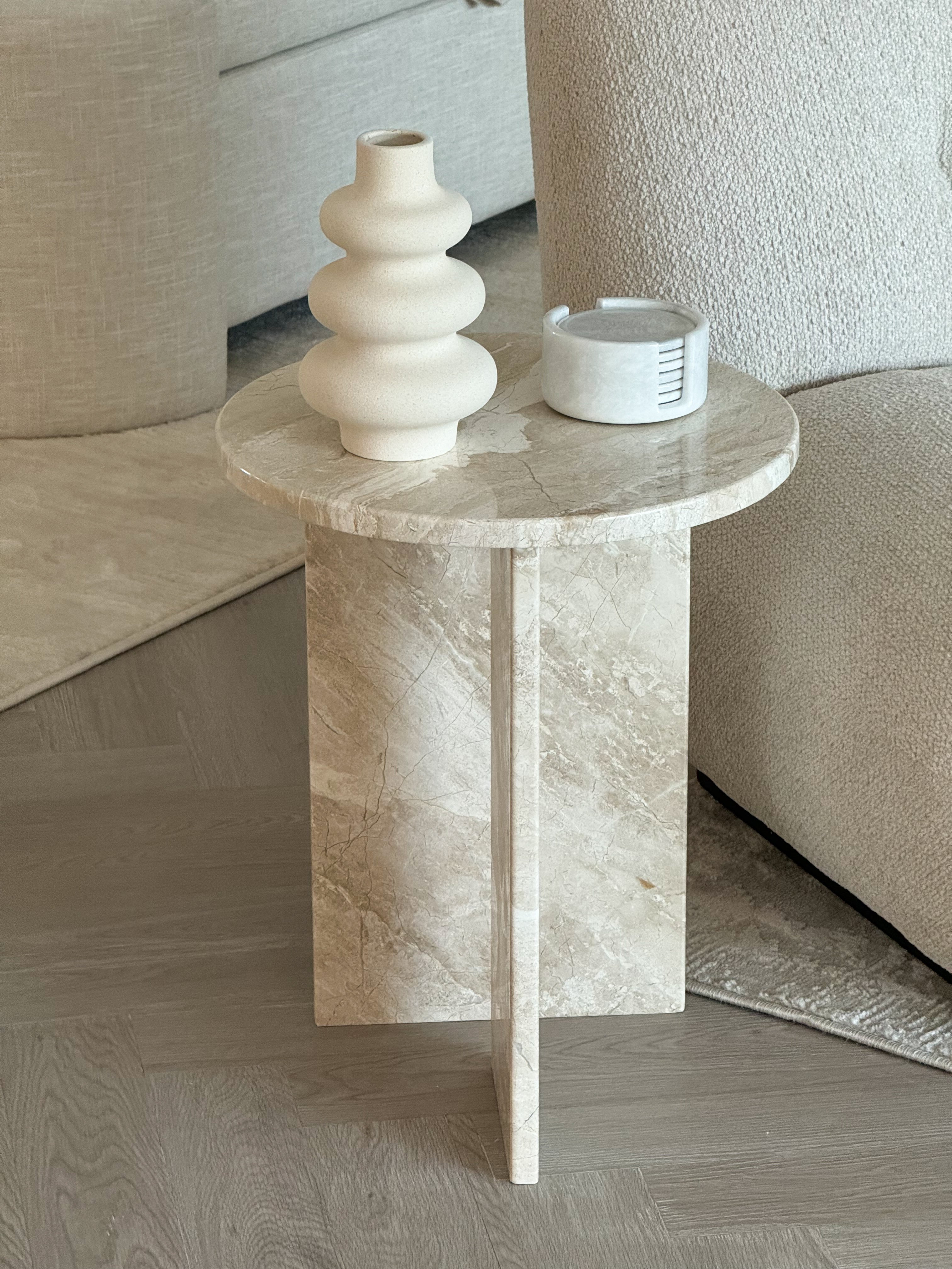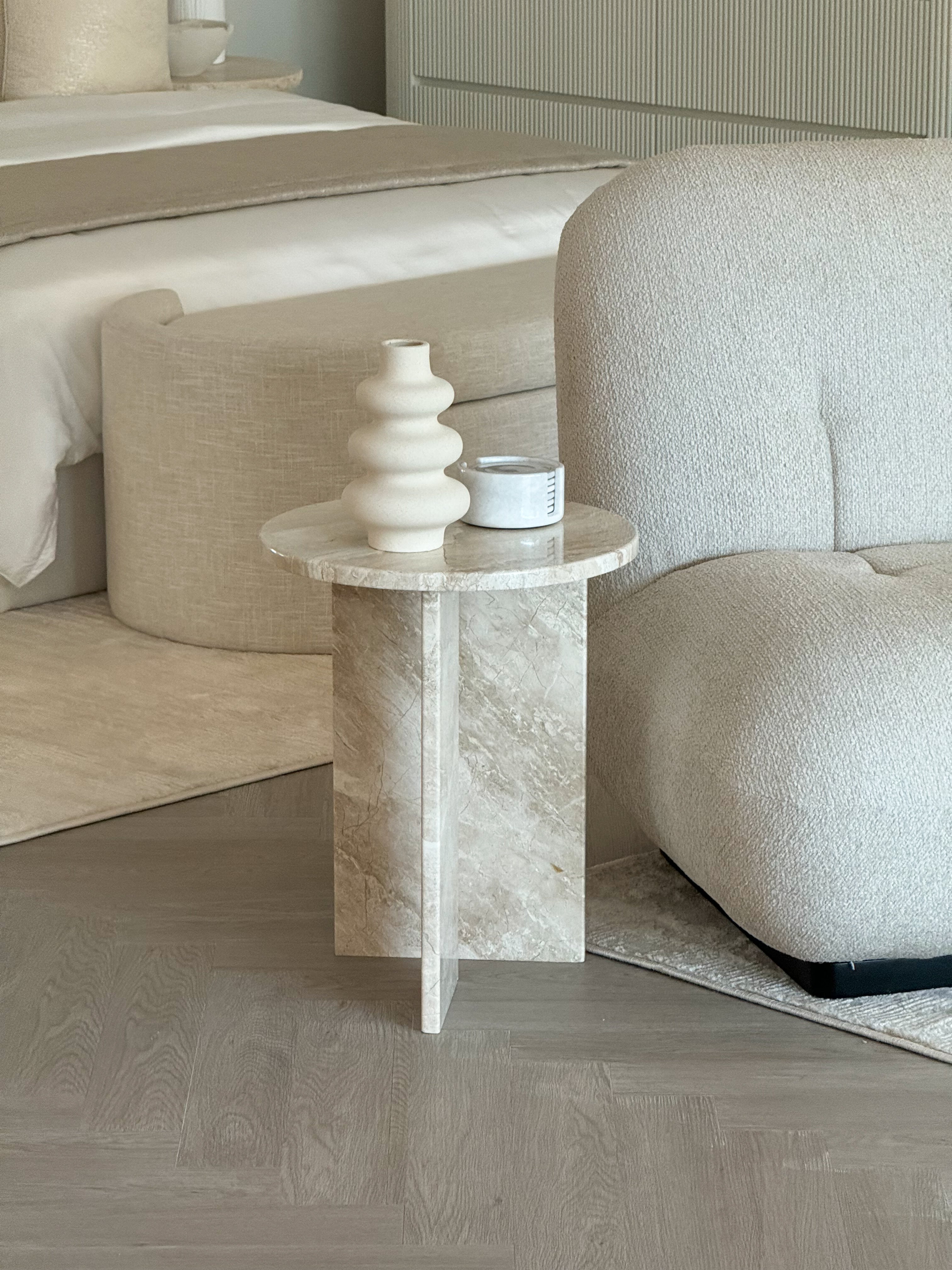 Add a touch of neutral luxury to your home with our stunning Jenna Marble Side Table. Crafted from gorgeous Diana Beige Marble, this exquisite piece will effortlessly complement any space. Featuring a smooth, round top and a base made from two rectangular intersecting marble slabs, its unique design is sure to elevate your home.