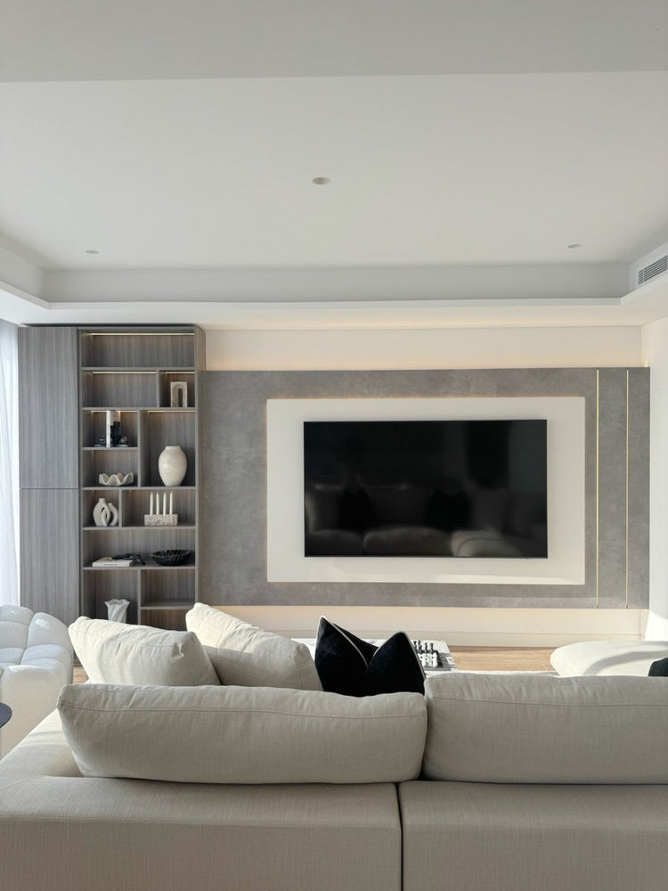 A soft, concrete-inspired finish sets the tone moody, grounded, and beautifully modern. Framed by crisp white trim and subtle gold detailing, the television becomes part of a larger composition, not just a device but a design feature. Hidden lighting casts a gentle glow, adding warmth and dimension without ever demanding attention.