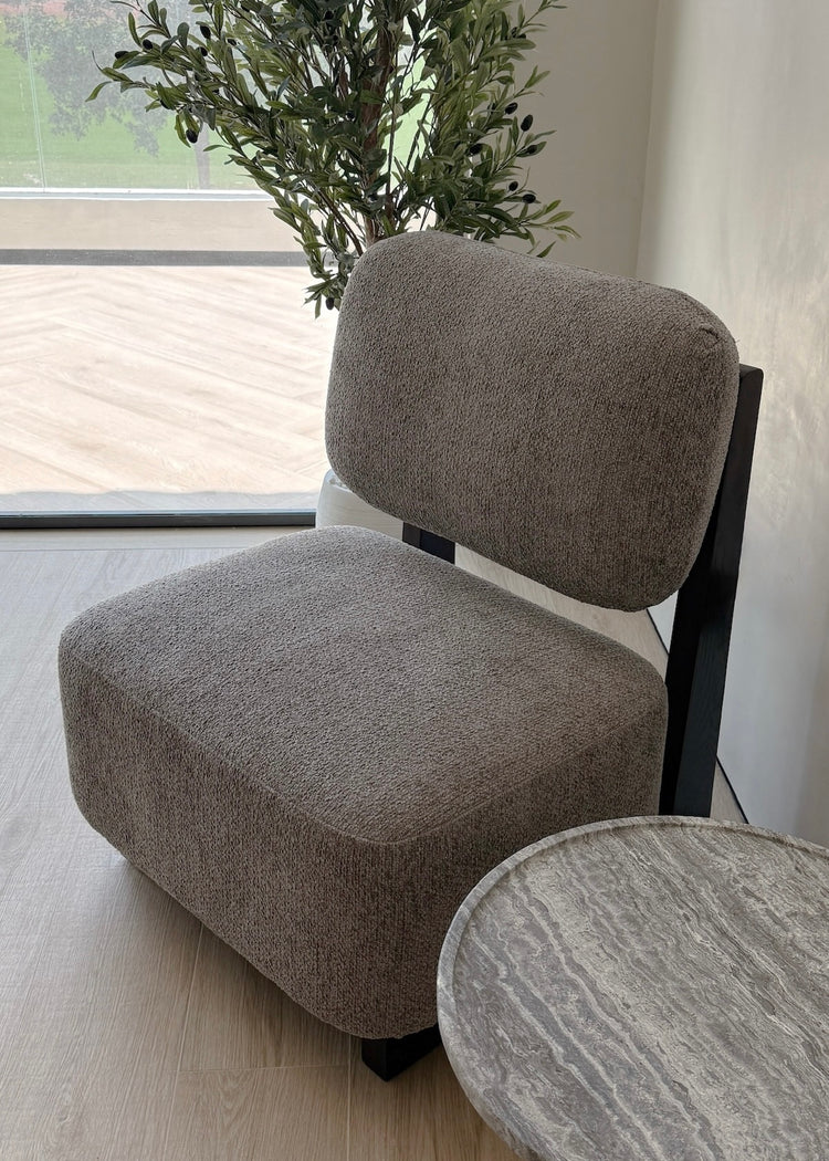 A seamless Jordan Chair with blend of relaxed elegance and modern minimalism. Upholstered in a textured, stone hued fabric and grounded with a sleek dark wood frame, this chair is a quiet statement piece made for interiors that celebrate calm and character.