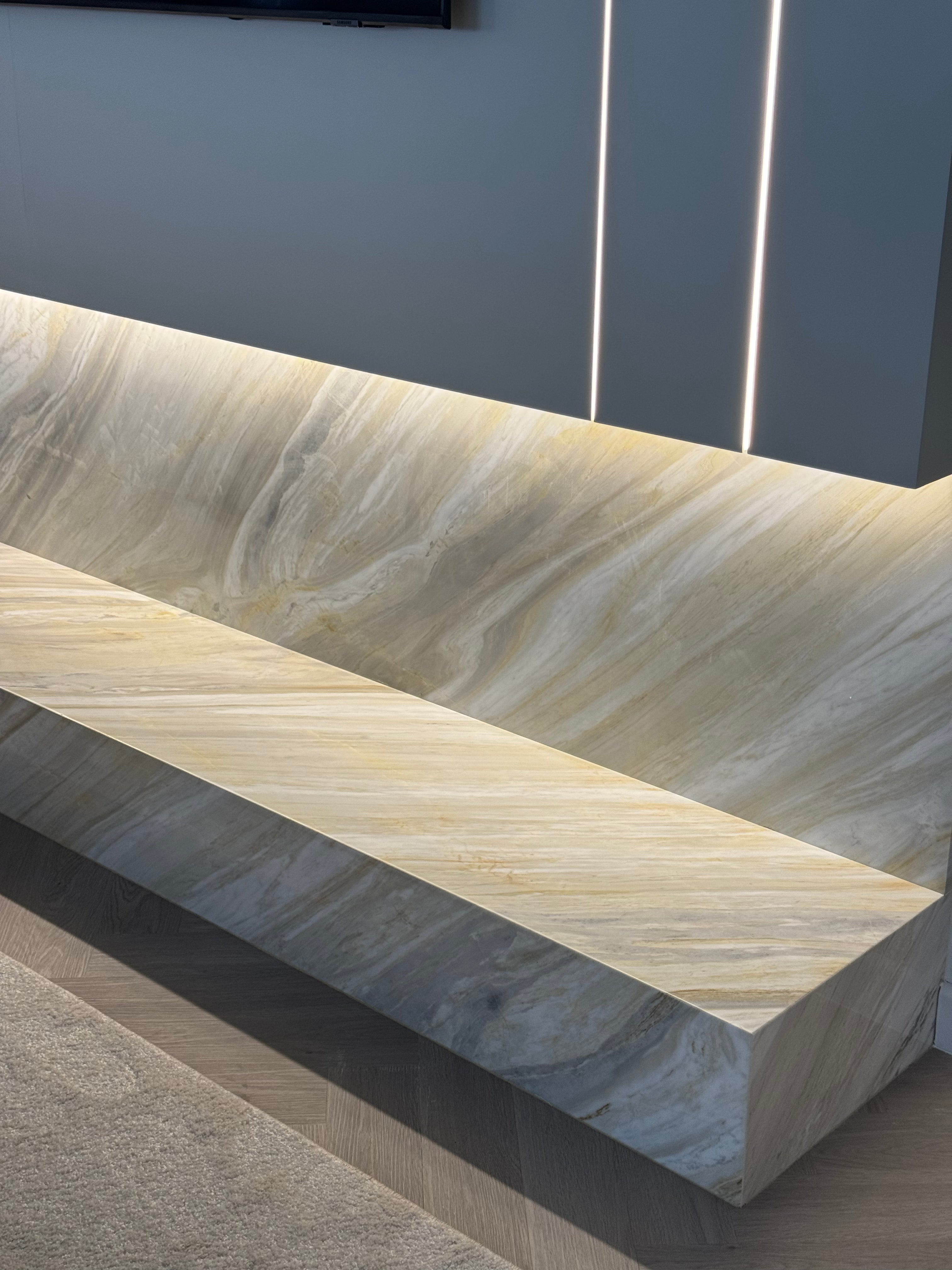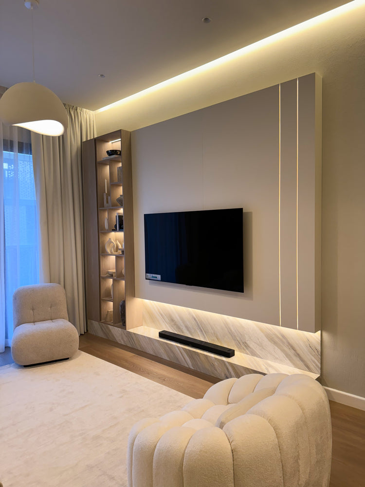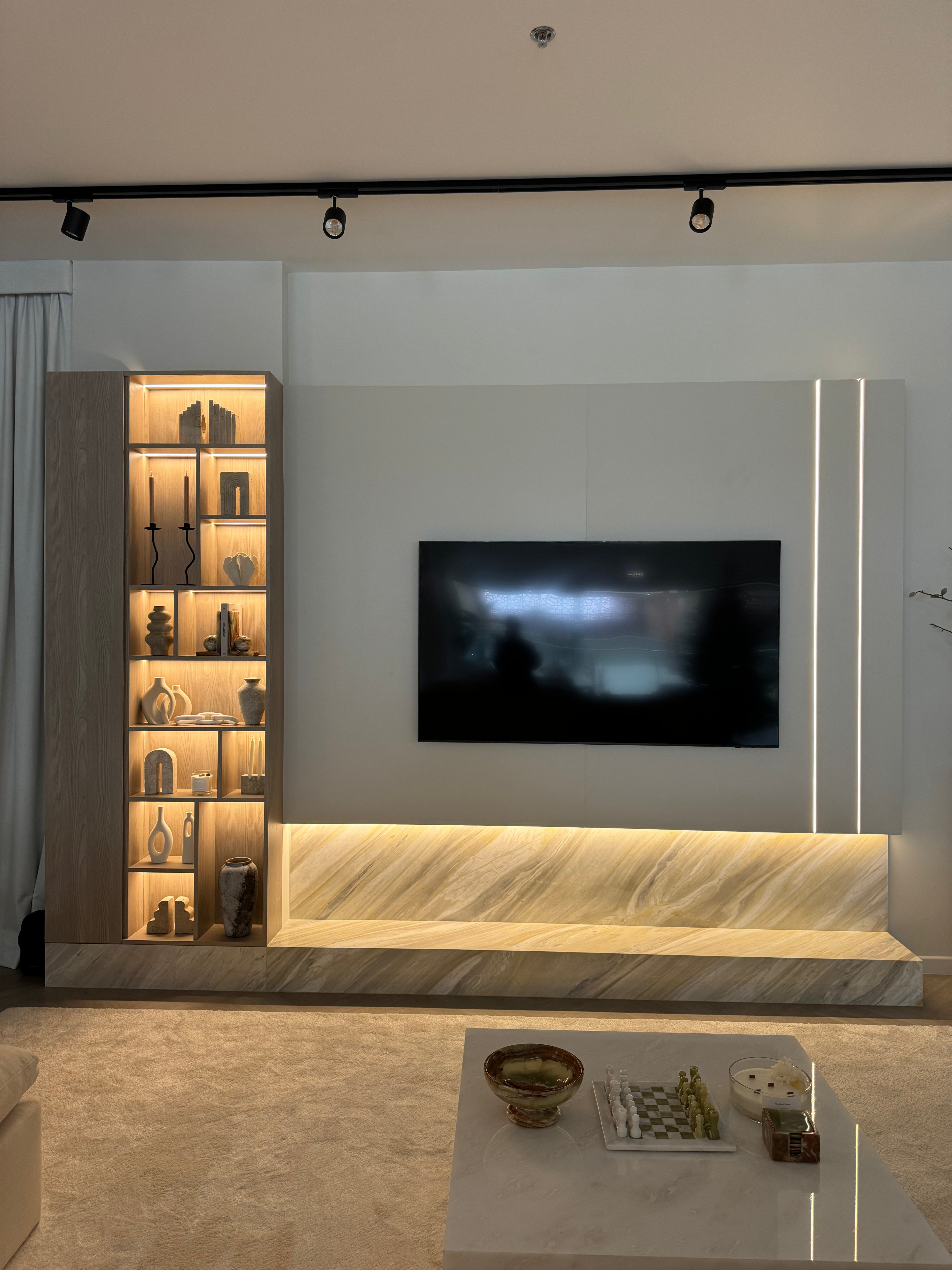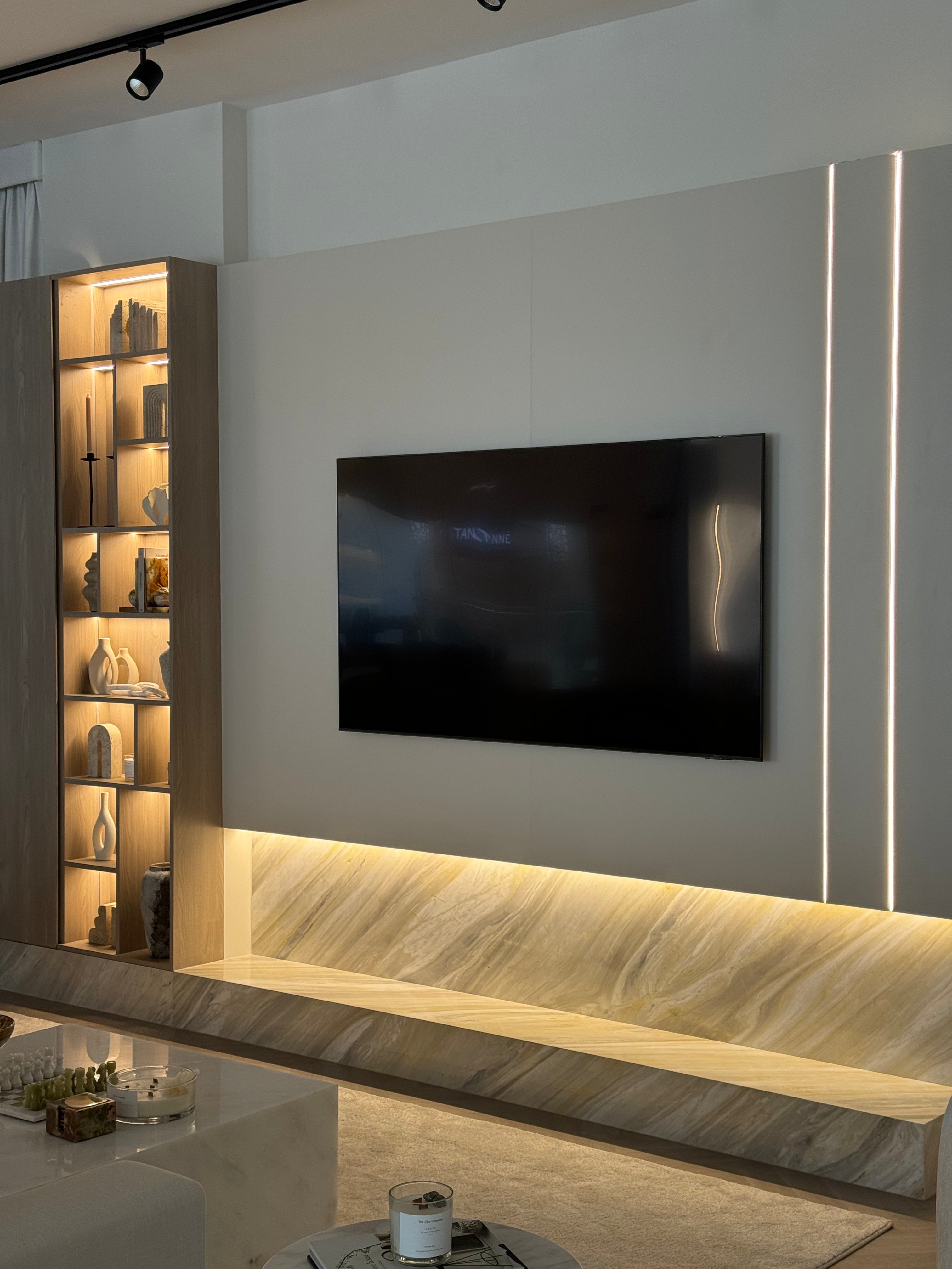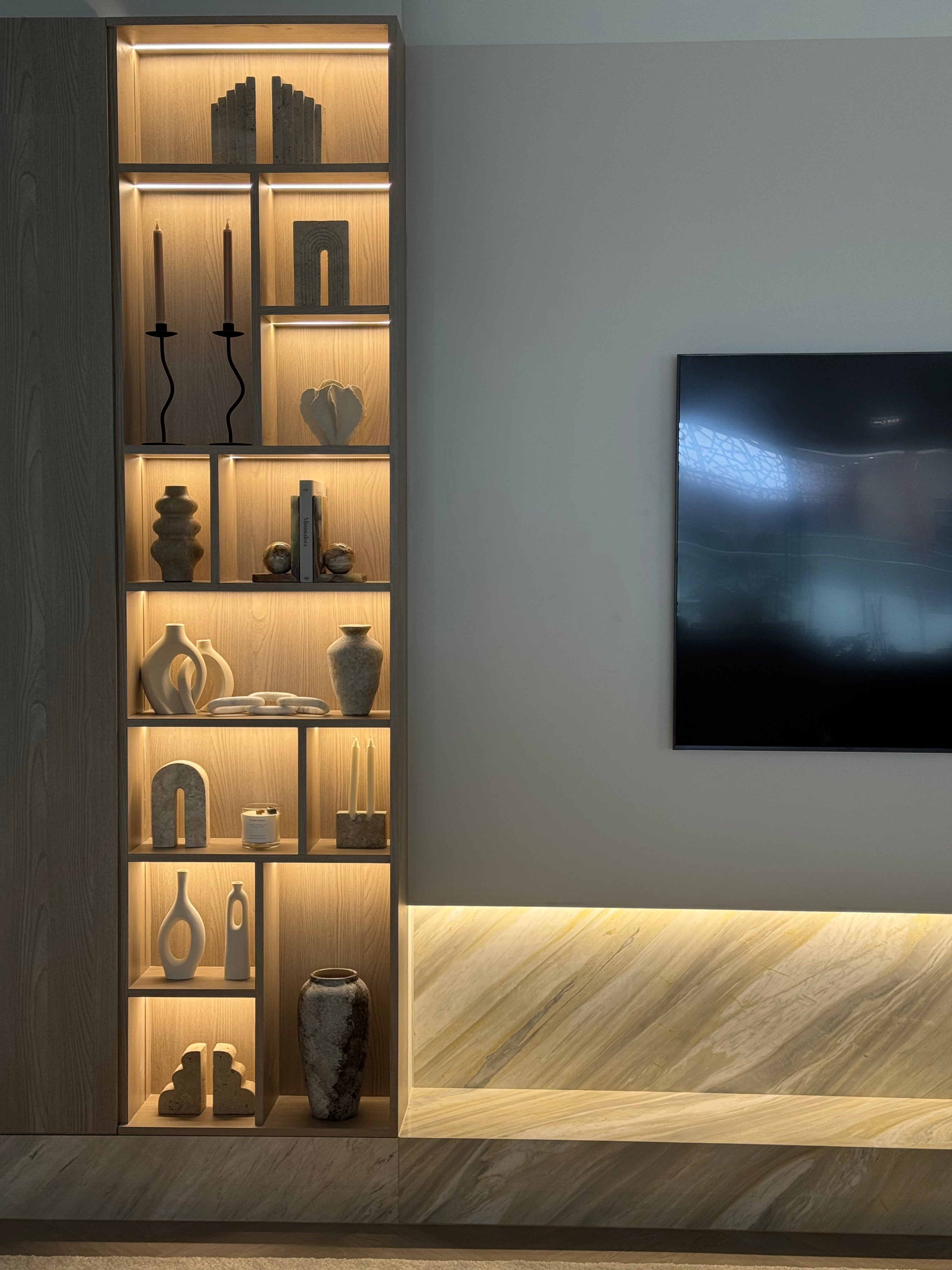 Highlighting the design are two vertical LED strips that add a modern touch, illuminating the marble and shelves with a soft, ambient glow. This carefully curated media wall combines timeless materials and innovative features, creating a contemporary, functional centrepiece for any living room or entertainment space.