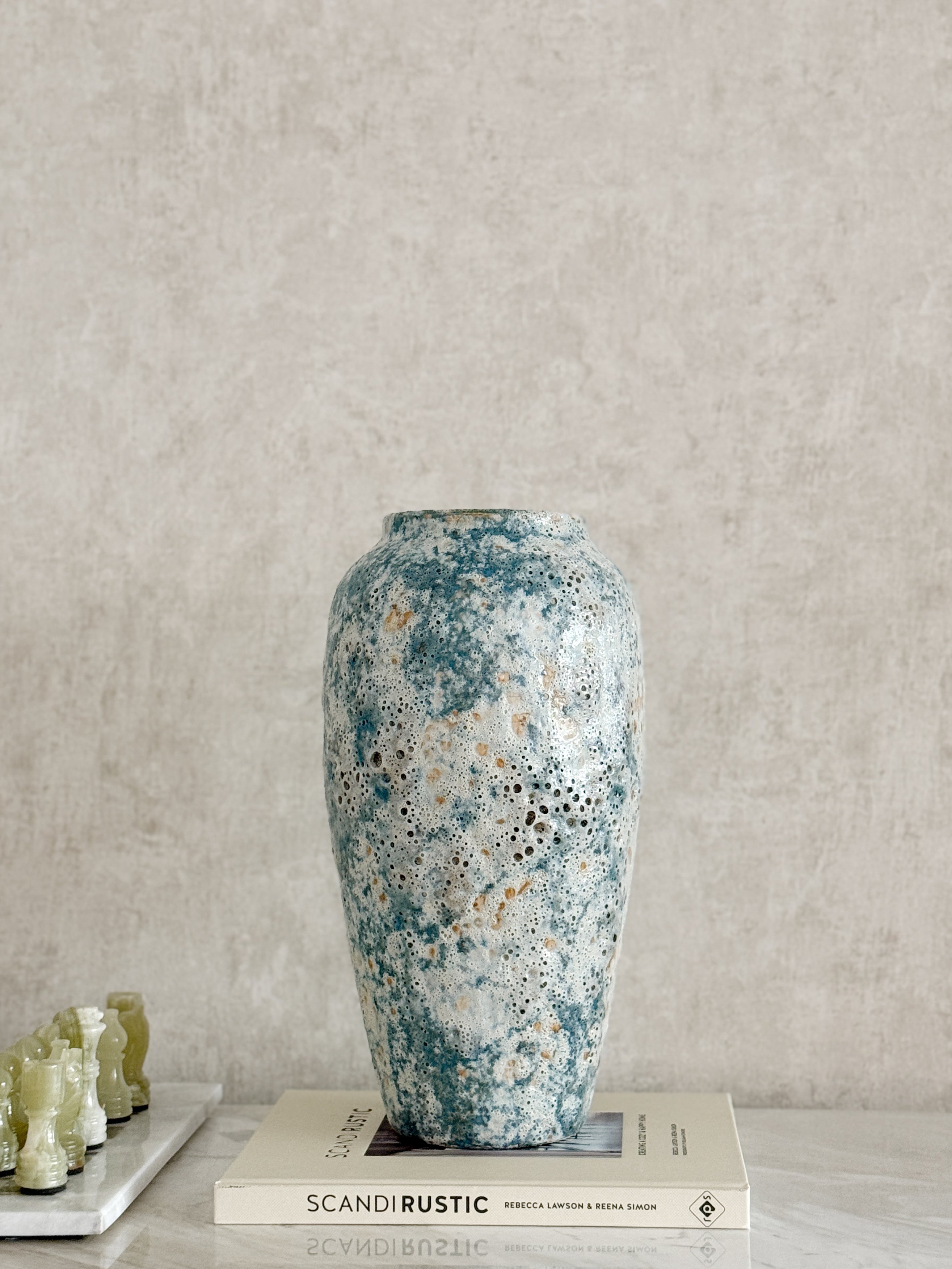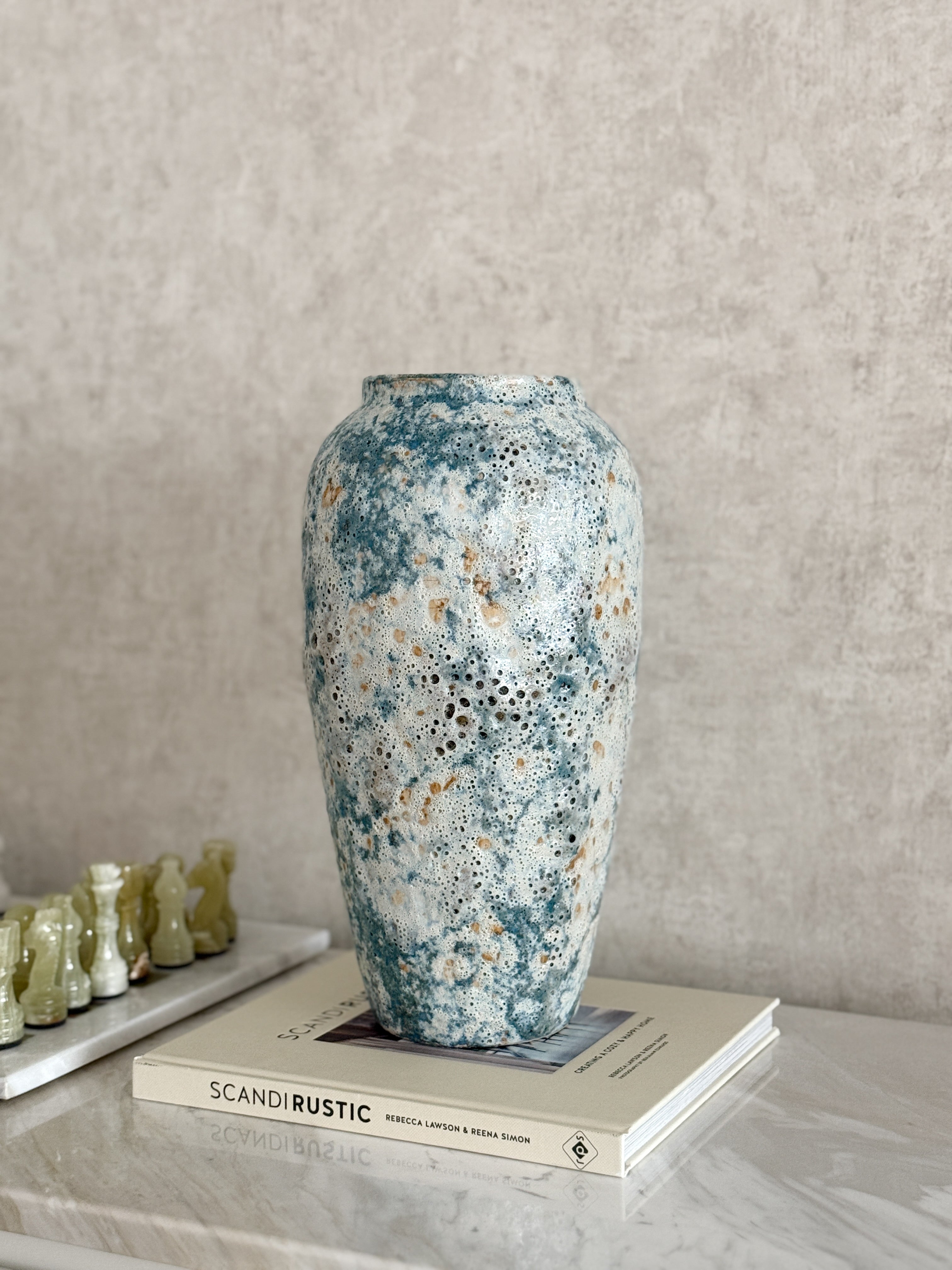 Inspired by the ethereal beauty of coastal landscapes, the Kailani Large Vase is a fusion of organic artistry and refined craftsmanship. Its textured ceramic surface, reminiscent of weathered sea rocks, is adorned with a unique blend of cool blue, earthy taupe, and subtle ivory tones, creating an effortlessly sophisticated aesthetic. The vase’s sculptural silhouette and artisanal glaze give it a timeless, one-of-a-kind appeal, making it a captivating accent for any luxury interior. Whether styled as a standalone statement or paired with dried foliage, this piece brings a sense of understated opulence to modern and classic spaces alike.
