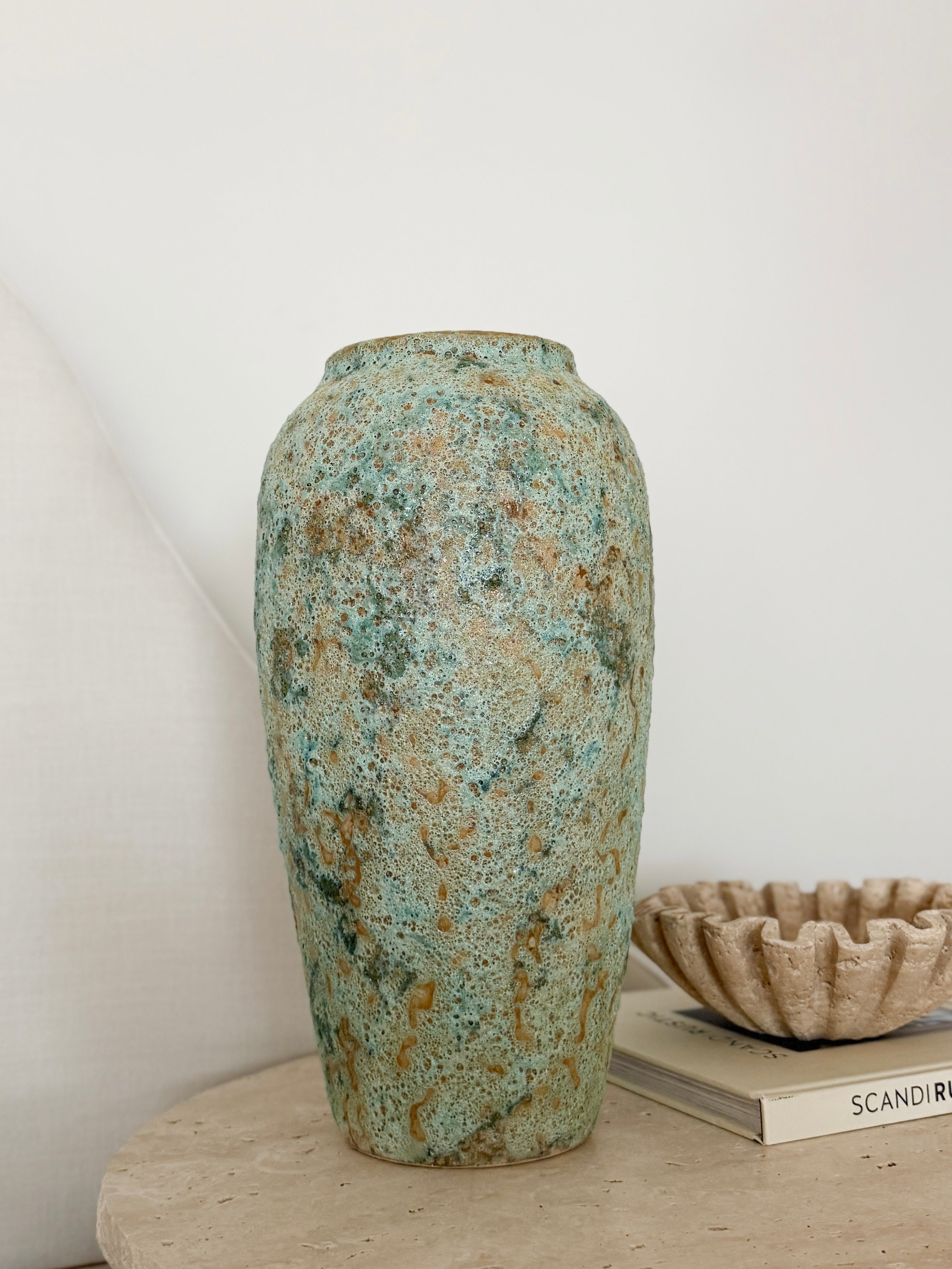 Embodying the perfect harmony between nature’s textures and timeless sophistication. Kaleen Large Vase Crafted from the finest ceramic, its earthy turquoise and bronze patina evokes the essence of weathered stone, reminiscent of ancient relics refined by time.