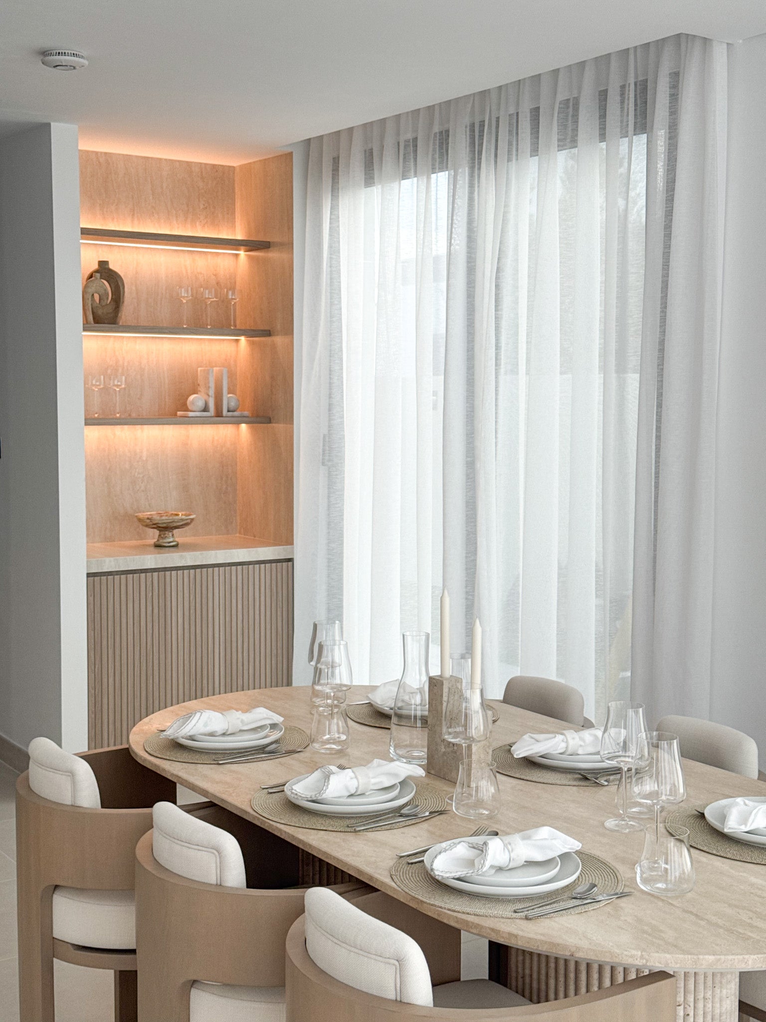 Crafted with meticulous attention to detail, the Kate Built-In Bar features vertically fluted cabinetry, premium wood finishes, and integrated ambient LED lighting that softly illuminates display shelves. The balanced contrast between clean lines and organic materials delivers a serene yet opulent aesthetic, perfectly complementing upscale dining and entertaining spaces.