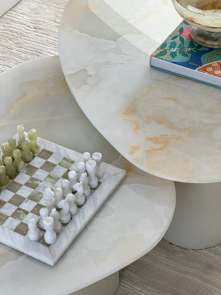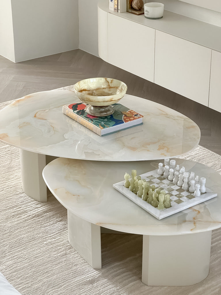 Discover the perfect blend of contemporary elegance and timeless luxury with our two nesting coffee tables. Featuring a stunning light onyx top with a unique asymmetrical design, these tables offer a sophisticated yet minimalist aesthetic. The bold, chunky legs add a touch of modern flair, making them a statement piece for any upscale living space. With their trending design and understated charm, these nesting tables elevate your home décor while maintaining a sense of calm and refinement. Ideal for those who appreciate quality craftsmanship and a refined sense of style.