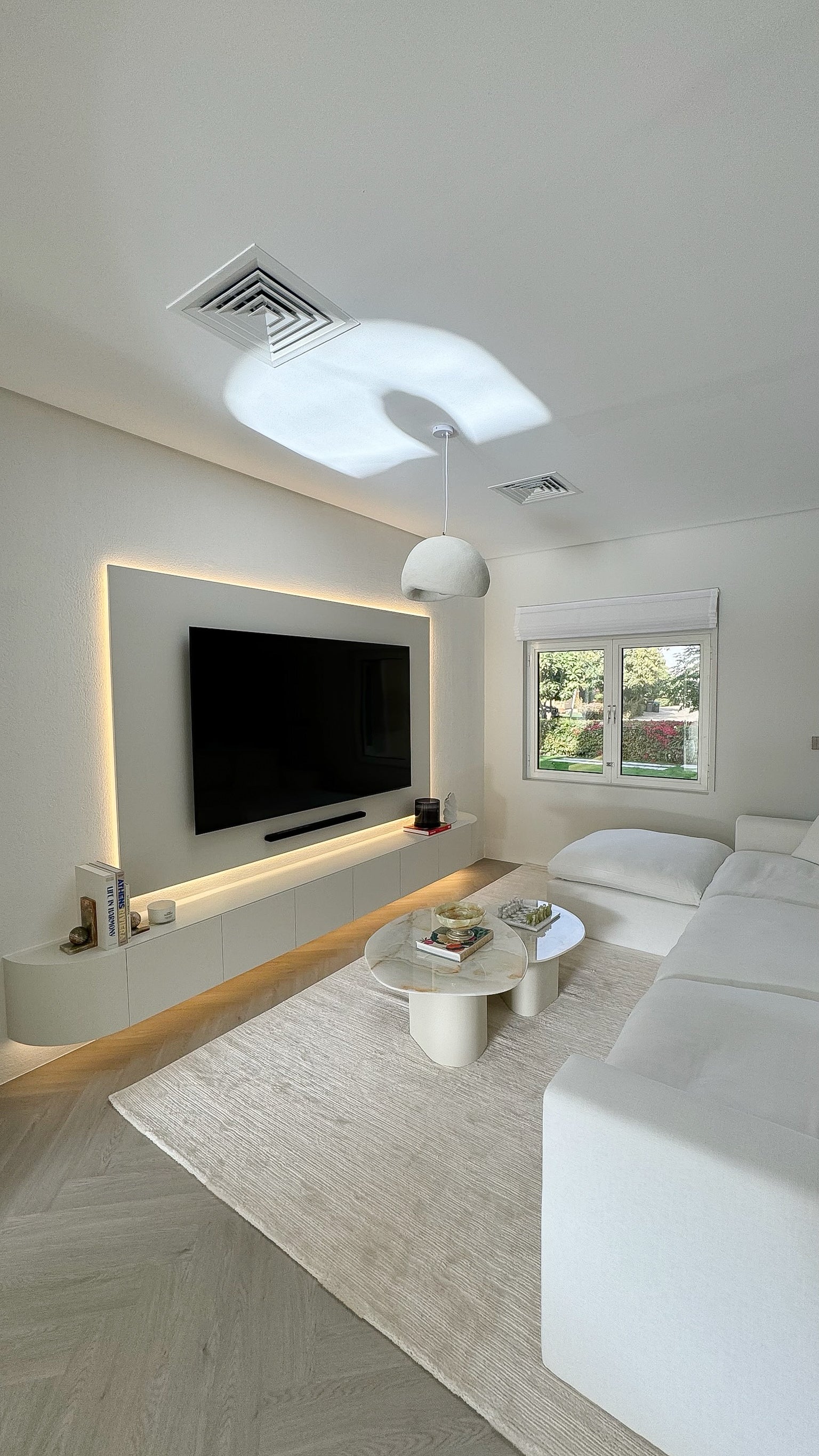 This bespoke media wall seamlessly blends sophistication with functionality, offering a refined focal point for contemporary living spaces. The design features a sleek, wall-mounted television set against a custom-built recessed panel, enhanced by soft, ambient backlighting that creates a warm and inviting atmosphere. A floating console, finished in a muted neutral tone, provides ample storage while maintaining a clutter-free aesthetic. Thoughtfully styled with curated décor and books, it exudes understated elegance.