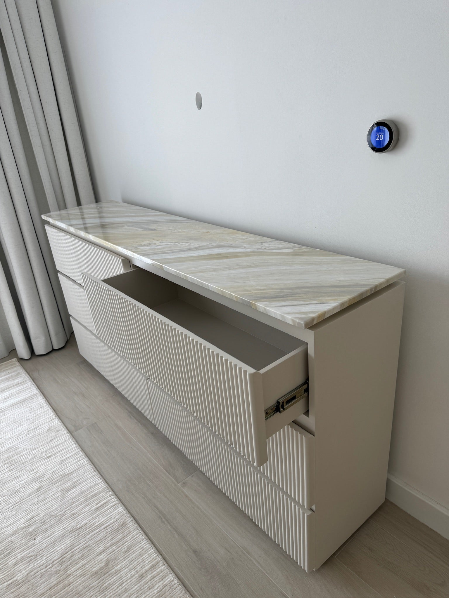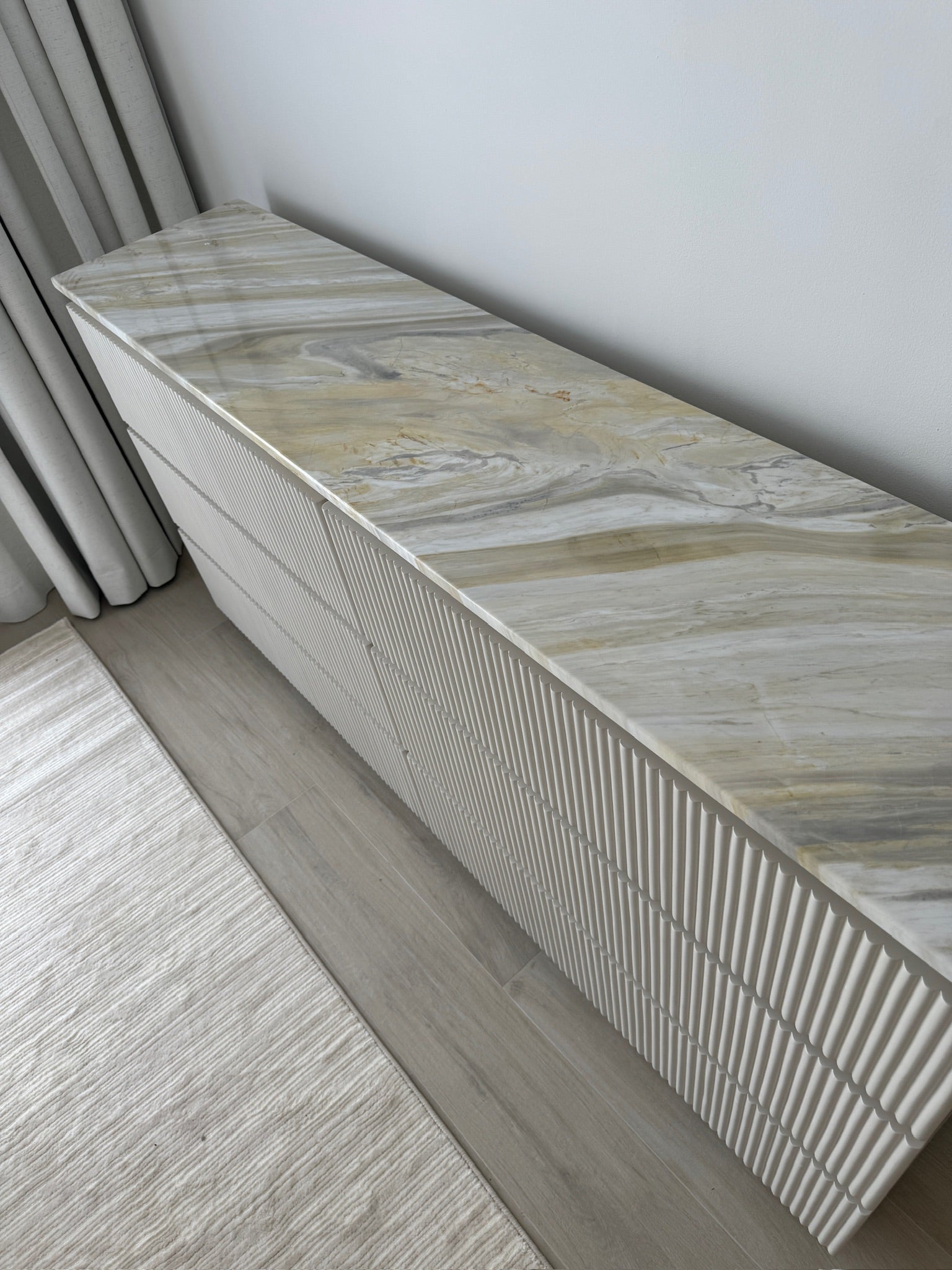 The Lena Ajax Gold Marble Chest of Drawers with clean cut straight edges is giving sleek and chic living. Combining the luxurious marble top with fluted design creates a striking juxtaposition of materials and textures, resulting in a side table that not only serves a functional purpose but also serves as a statement piece in any room. Perfect to complement a wide range of interior styles, from classic to contemporary, adding a touch of glamour and sophistication to the space.