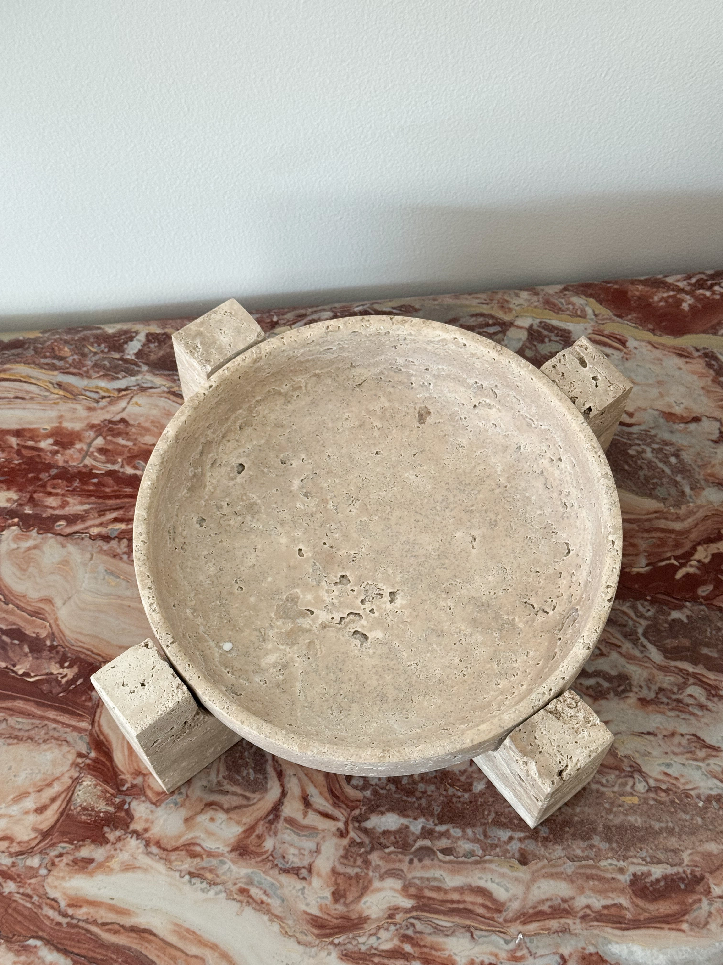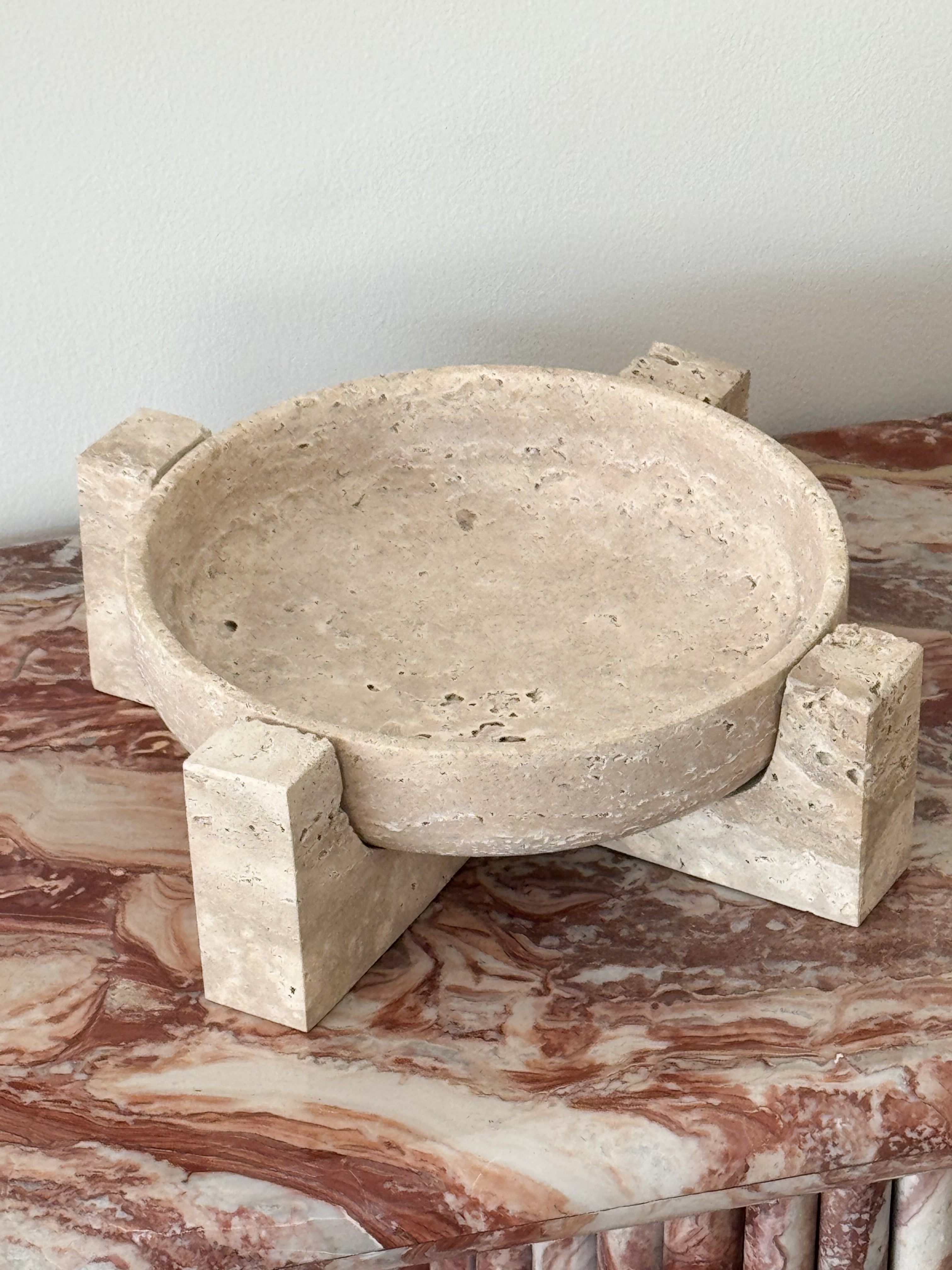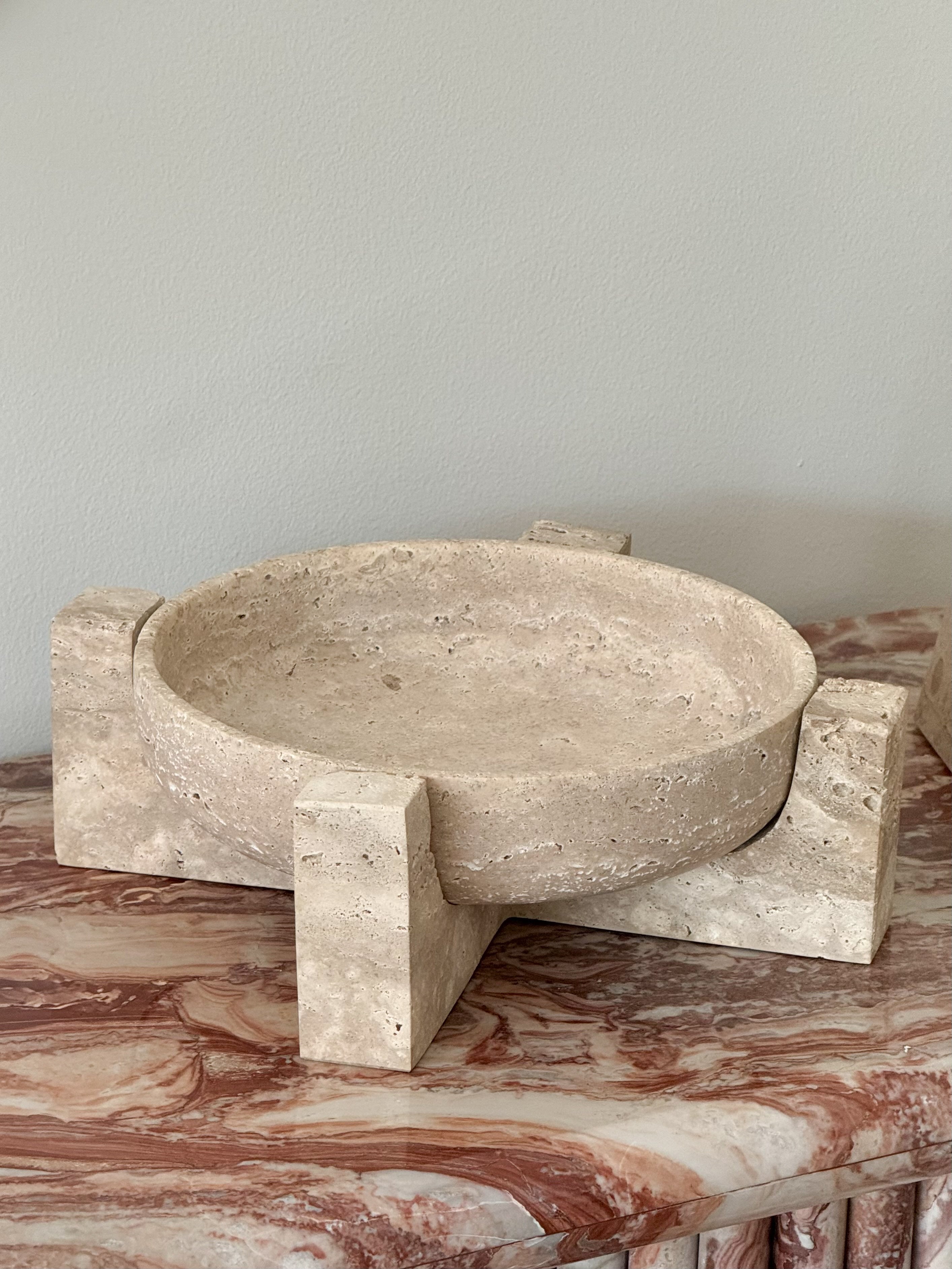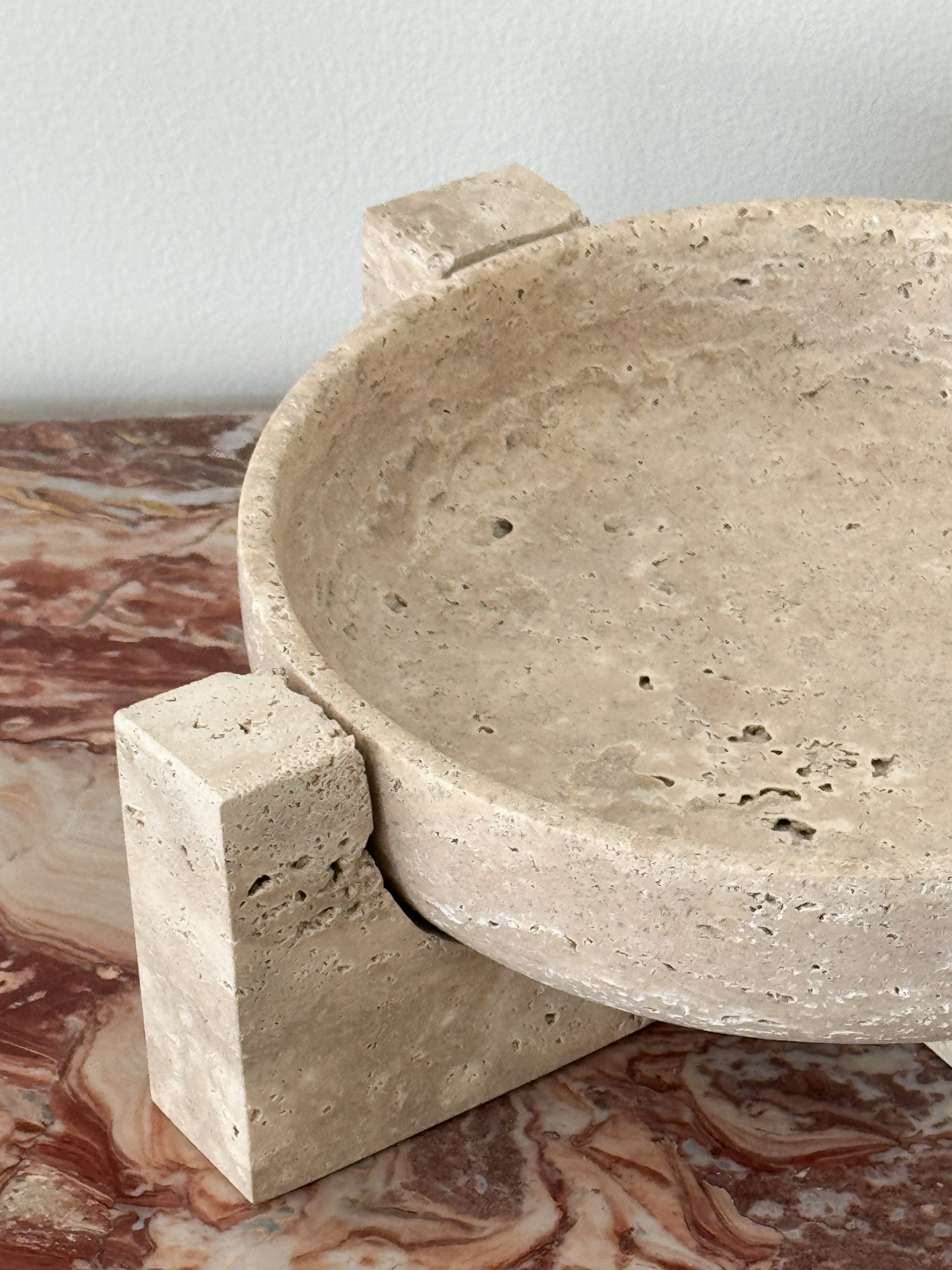 The Lilian round travertine bowl sits within a sleek square holder, blending organic curves with clean, geometric lines. The smooth, matte surface of the bowl in soft beige tones contrasts beautifully with the sharp angles of the square base, creating a balanced, minimalist design.