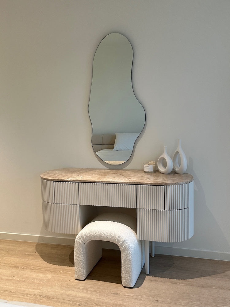 The Lola Diana Beige Marble Dressing Table has rounded ends on either side, creating a semi-circular or crescent-like appearance. This softens the overall look and makes it a visually appealing piece. Combining the luxurious marble top smooth surface and subtle veining with round fluting adds visual interest and texture to the piece. It exudes a sense of warmth and sophistication, making it a versatile choice for various interior styles.