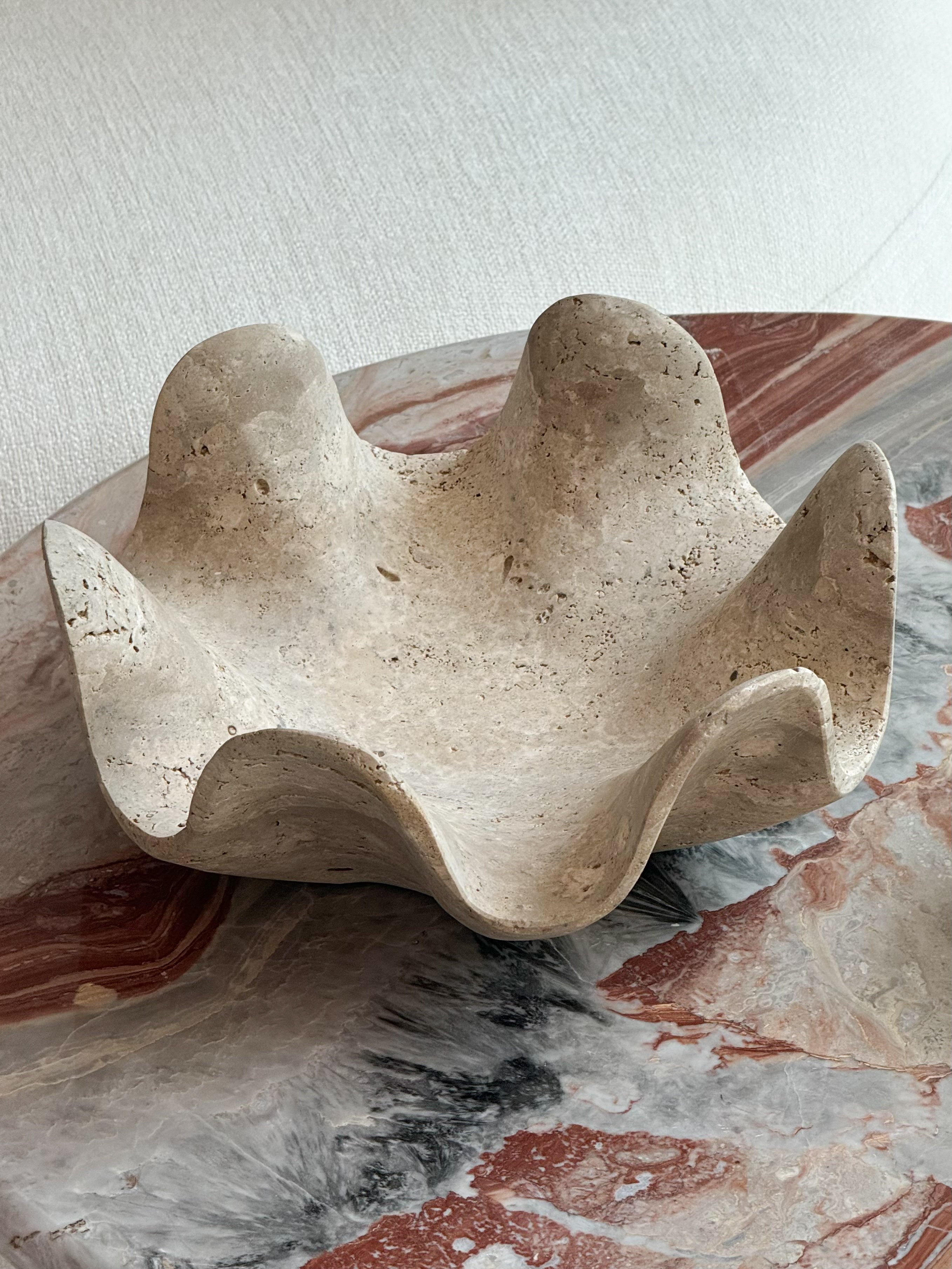 The Lucianna travertine fruit bowl features an abstract, wave inspired design that will elevate your home. The smooth, beige surface highlights the unique texture of the stone, while the soft, organic shape creates a sculptural focal point for any space.