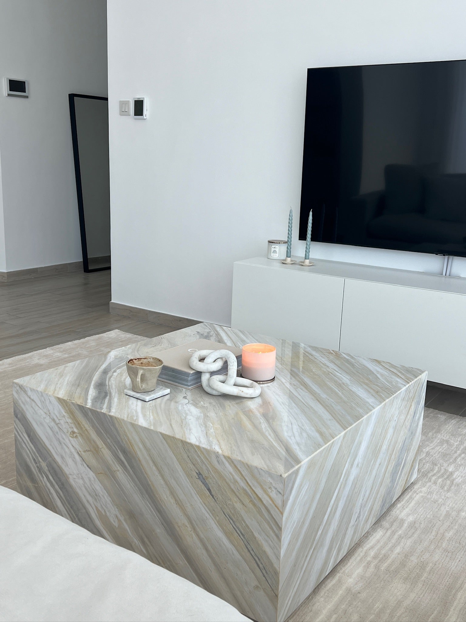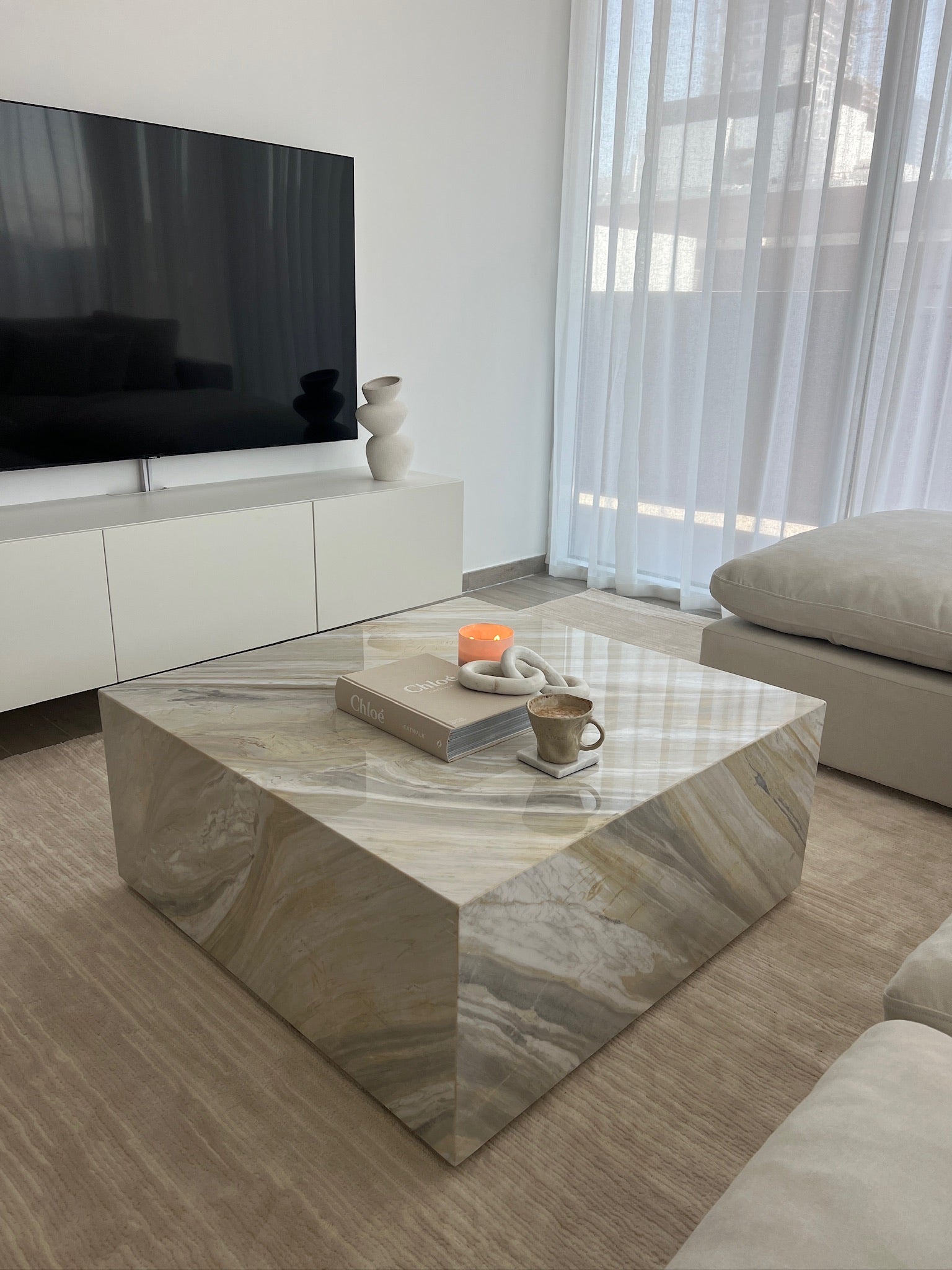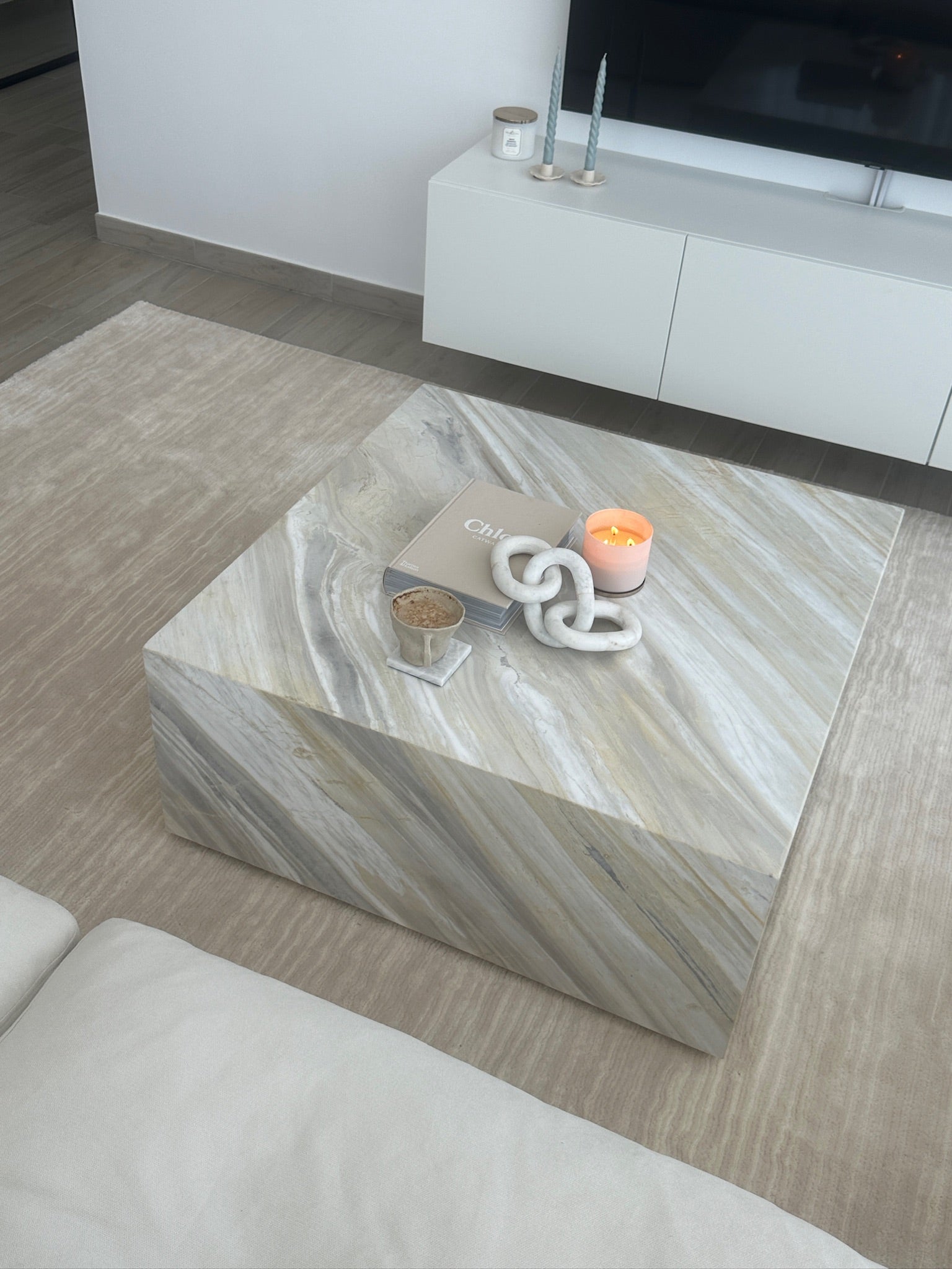 The Molly Ajax Gold accented by rich golden tones and intricate veining. Each marble block is unique, ensuring that your coffee table is a one-of-a-kind masterpiece. It features a simple yet striking block design with clean lines and a solid form that creates a bold statement, making it a versatile piece that complements both contemporary and traditional interiors.