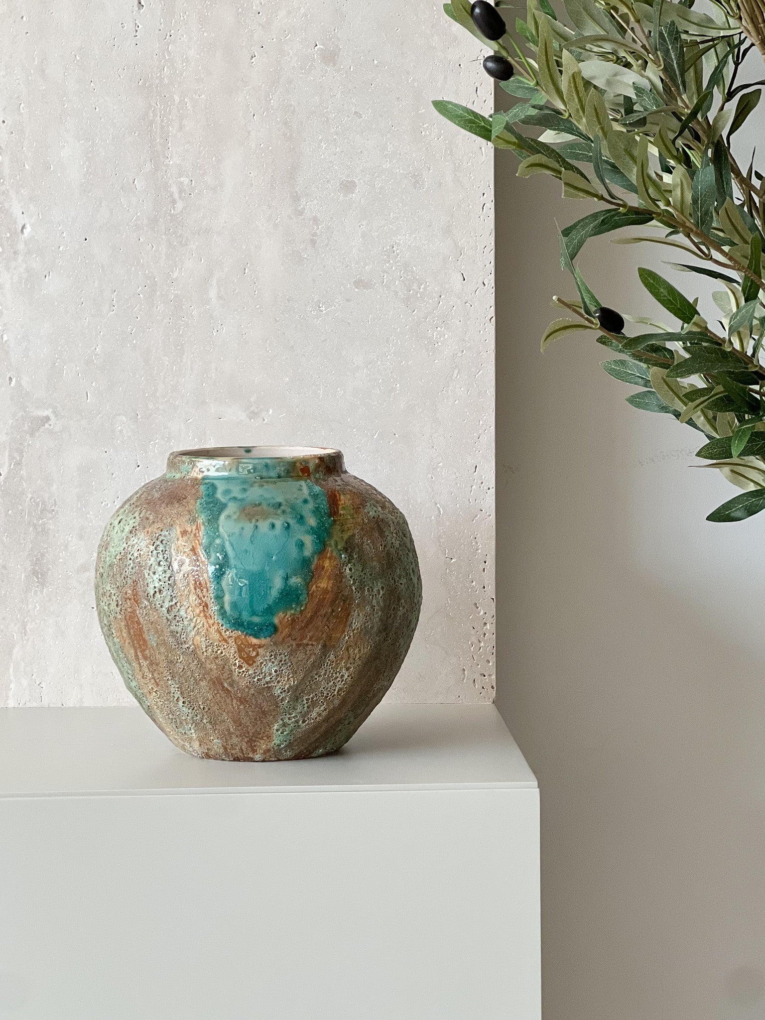 Introduce a touch of organic artistry to your space with this exquisite handcrafted ceramic vase. Inspired by the raw beauty of nature, this piece features an earthy, textured base that seamlessly transitions into a stunning glossy turquoise glaze. The interplay of rich browns, muted greens, and deep blues creates a truly unique finish, ensuring that no two pieces are exactly alike.