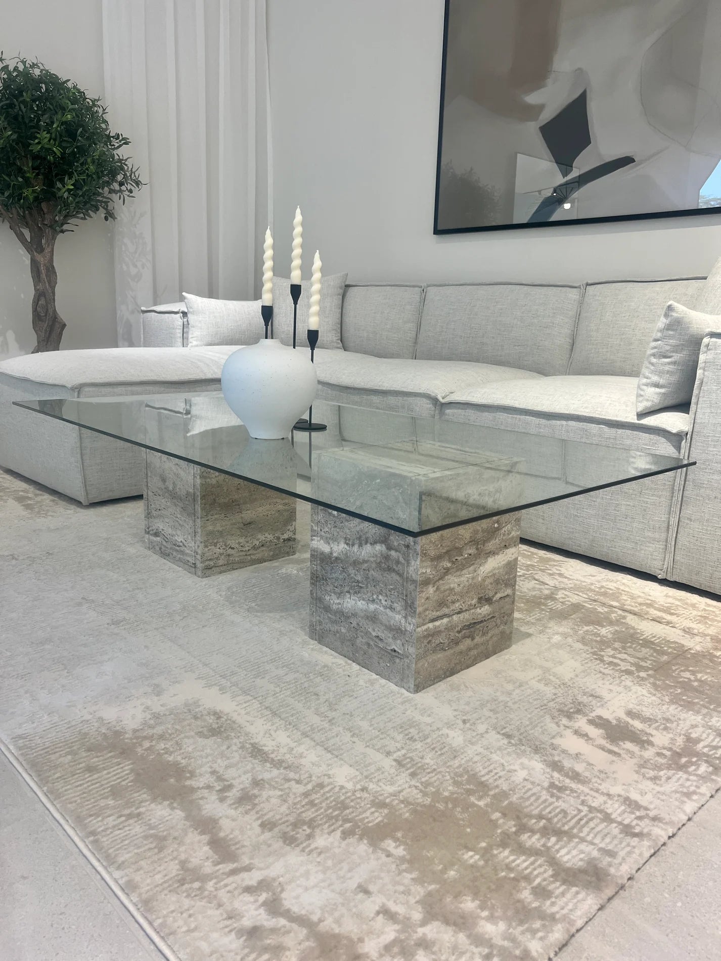 Gorgeous Travertine & Glass Coffee Table. This is a beautiful hand crafted, unique marble and glass statement coffee table with a modern, contemporary feel.