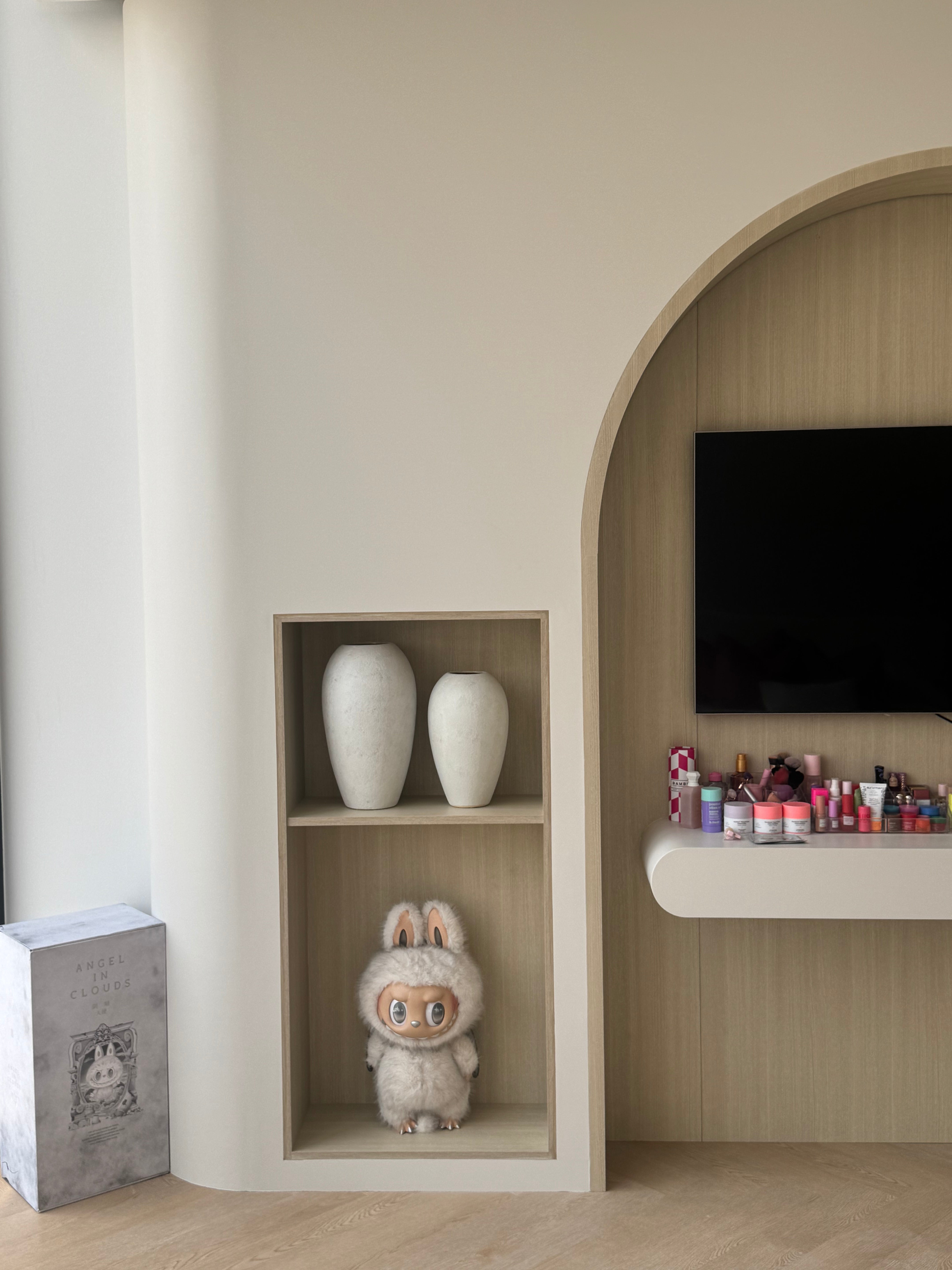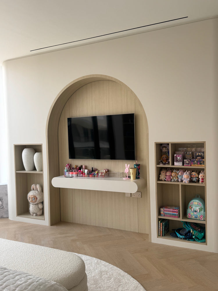 Thoughtfully designed shelving offers both open display and hidden storage, allowing you to showcase personal accents while maintaining an uncluttered aesthetic. The recessed lighting subtly highlights textures and adds depth, turning your media space into a sophisticated focal point.