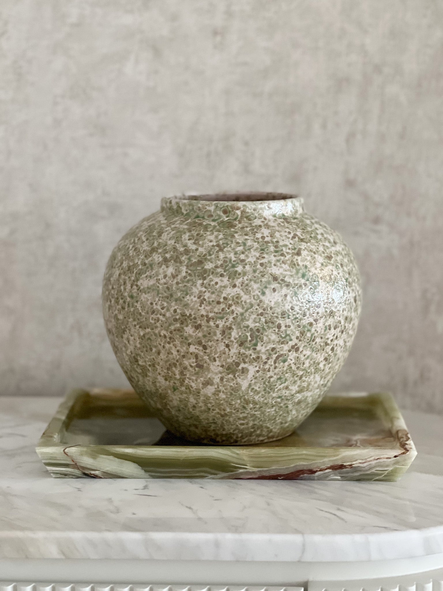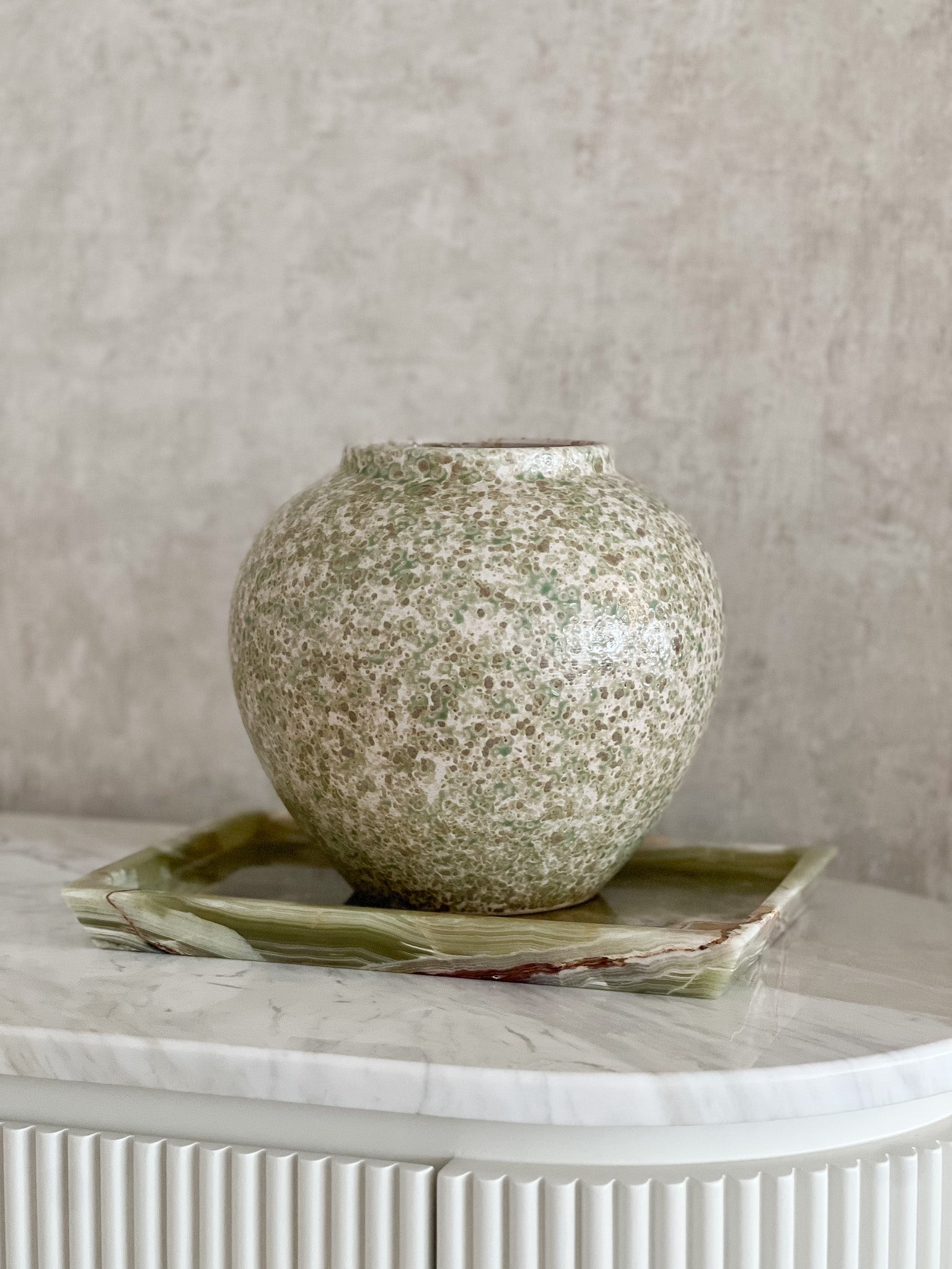 Bring timeless elegance to your space with our smaller, rounded vase, featuring a harmonious blend of green, white, and light brown tones. Its delicate texture and compact design make it the perfect accent piece for any room. Thoughtfully crafted to complement modern interiors, this vase adds a touch of refined sophistication and natural beauty, effortlessly enhancing your décor with understated charm.
